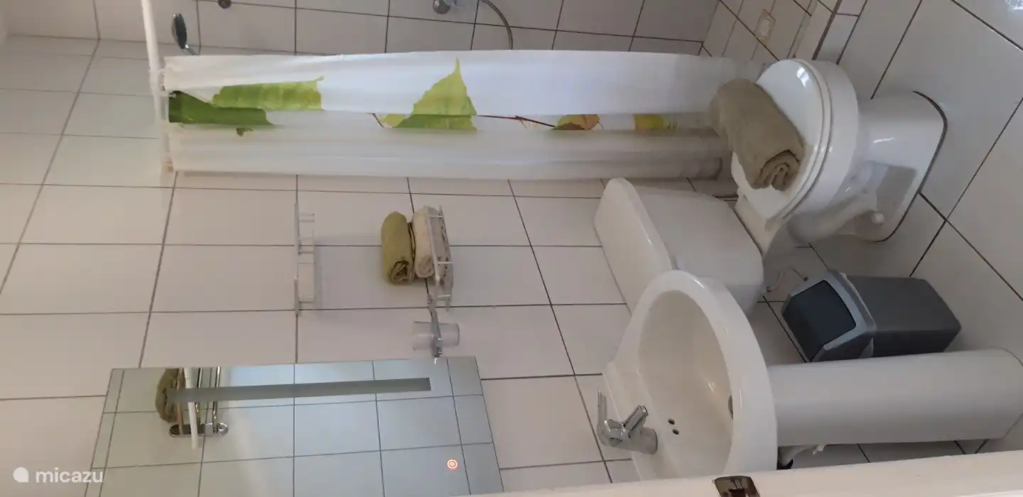 A bathroom with shower with hot water and toilet. There are 2 bedrooms and these are equipped with low noise air conditioners and fans.