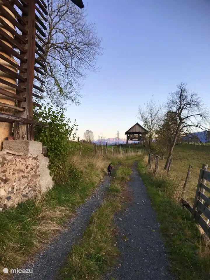 The house stands on 7,800 m2 of private land. Throughout the year there are both sun and shade spots in the garden. In the center is the beautiful large lime tree (Tilia). The garden also has several fruit trees. From the upper part of the garden you have a breathtaking view with 365 degree views over the beautiful Gailtal, the Julian Alps, Slovenia and Italy. Watching the sunset from the rocking chair in the evening or starting the day there, that's really enjoyable. You can always use the garden; To drink coffee, eat at the picnic table, sunbathe in one of the sun loungers or play football or badminton outside. Plenty of space! There are toys available outside for the children. The large above-ground swimming pool is also free to use for all guests.