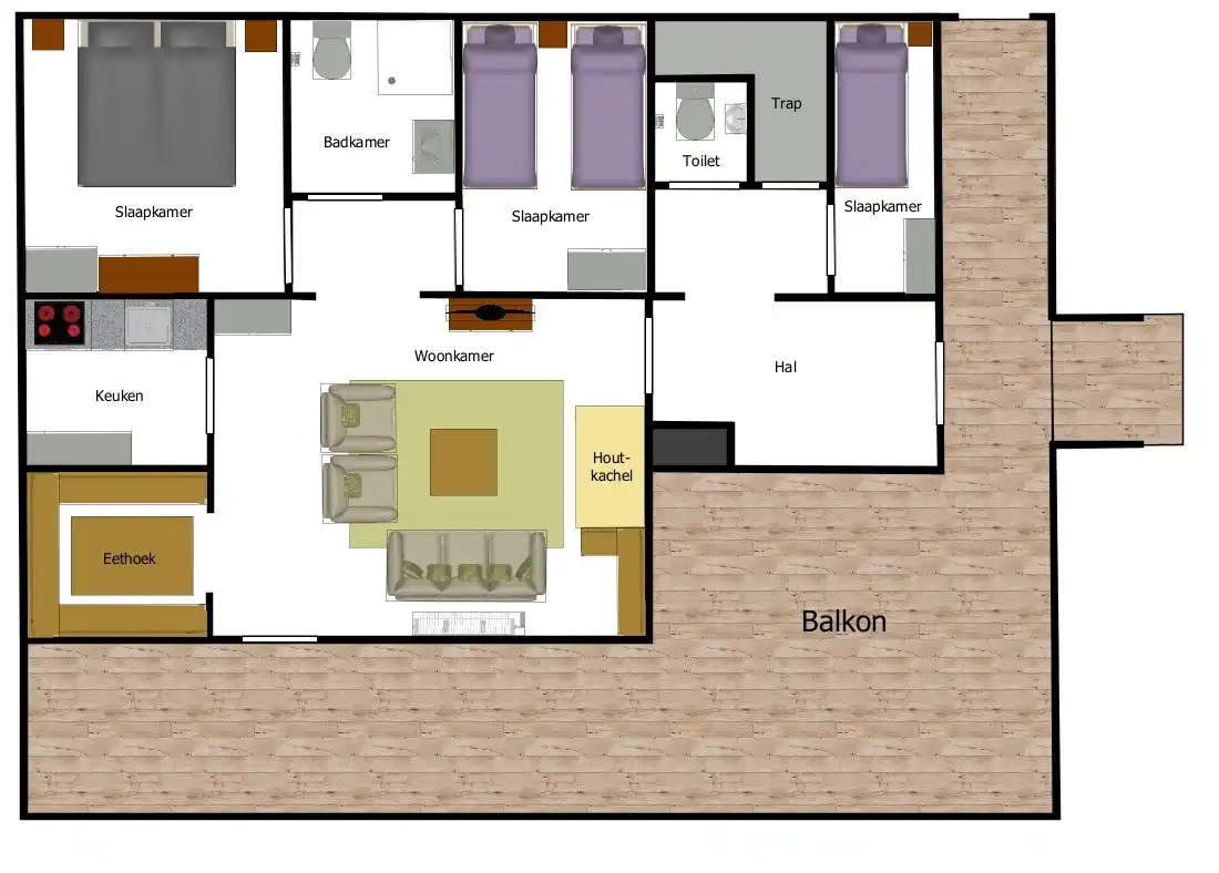 The upper floor is suitable for 7 people (max. 5 adults and 2 children (0-15 years).