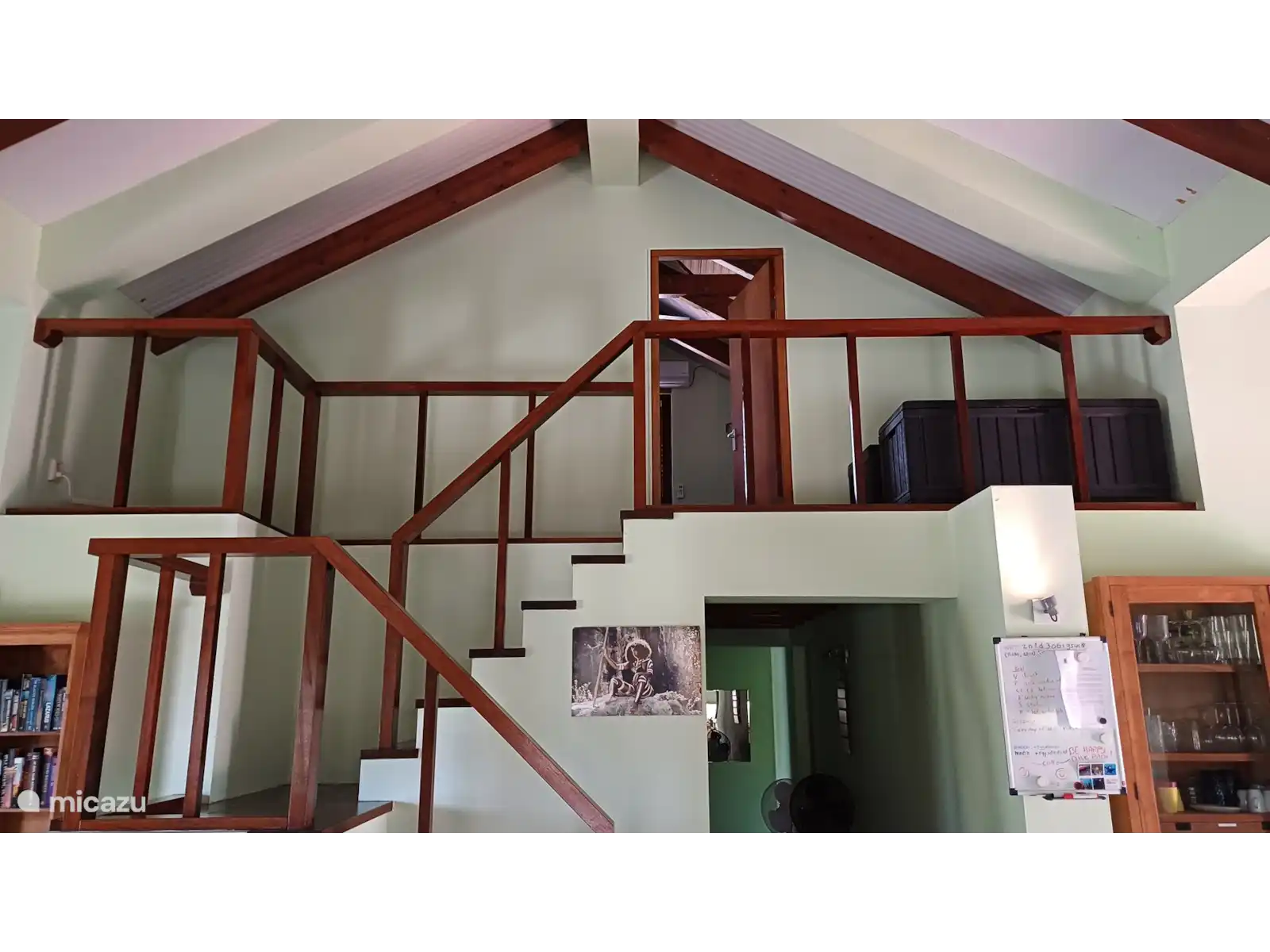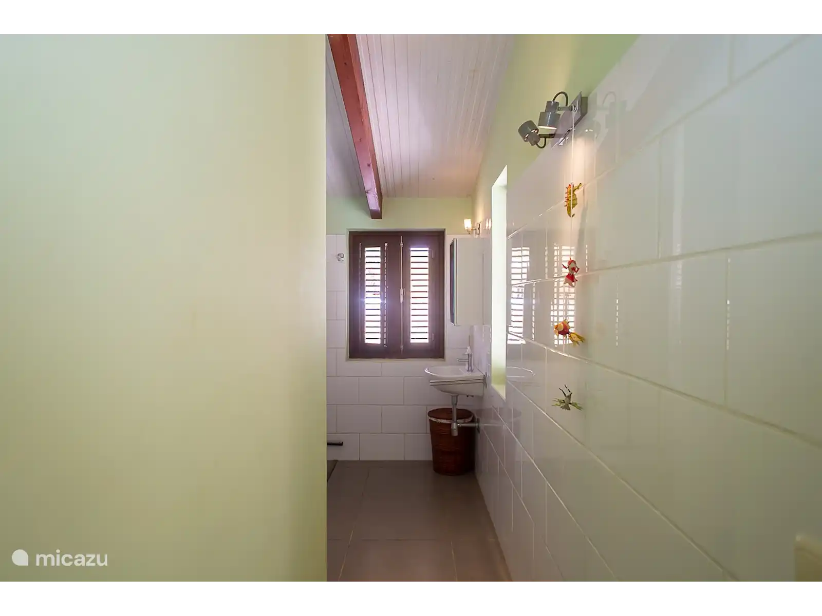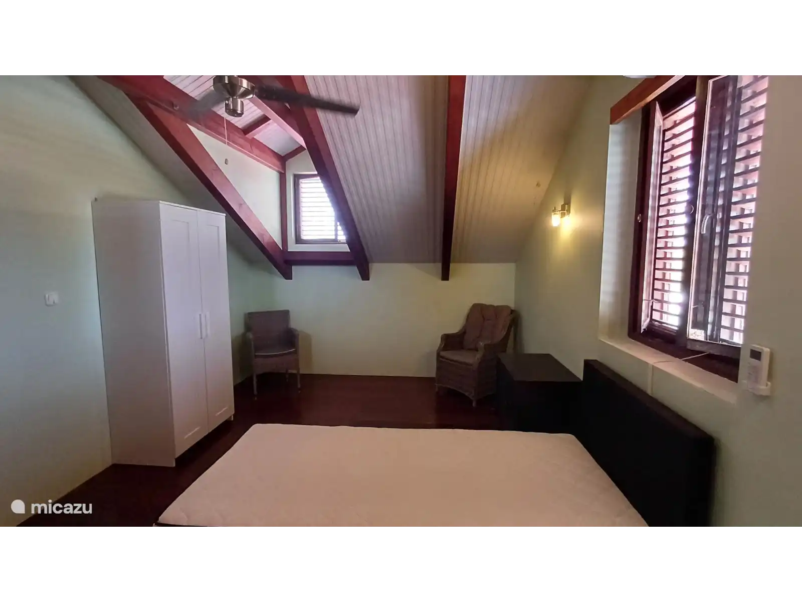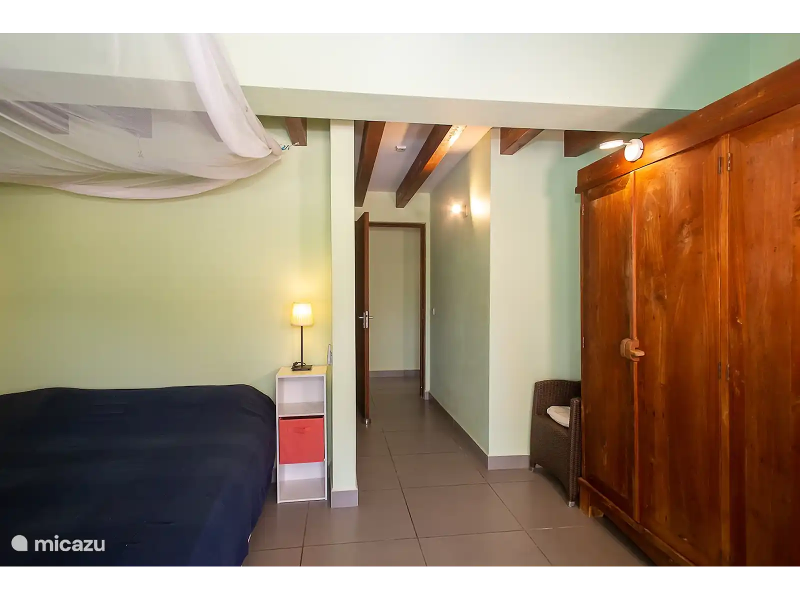 Bedrooms: Three bedrooms with comfortable beds. 2 bedrooms are accessible from the outside and a hallway, the third bedroom is located on the mezzanine. There is room for a possible cot. All bedrooms are also equipped with air conditioning and mosquito nets (box size) The bedrooms on the ground floor have en suite modern walk-in bathrooms with shower and toilet. There is a large barbeque, washing machine, a separate guest toilet and the possibility of storing diving equipment. Large stock of sheets, (bath) towels, etc. The entire house has mahogany doors with shutters. The ground floor main house can also be reached by car for the disabled if desired.