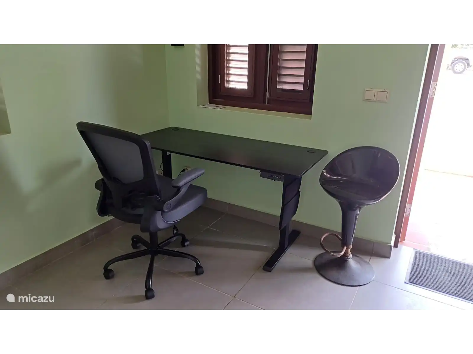 A detached studio with a large double bed, kitchen, air conditioning, seating areas and a modern walk-in bathroom with shower and toilet. Space for a cot. The studio has a height-adjustable desk and a fixed internet connection (workplace).