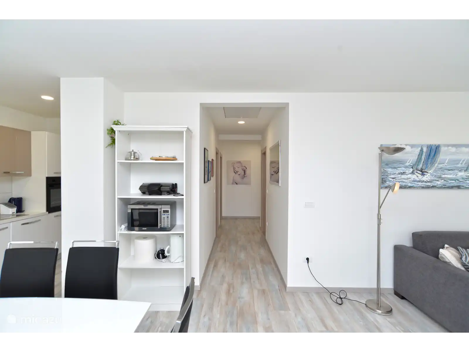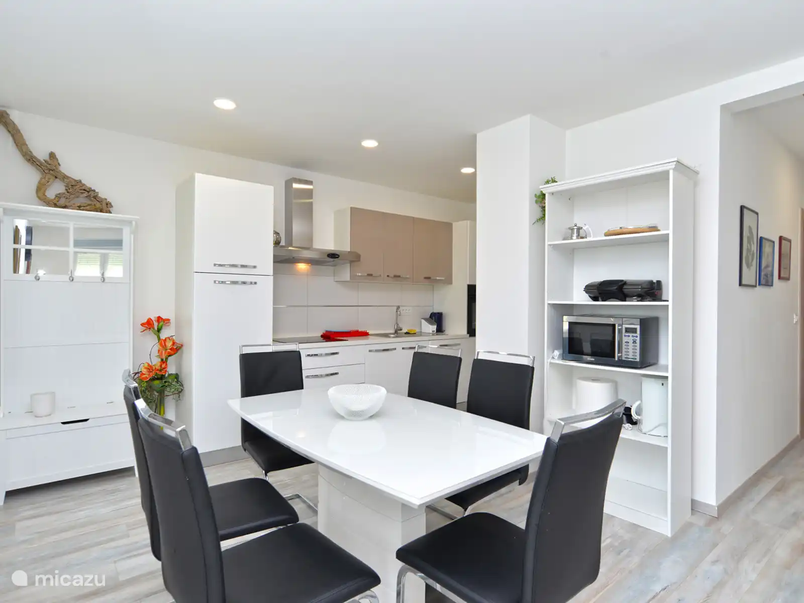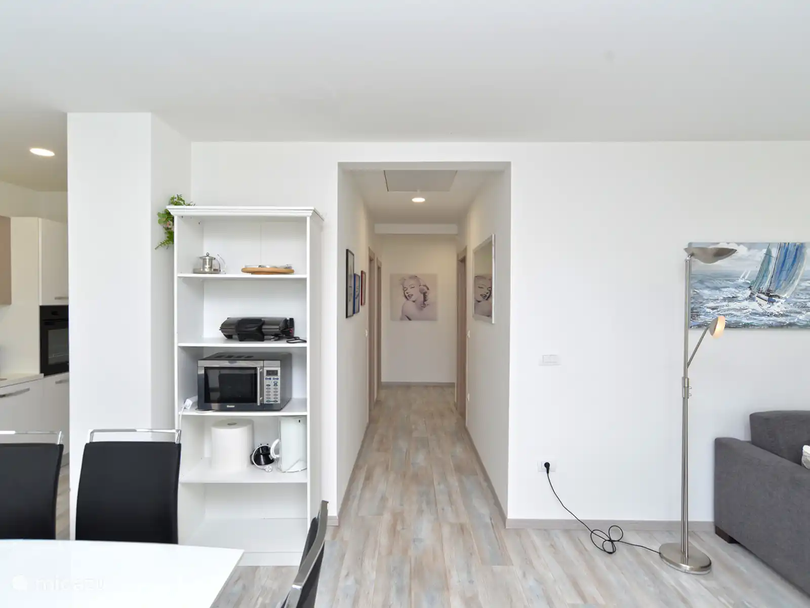 A full kitchen includes a microwave oven, a fridge, and kitchenware.