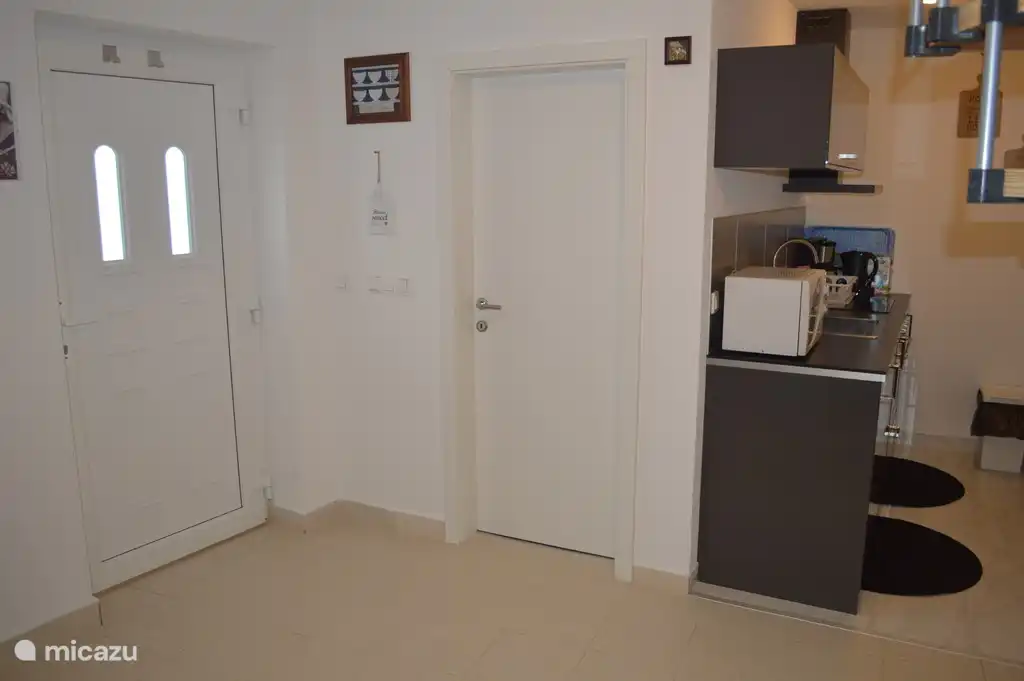 - Kitchen: refrigerator with a freezer compartment, coffee maker, kettle, oven, induction hob, microwave