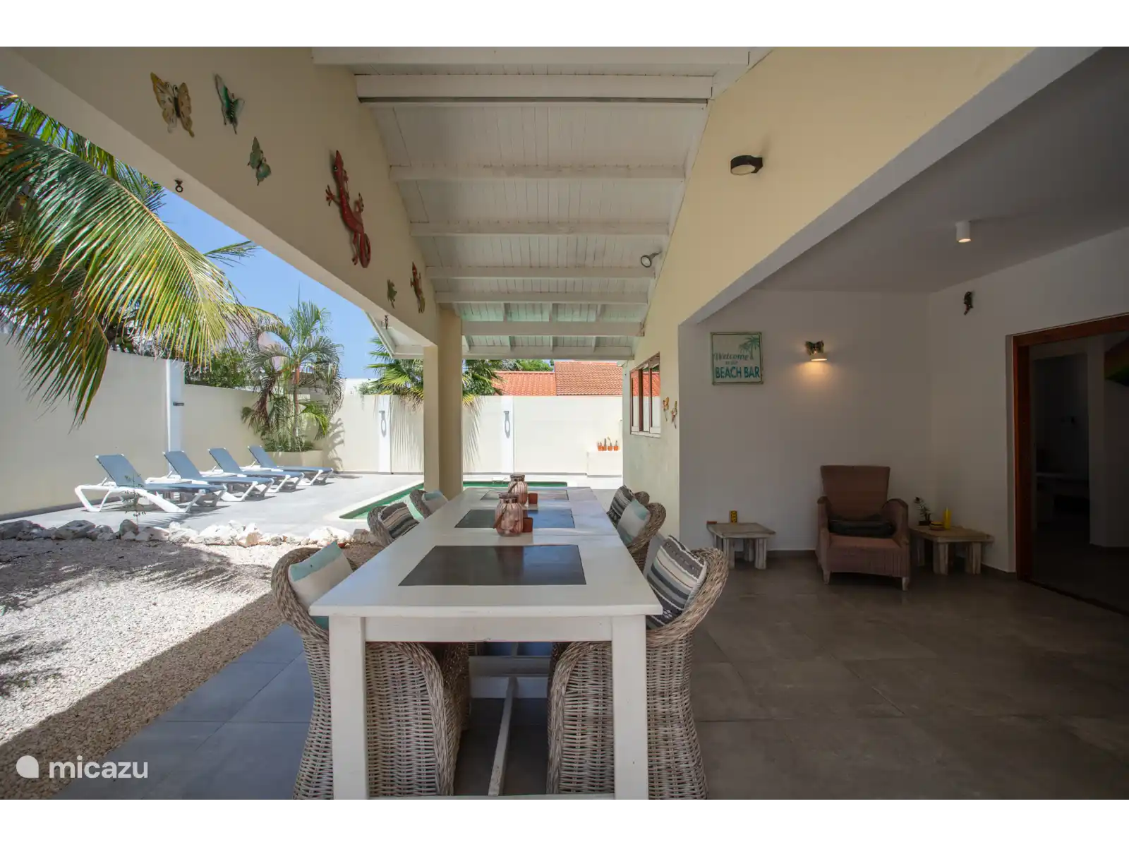From the living room to the large porch with the pool and garden. Here you have a lot of space around the pool. The porch always has shade. At the pool there are sunbeds and lazy chairs and you can take a seat with six people at the table on the porch. Of course, a BBQ is not missing.