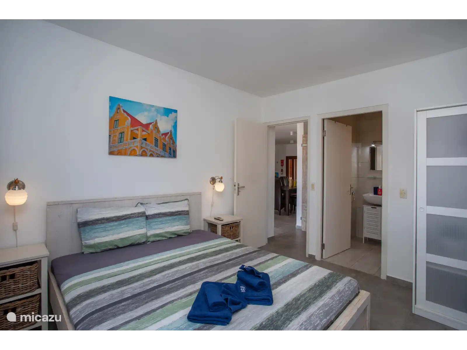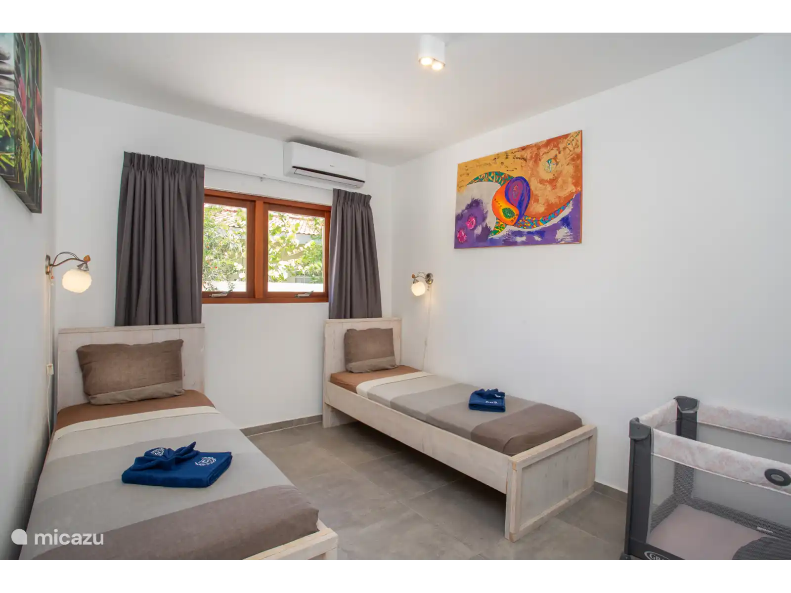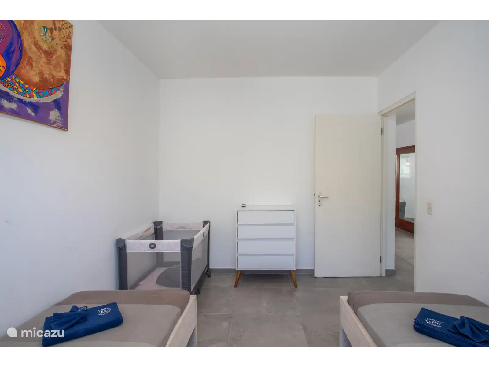 From the living room you have access to the three bedrooms. All bedrooms have air conditioning. The master bedroom has an en-suite bathroom. Two bedrooms are equipped with a double bed and two single beds have been placed in the third bedroom. This room also contains an extra cot. High chair is available.