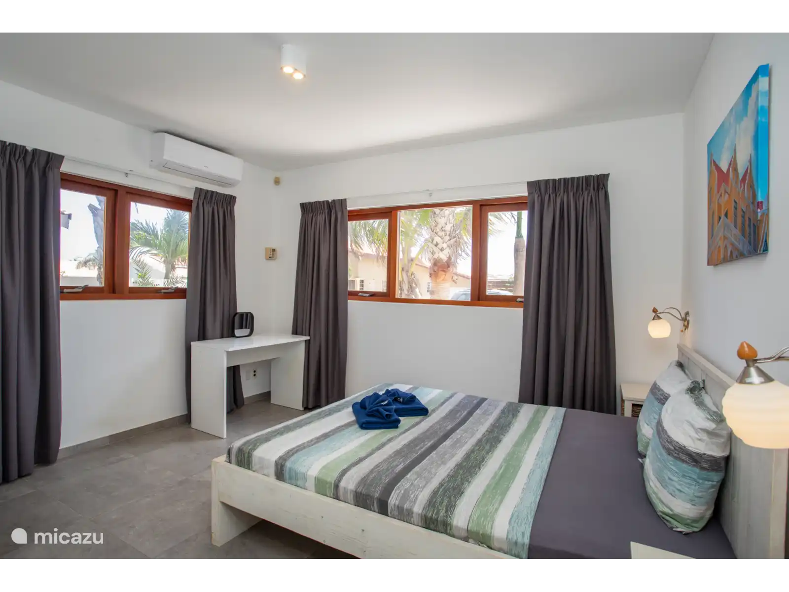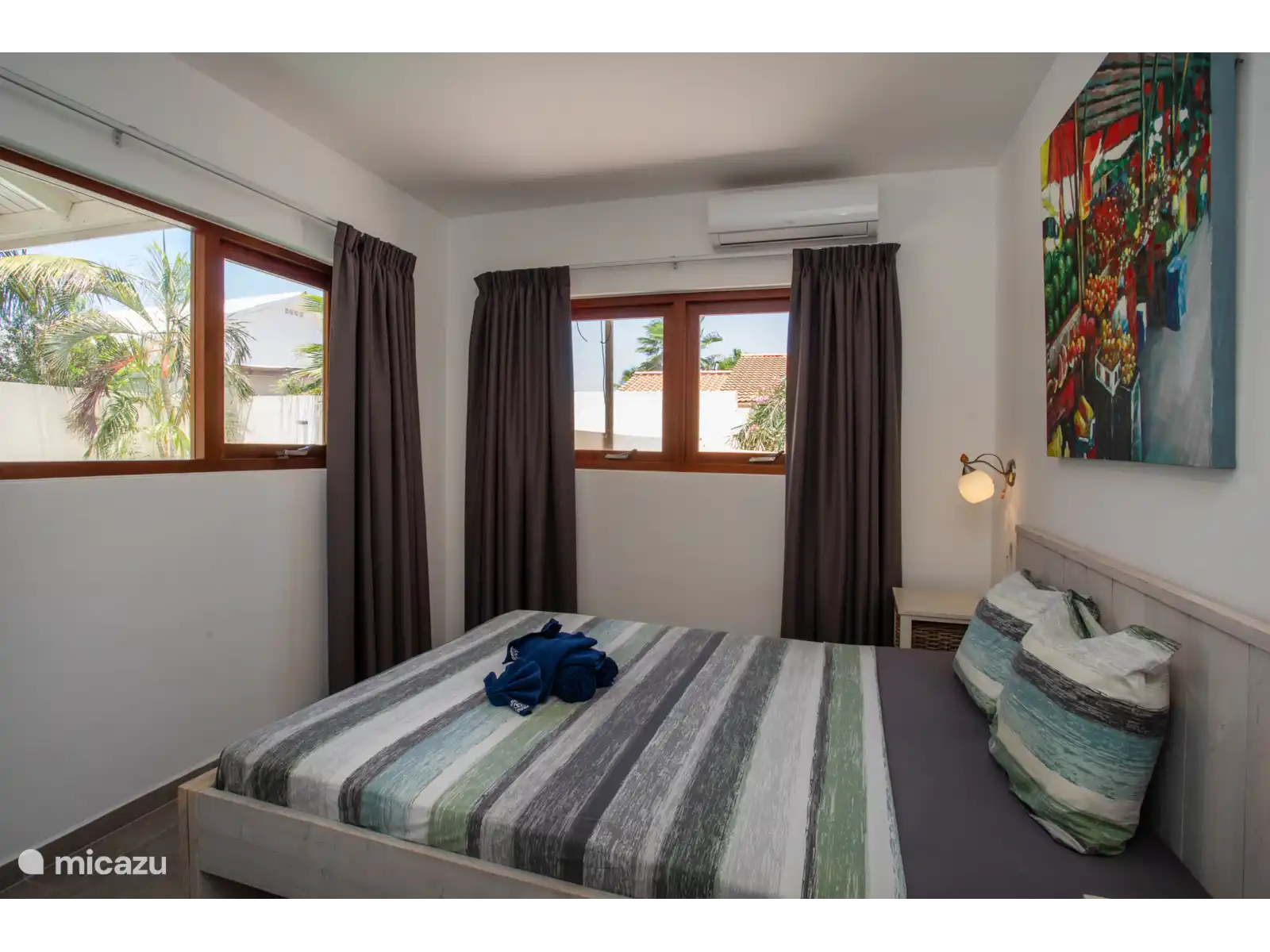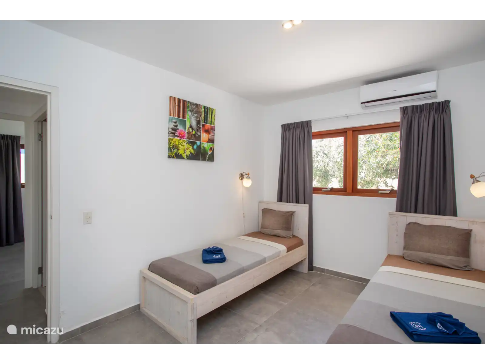 From the living room you have access to the three bedrooms. All bedrooms have air conditioning. The master bedroom has an en-suite bathroom. Two bedrooms are equipped with a double bed and two single beds have been placed in the third bedroom. This room also contains an extra cot. High chair is available.