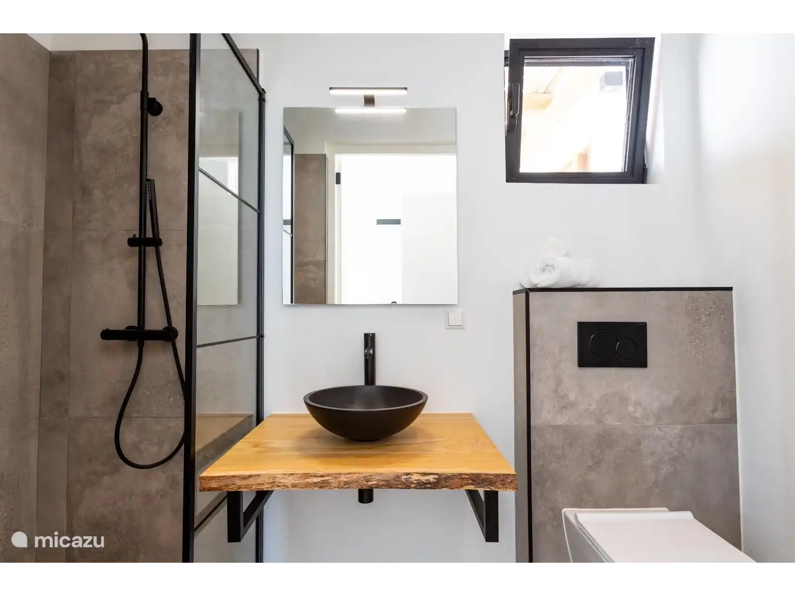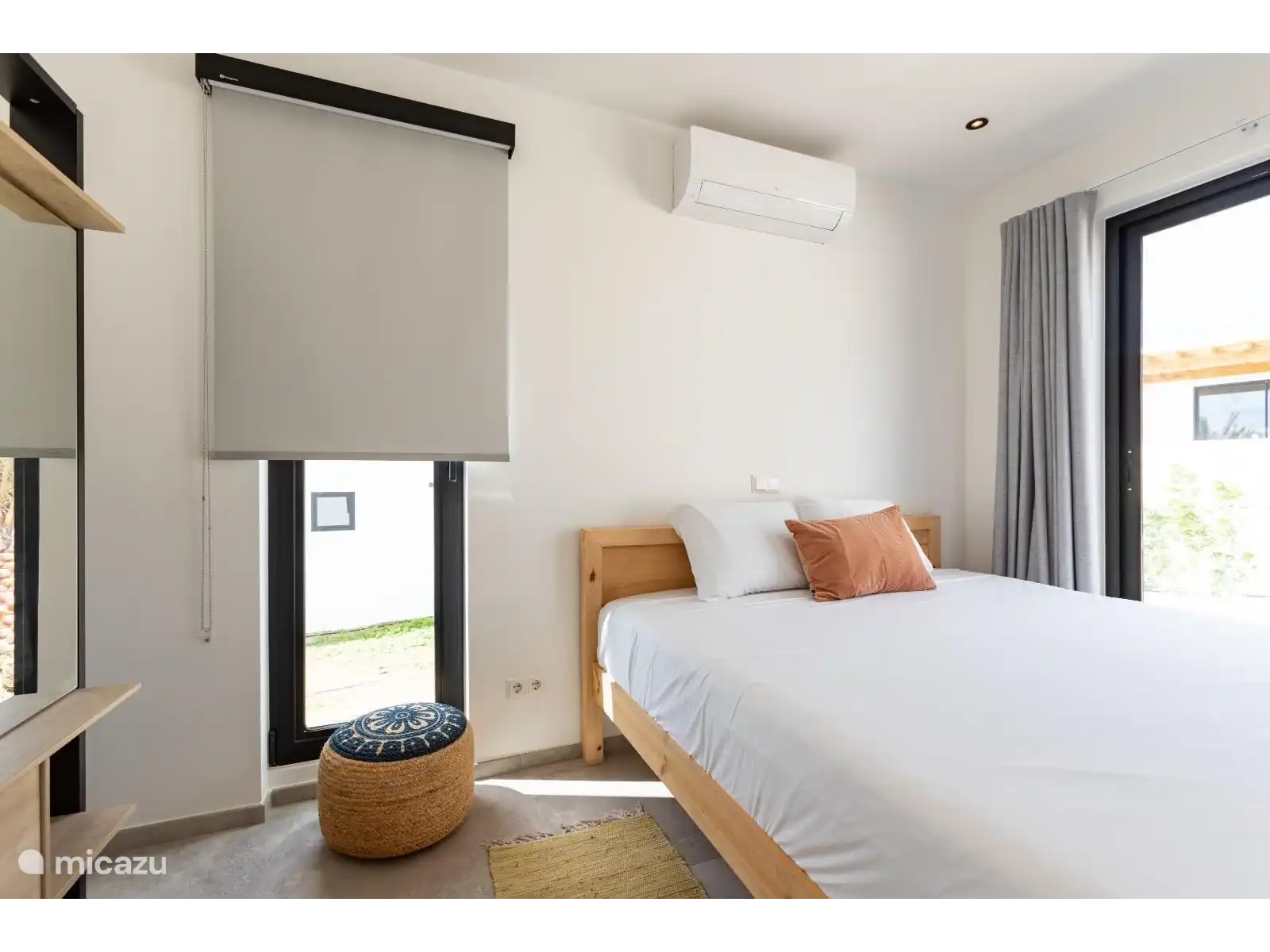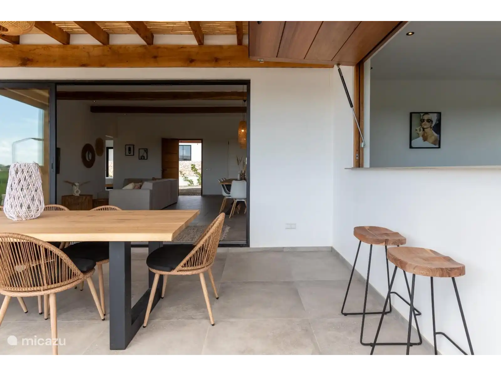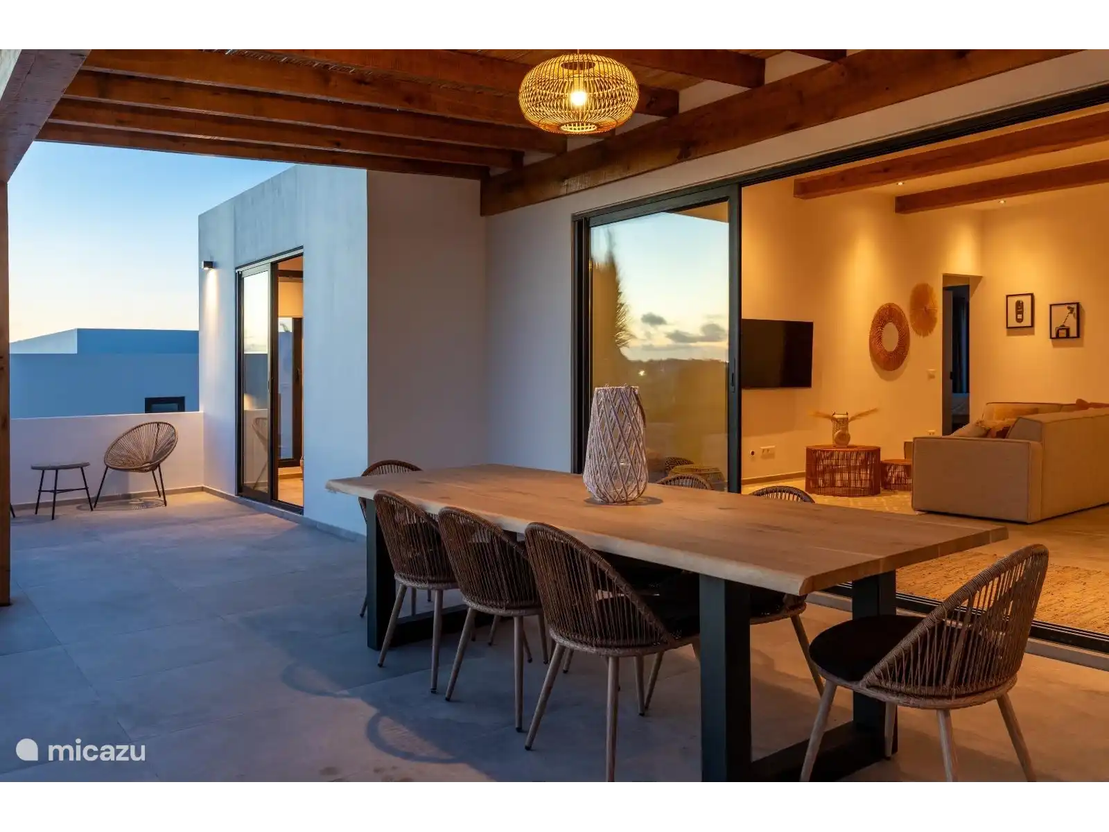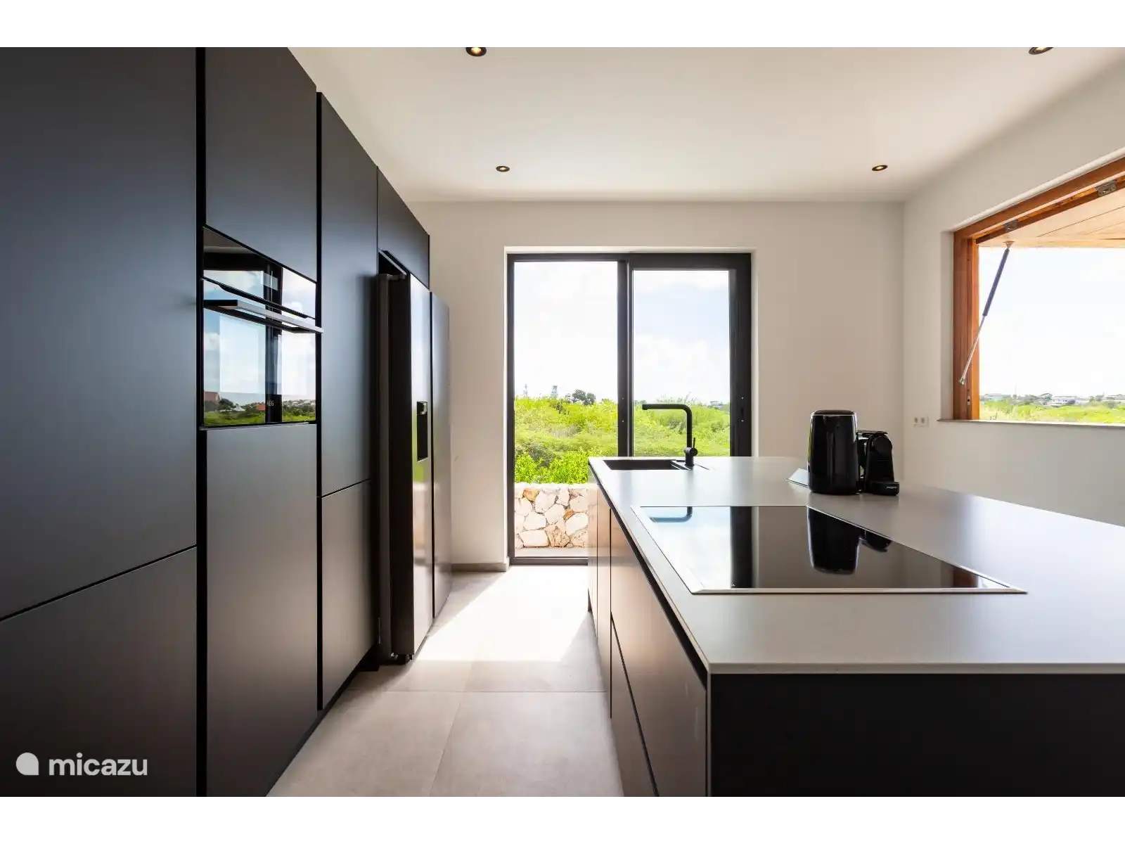 The spacious living and dining area is furnished with luxurious Ibiza-look designer furniture and a large dining table. Enjoy entertainment on the 55" LED TV with Apple TV. The living room flows seamlessly into the open European kitchen, which is fully equipped with modern appliances, including an American fridge, oven, dishwasher and an induction hob on the large kitchen island.