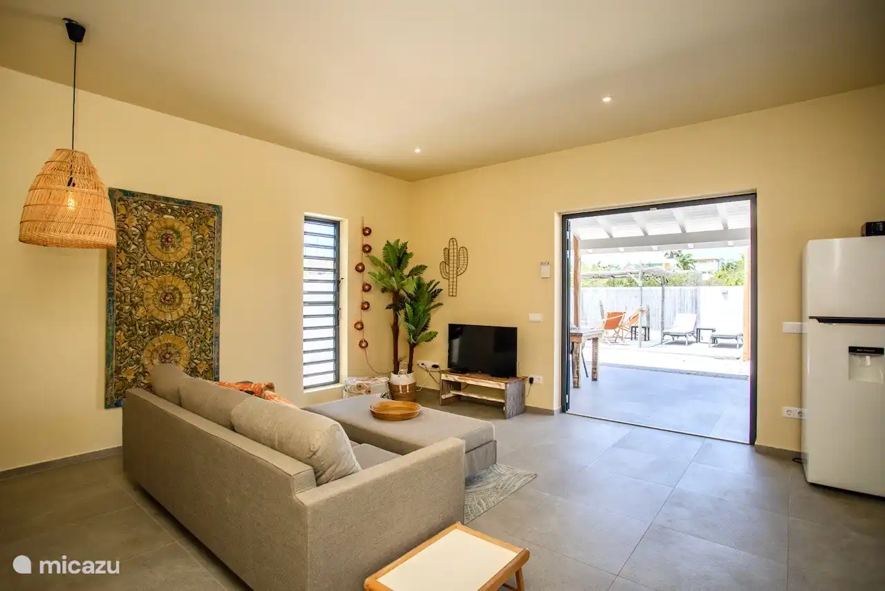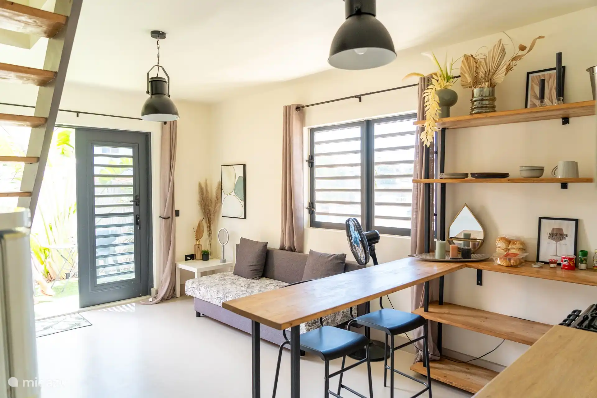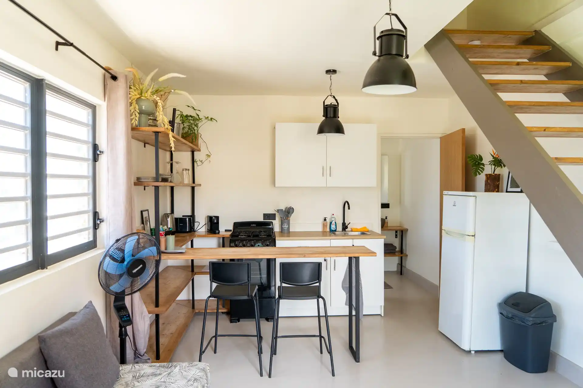 - Living room and kitchen. On the ground floor you have a living room with fan and a small kitchen with Nespresso machine, toaster, kettle, stove and oven.