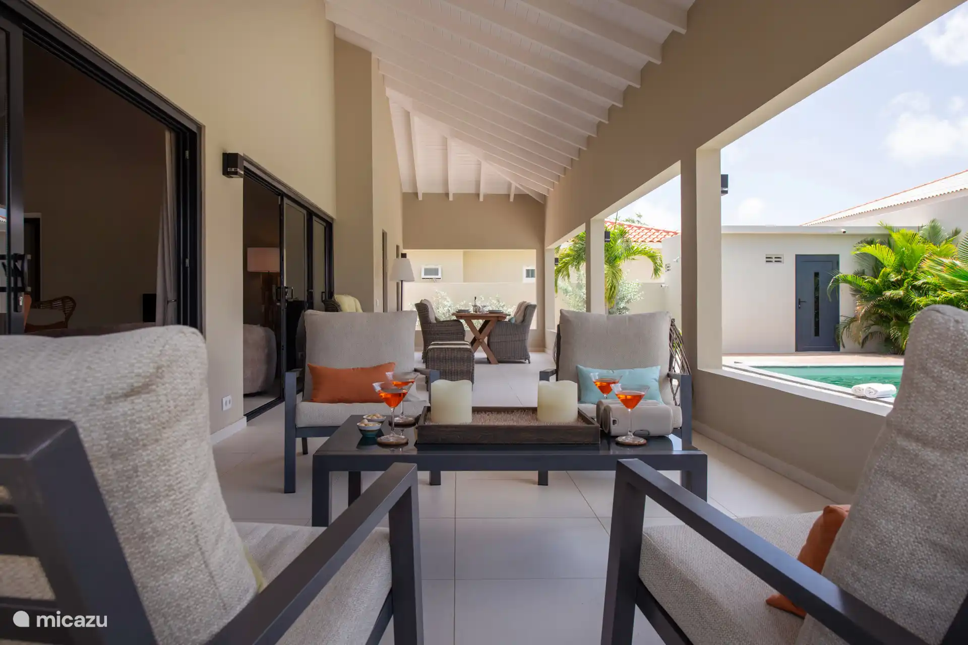 Through the patio doors you enter the living room directly onto the covered porch, where you can enjoy the lounge chairs overlooking the pool and tropical garden. There is also a table here to eat or work. There is a barbecue. In the fence (the balustrade) is a lockable gate that leads to the swimming pool. In the evening, the garden is attractively lit.