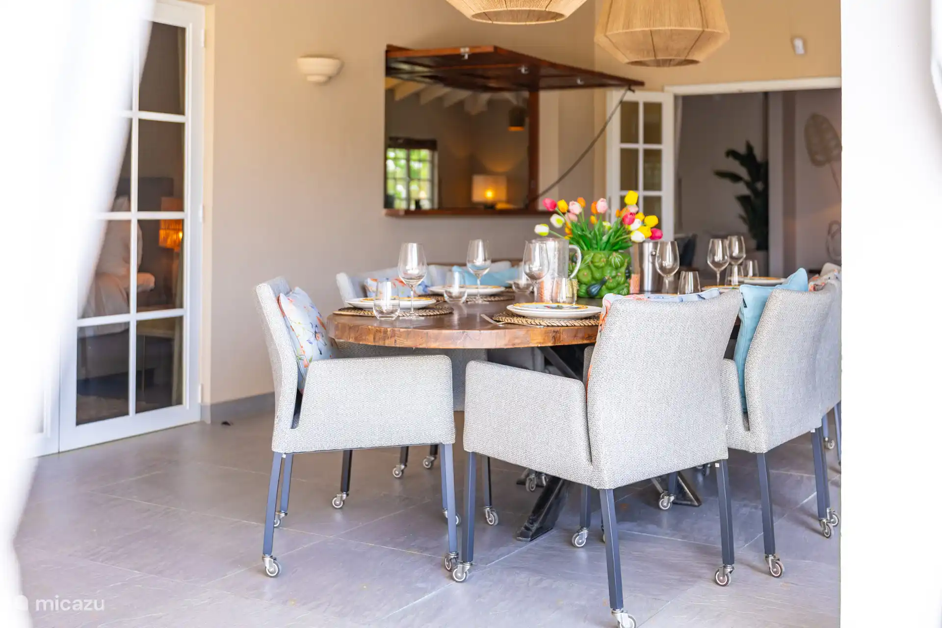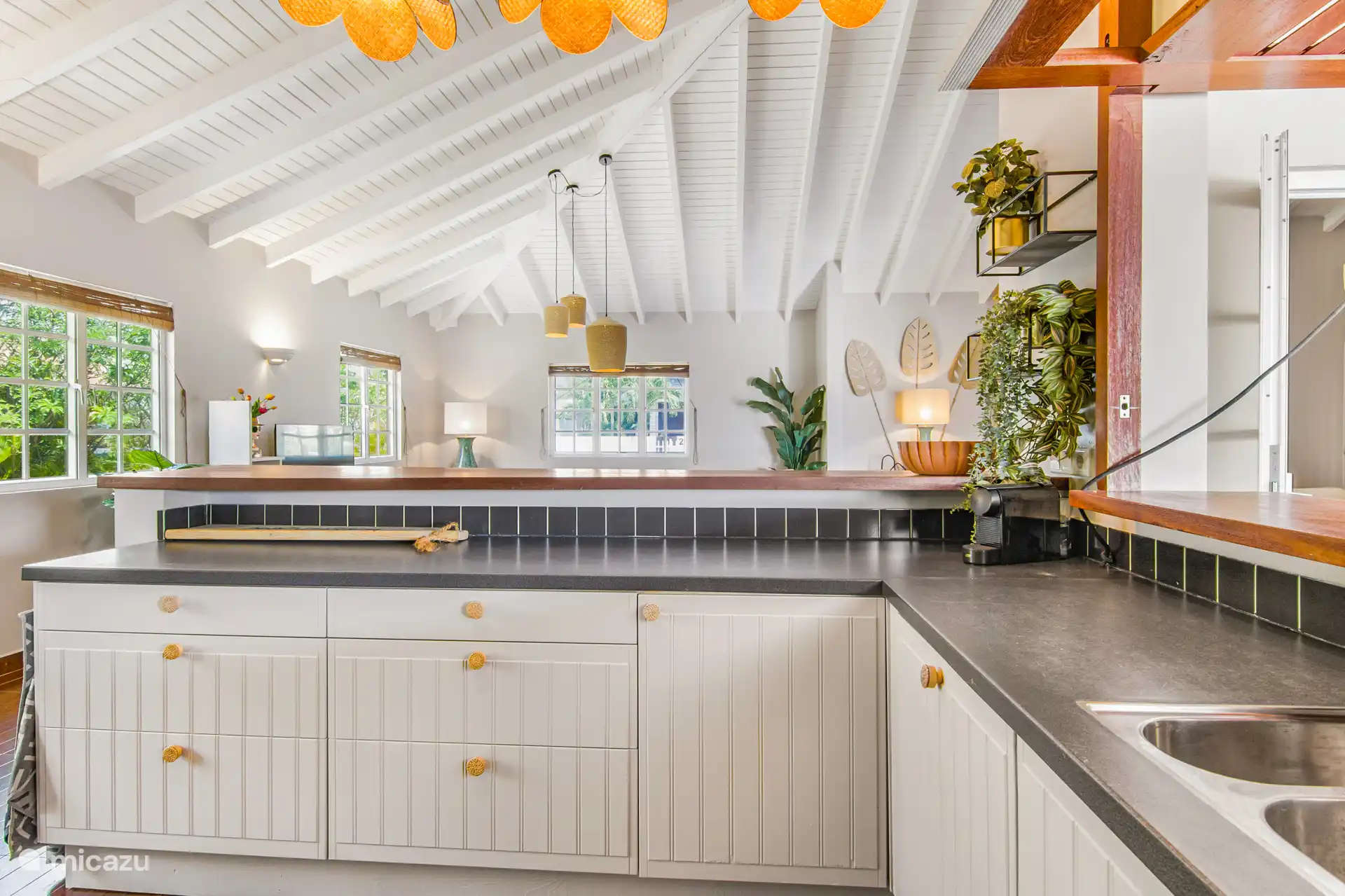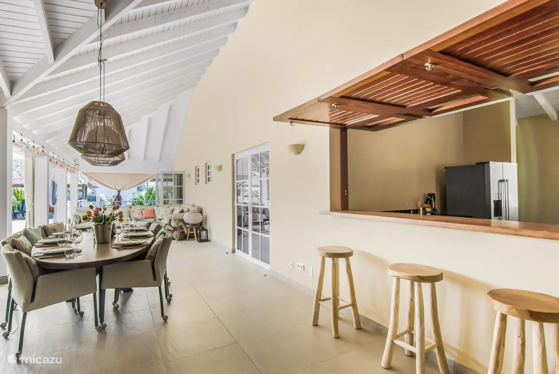 Villa Toucan Curaçao is a stunning luxury villa, located entirely on the ground floor and designed for ultimate comfort and relaxation. Upon entering, you are welcomed by patio doors that lead to a spacious porch, where you can enjoy the breathtaking views of the pool and lush tropical garden. The porch is equipped with a large table, perfect for cosy breakfast and dinner moments, and a beautiful Green Egg BBQ for culinary adventures. Relax in the comfortable lounge set or take a refreshing dip in your own private pool. Behind the pool you will find a palapa, ideal for shady moments and relaxation.