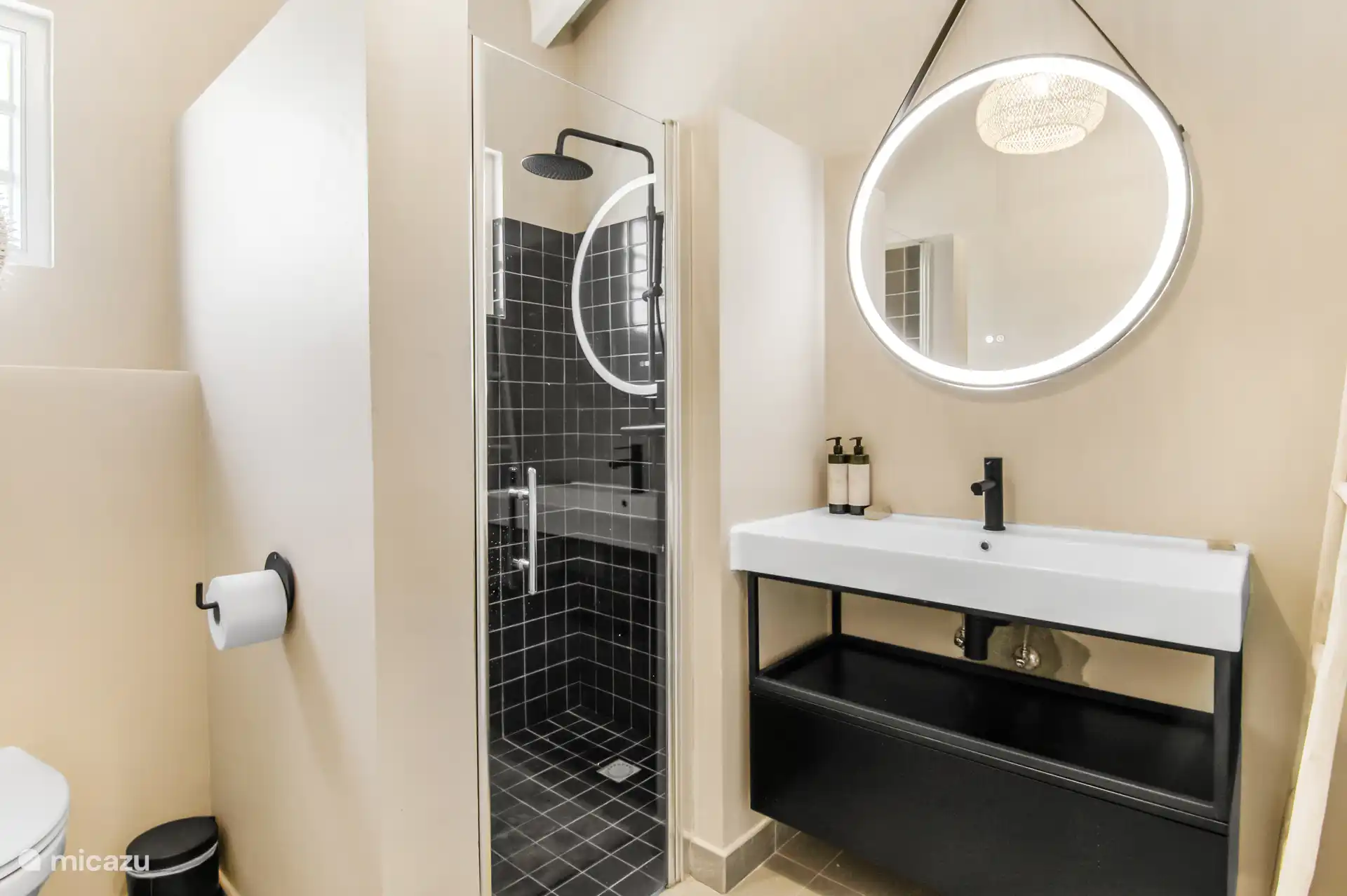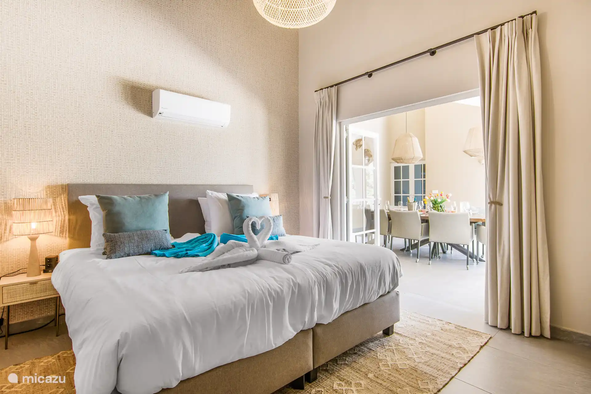 The patio doors create a seamless connection between inside and outside, giving the villa an airy and inviting atmosphere. The spacious living room with open kitchen is perfect for cozy gatherings with family and friends. The kitchen is fully equipped, including a dishwasher, fridge with freezer and a 5-burner gas stove with built-in oven. In the living area, you will find a spacious sitting area with flat screen TV and an additional dining area, as well as a separate toilet for added convenience.