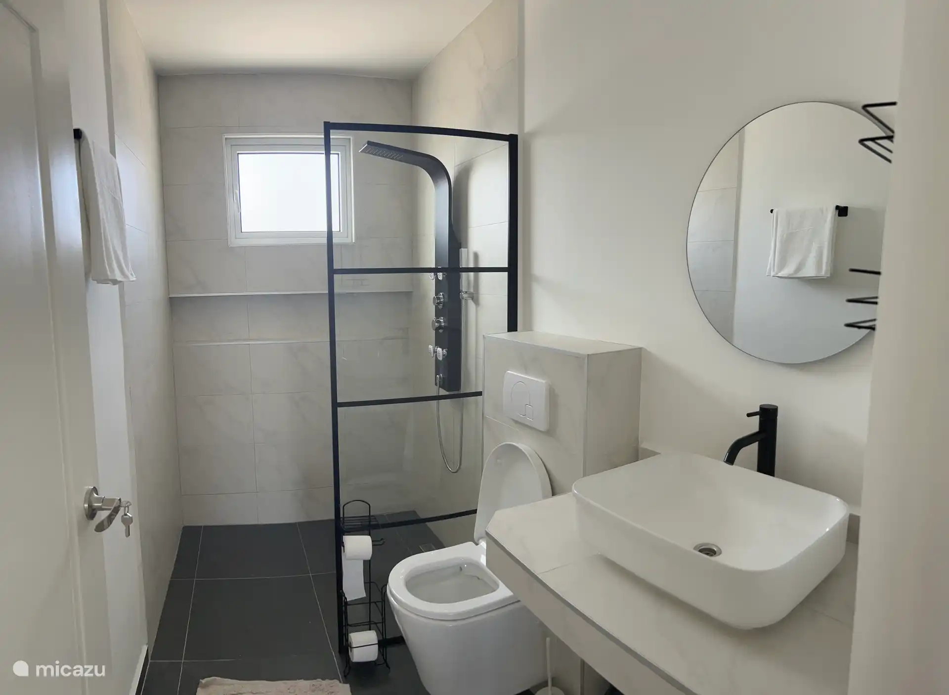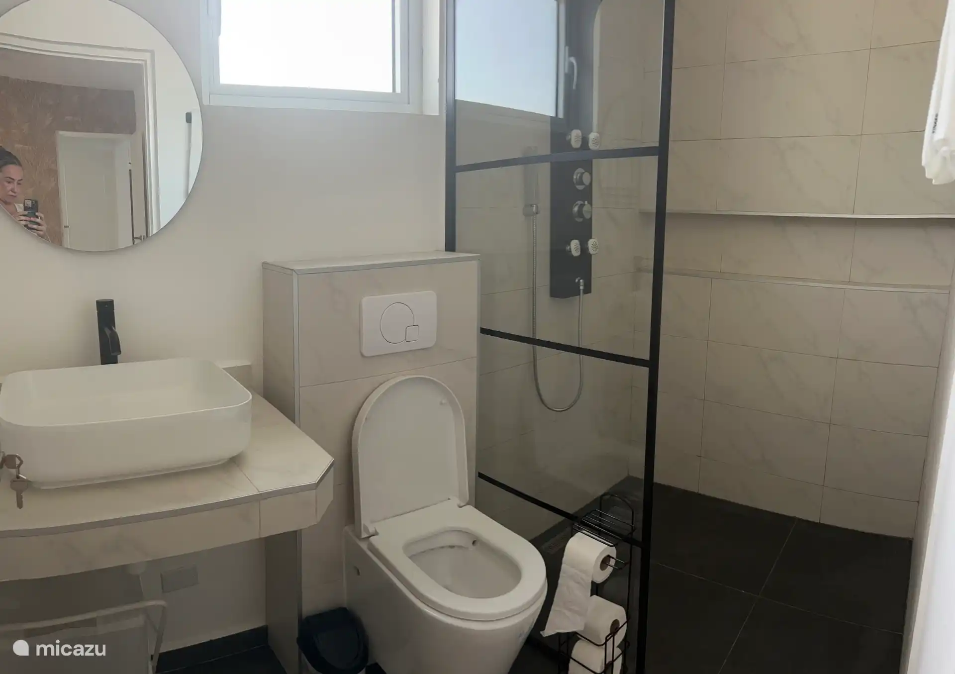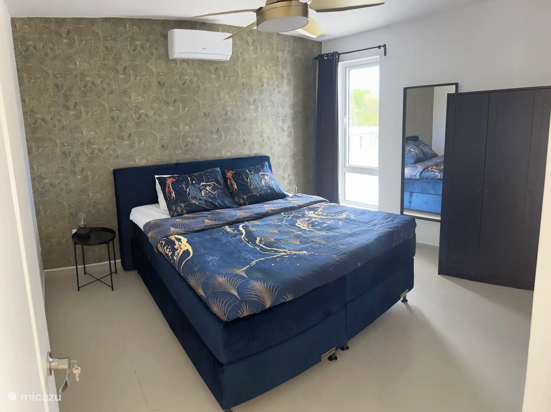 The bedroom is large and equipped with a silent air conditioning. There is a large comfortable boxspring (180 X 200), consisting of two single mattresses. The beds can be arranged separately. If desired, a cot can be added. The bedroom has a built in wardrobe with large passpiegeldeuren and an extra wardrobe. There is a hair dryer and a safe for your valuables.