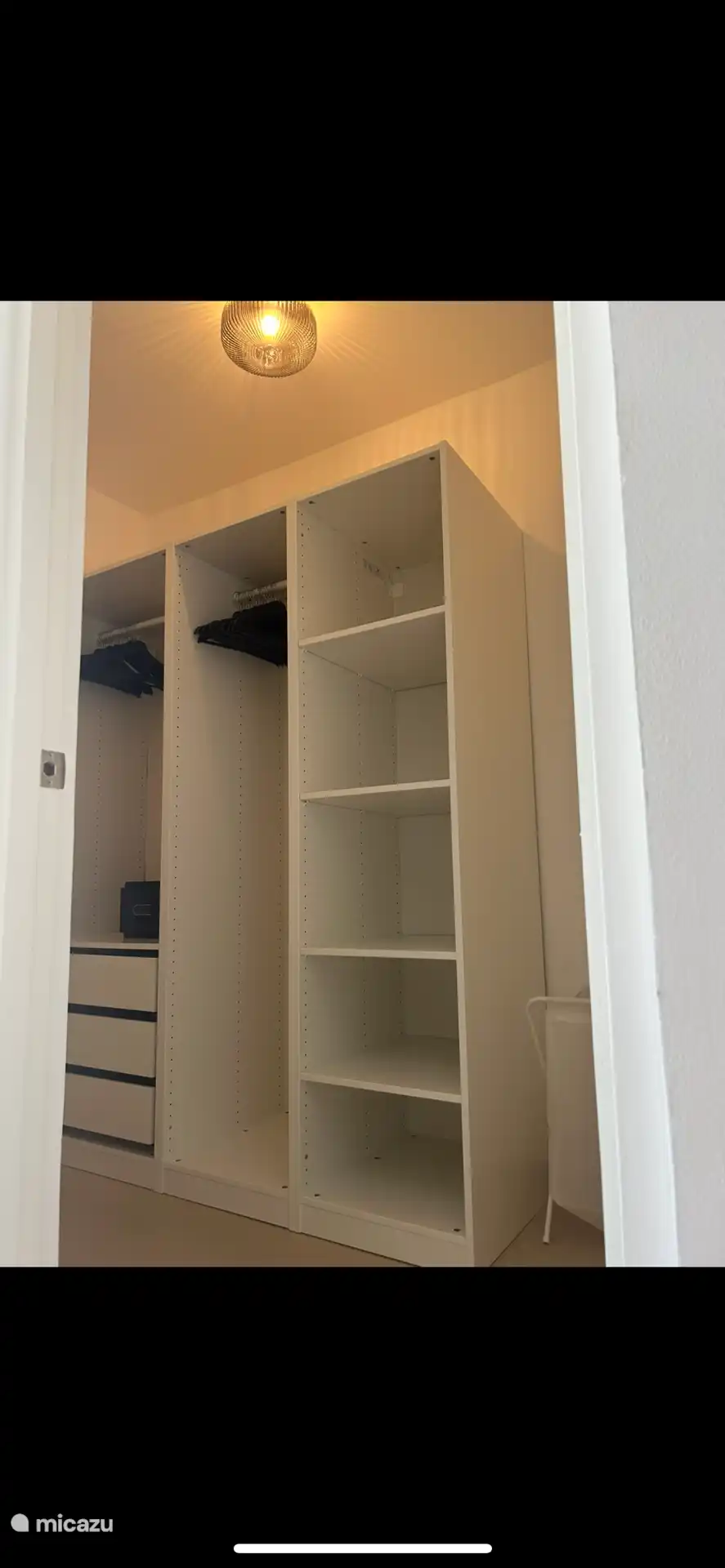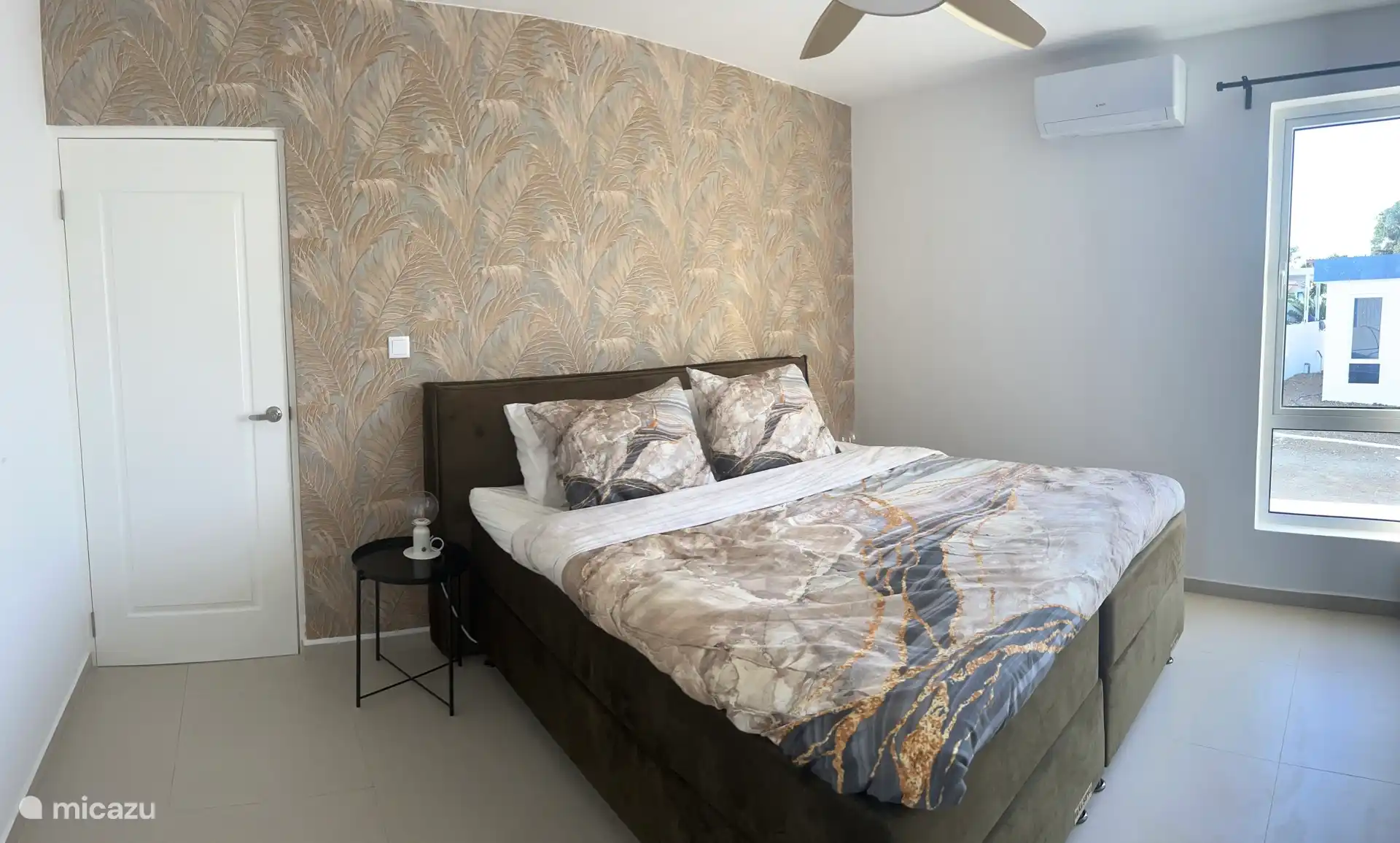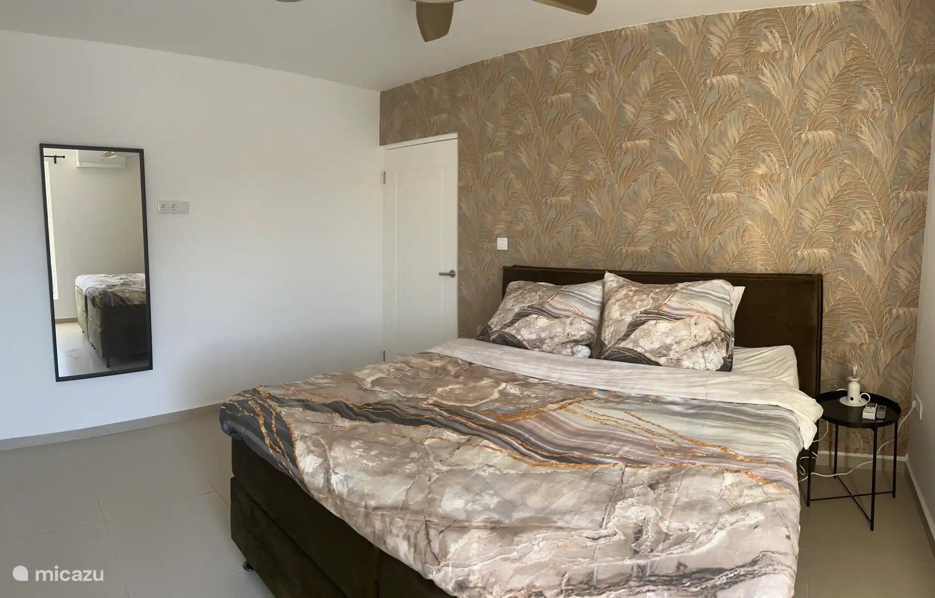 The bedroom is large and equipped with a silent air conditioning. There is a large comfortable boxspring (180 X 200), consisting of two single mattresses. The beds can be arranged separately. If desired, a cot can be added. The bedroom has a built in wardrobe with large passpiegeldeuren and an extra wardrobe. There is a hair dryer and a safe for your valuables.