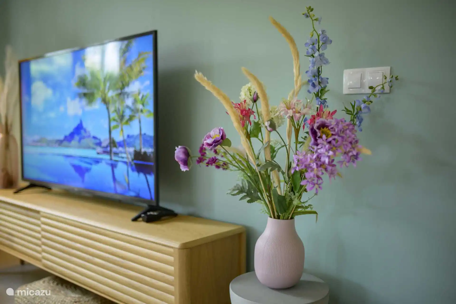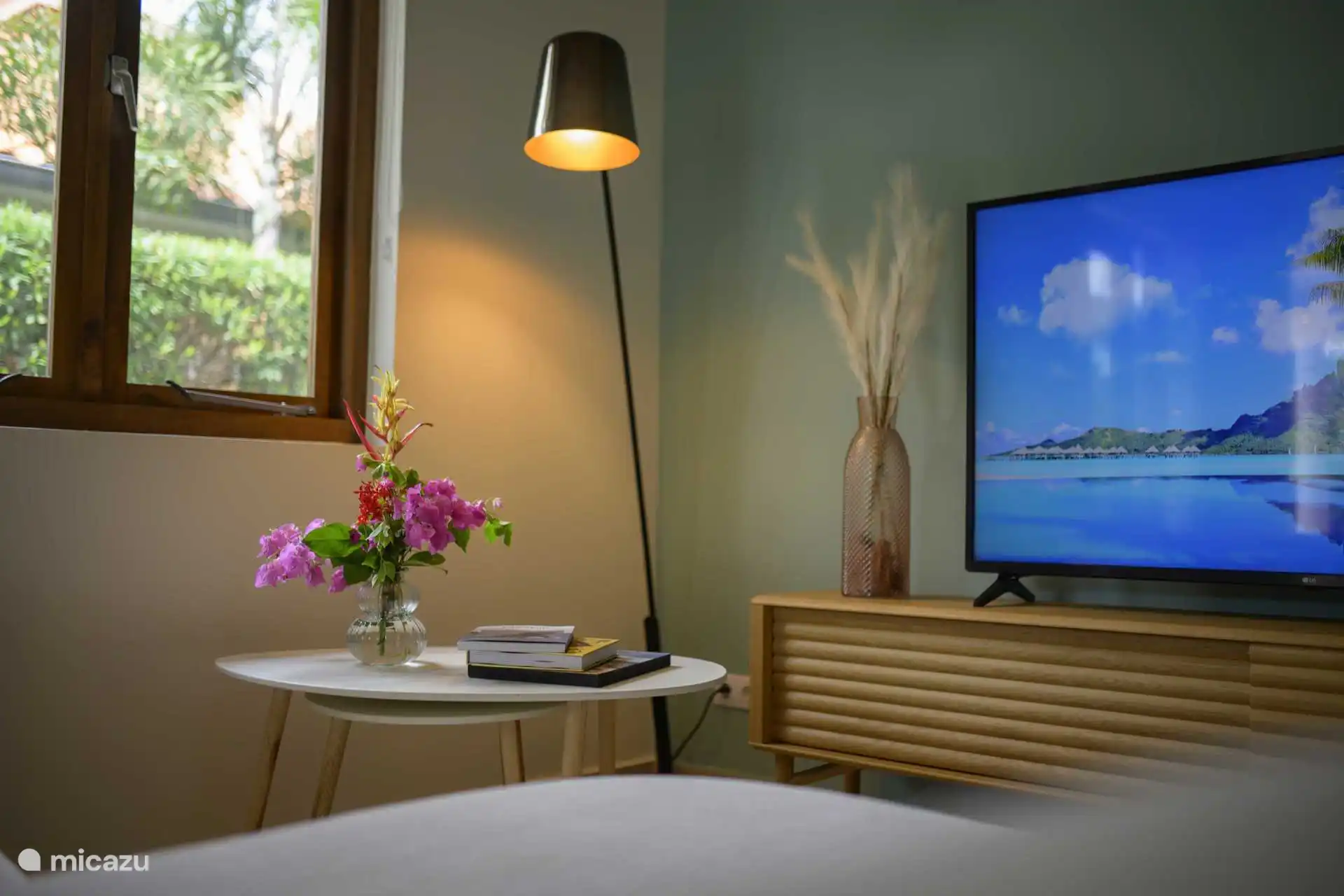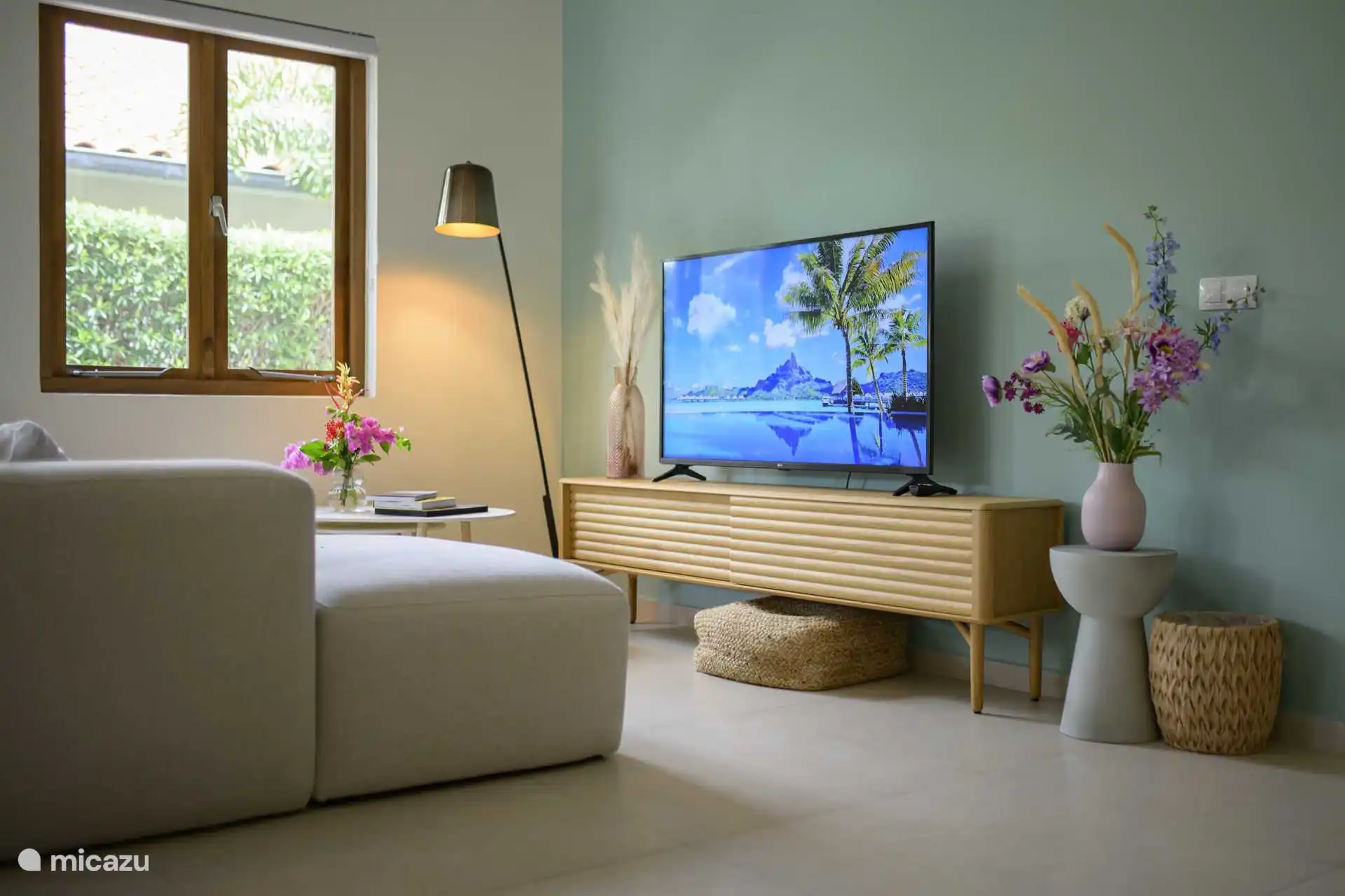 In the living room, with air conditioning, there is a sitting area with a comfortable lounge sofa. Stretch out on the couch and stream from your own streaming service on the smart TV!