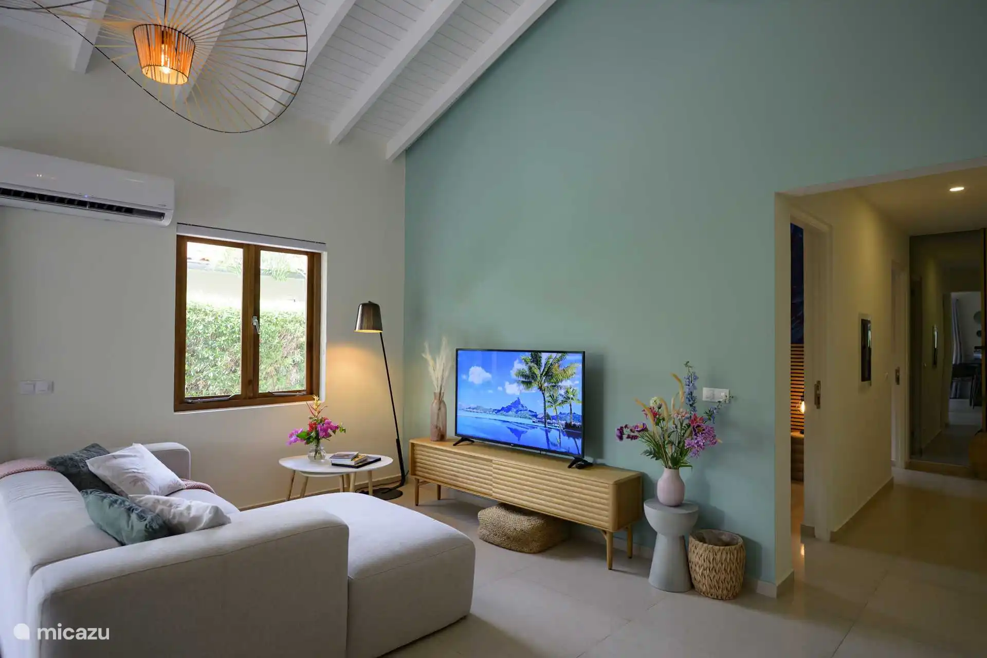 At the quiet and green Vredenberg Resort, just five minutes from Mambo Beach, you will find this luxurious and stylishly furnished holiday home. Vredenberg Village is a gated resort with several villas, apartments and bungalows in the same style with fresh white plaster and beautiful hardwood frames. A wonderful place to relax, with all the comforts within reach.