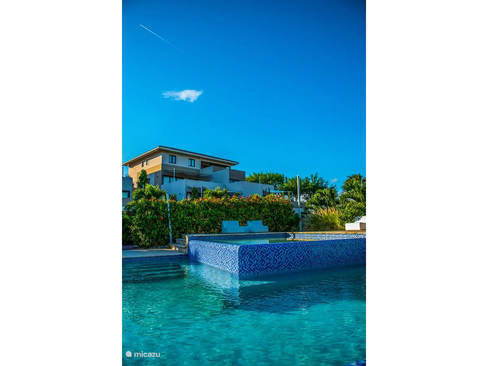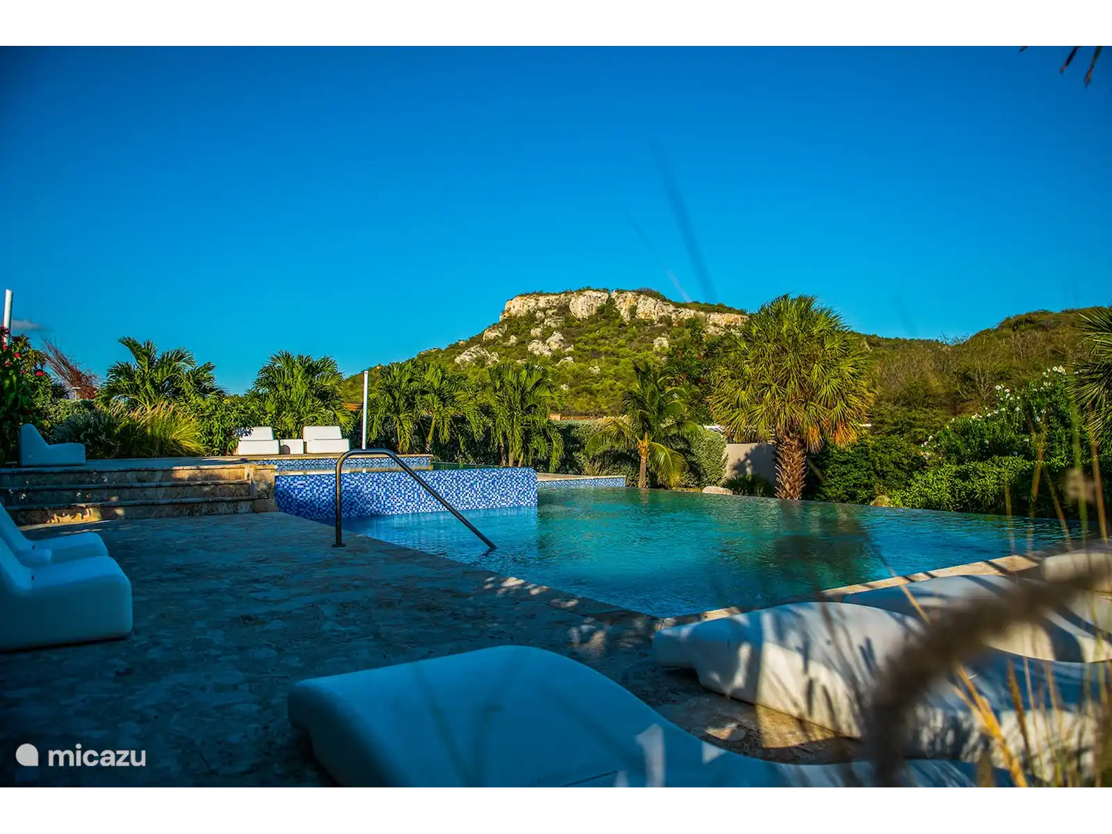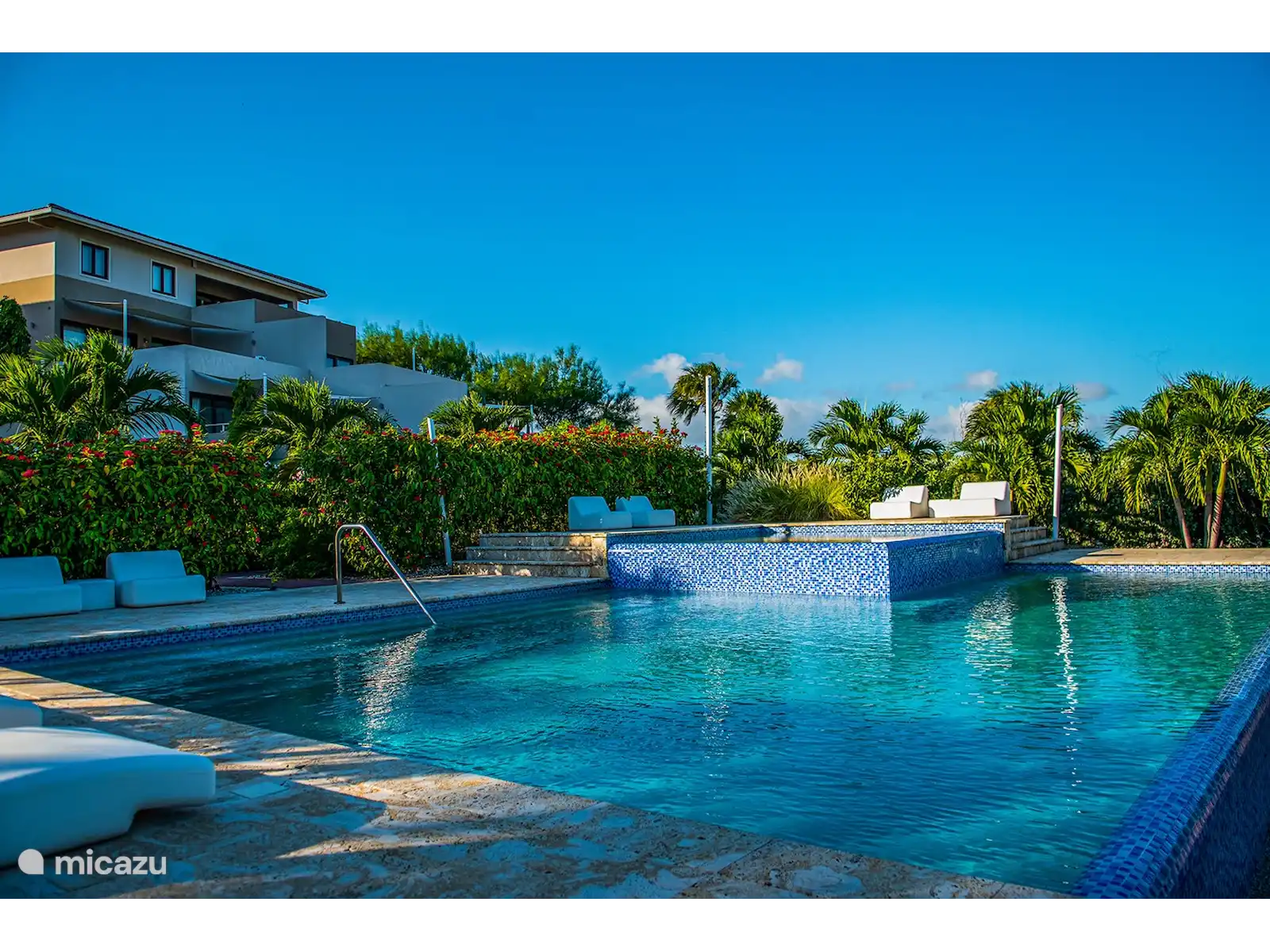 From the front door you can easily walk to the pool with sunbeds.