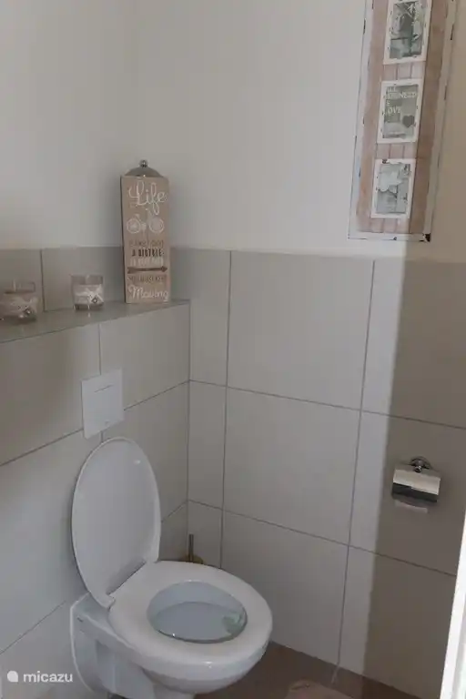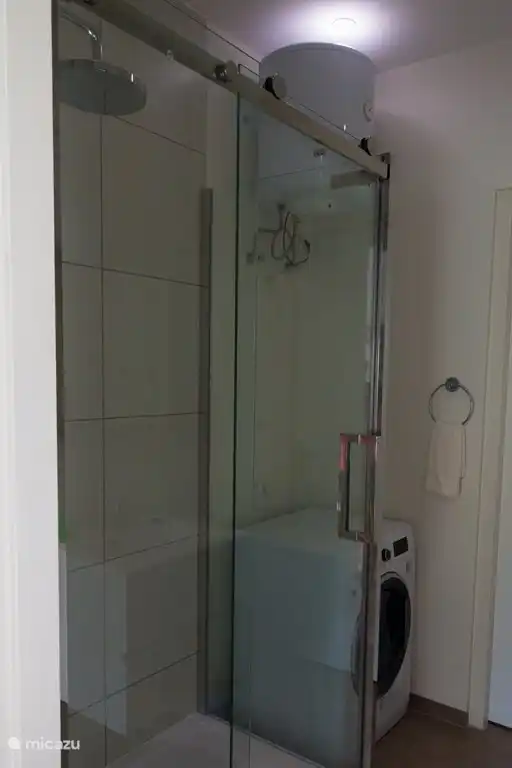 The modern bathroom is equipped with a spacious shower, a sink, toilet and its own washing machine and dryer, which offers extra convenience during a longer stay.