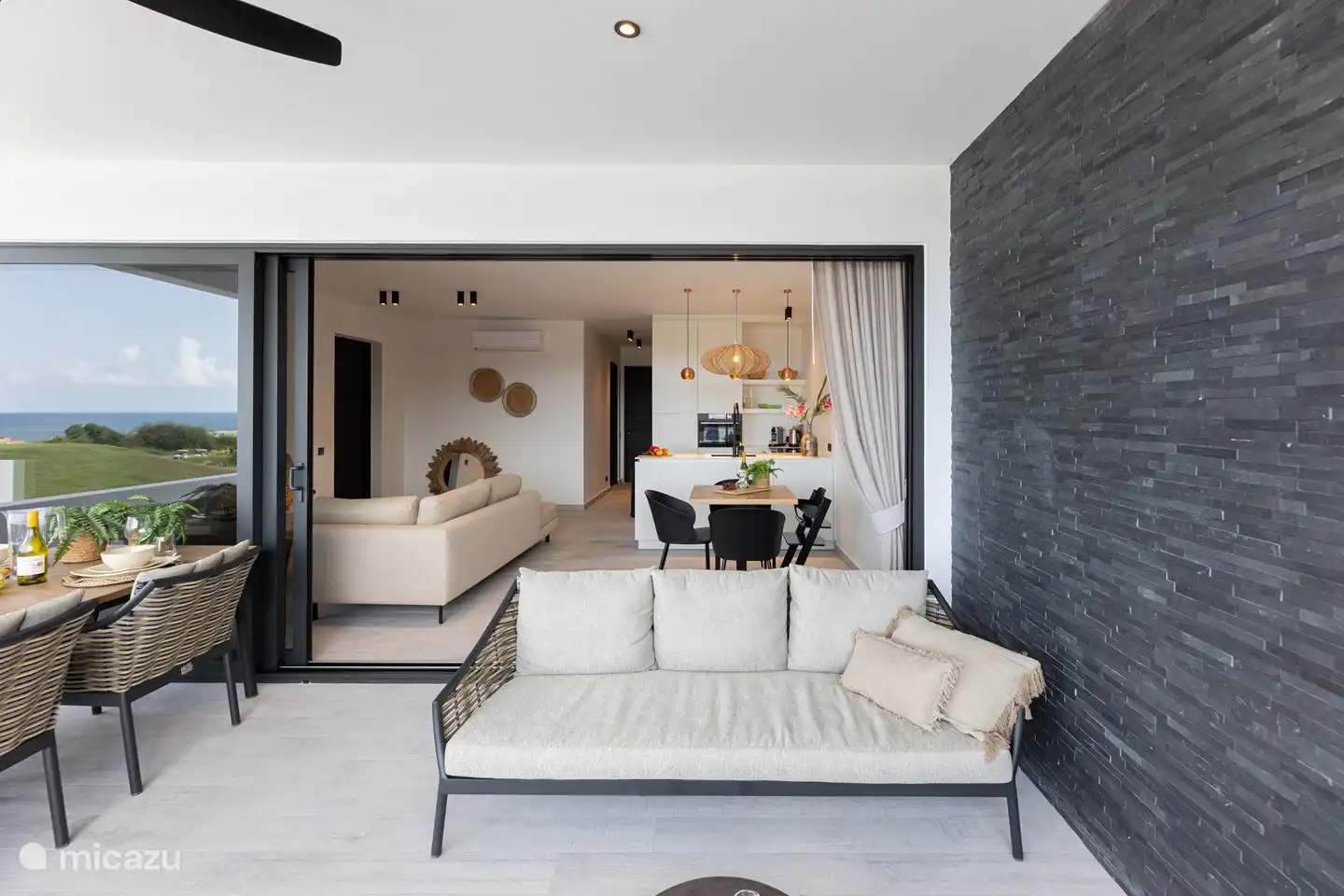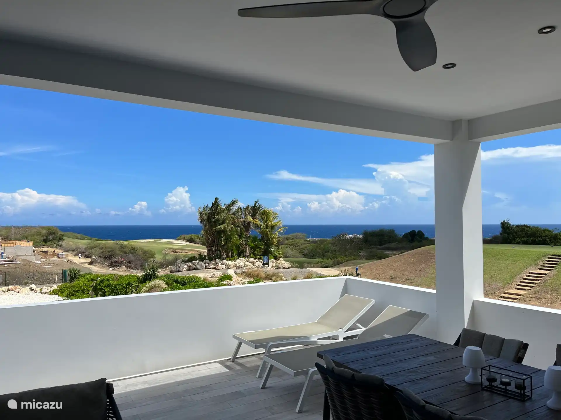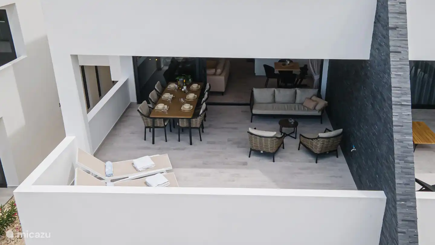 On the terrace there is a spacious lounge set and a 6-person dining table with comfortable lounge chairs with 4 season cushions. There are 2 luxurious sunbeds and a ceiling fan for extra cooling, even though there is generally a nice breeze.