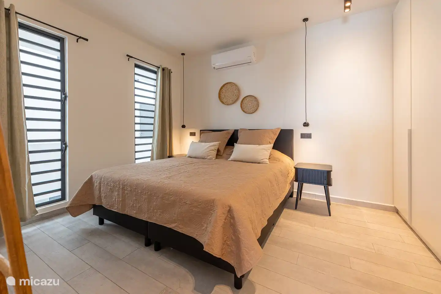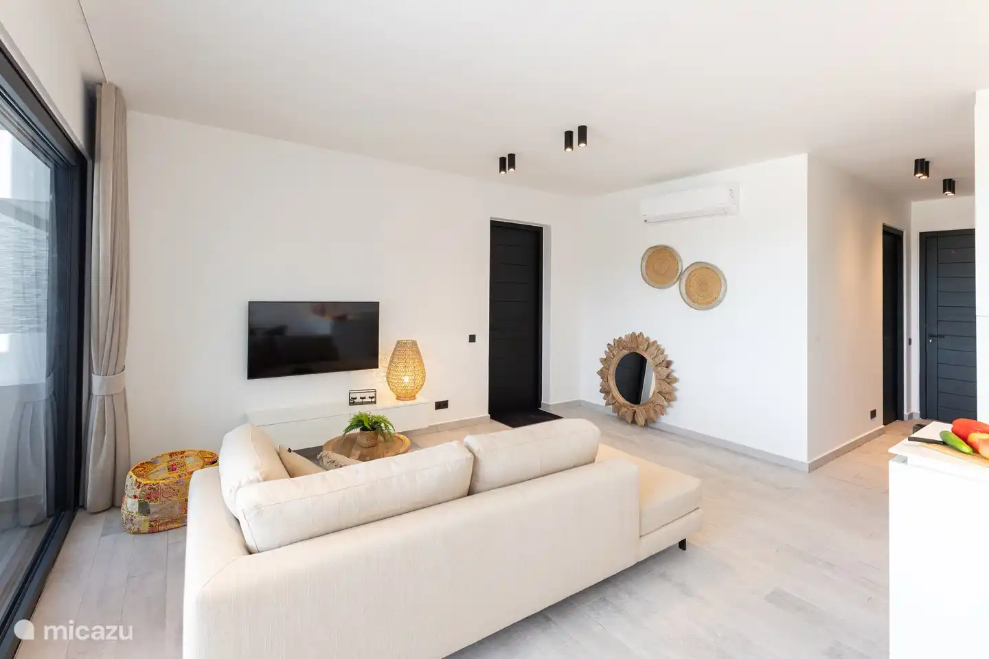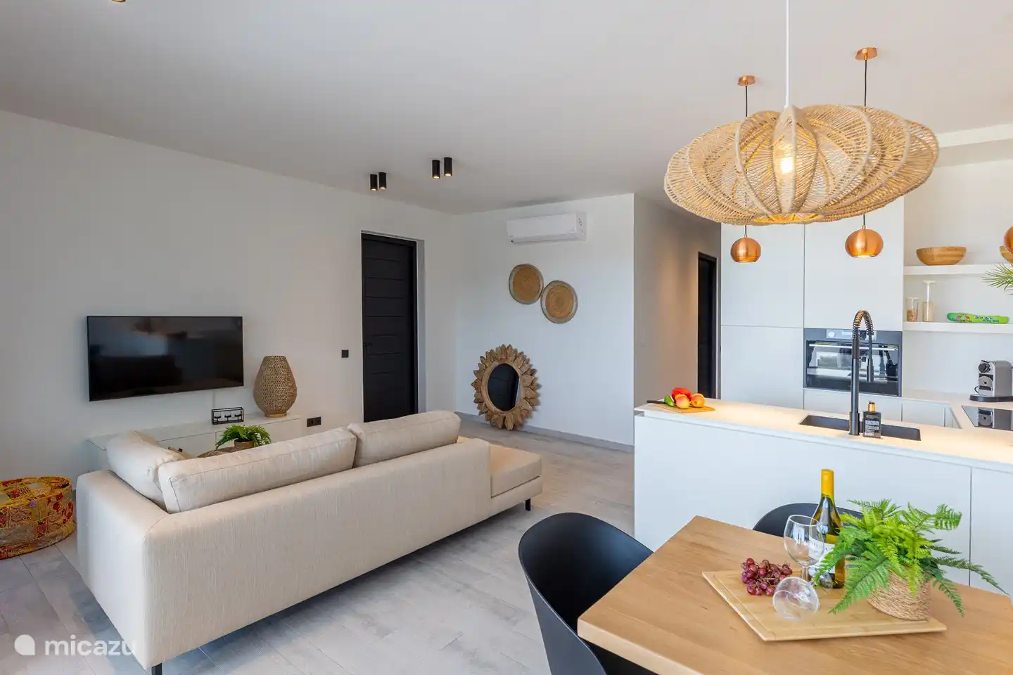 The living room with open kitchen is modern and fully equipped. The two air-conditioned bedrooms have very spacious wardrobes and a private bathroom with walk-in shower, sink and toilet. The master bedroom has a double box spring bed (180x200 cm) with a topper. The 2nd bedroom has 2 single beds (2x 80x200 cm) with 2 toppers.