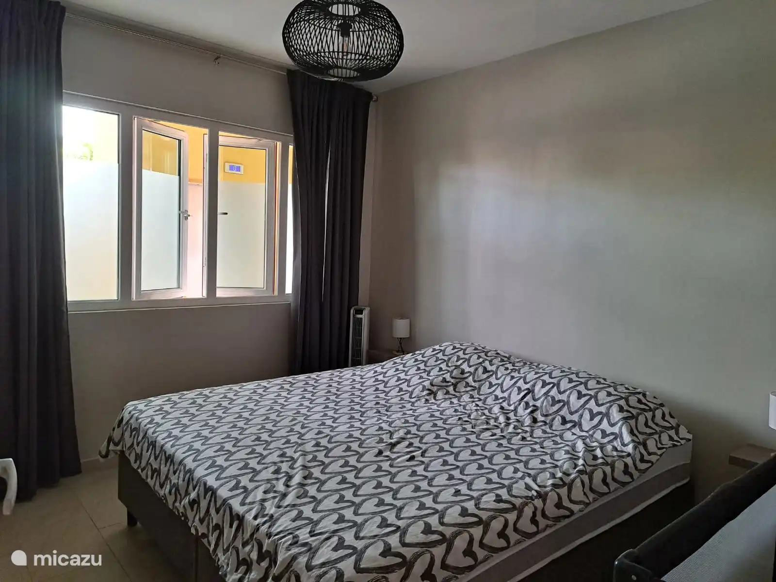 In the living room we have air conditioning and a ceiling fan, a bar with two stools, a truly lovely sofa bed where you can lie down with two people, a dresser and a TV. There is wifi (included in the price) so you can also use your own phone/tablet to watch TV and or movies. There is a safe available.