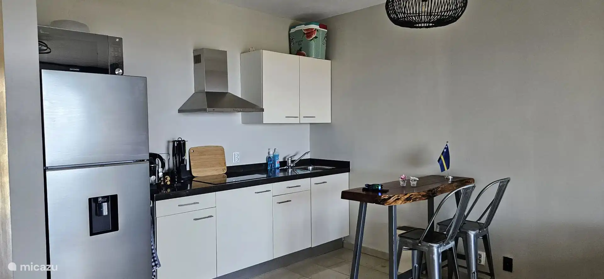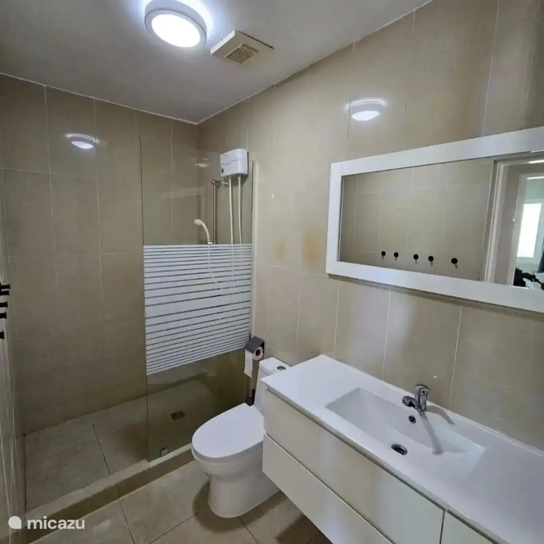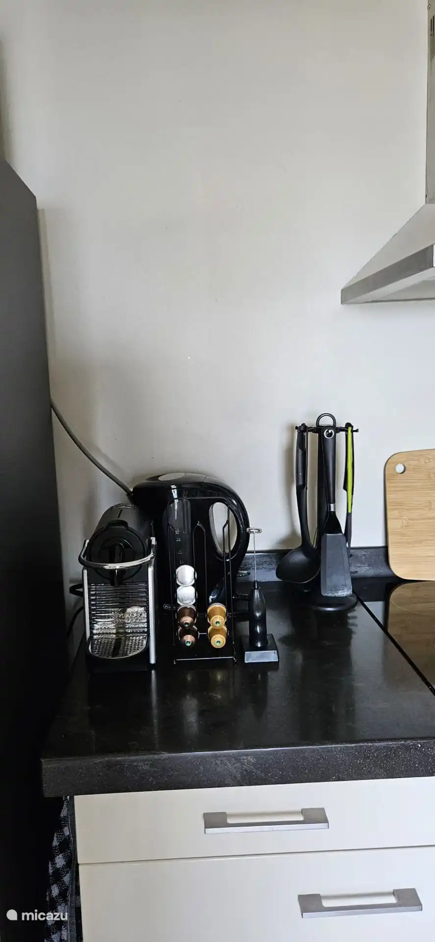 It consists of a spacious bedroom with air conditioning, two 1-person beds of 90x200, the beds can of course also be pushed together. We have a spacious shower with hot water, spacious sink with two drawers, mirror, hair dryer and clothes steamer. In the kitchen we have an electric hob, a microwave, a nespresso machine and a kettle, a fridge with freezer and cold water dispenser We do not have a dishwasher.