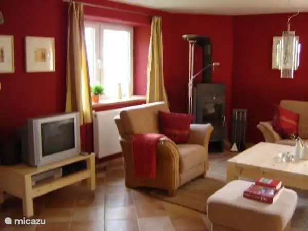 In the living room seating area with sofa, easy chair and stool. The stove is for fun, the electrical heating will warm the house quickly. Satellite TV, DVD player and CD player.