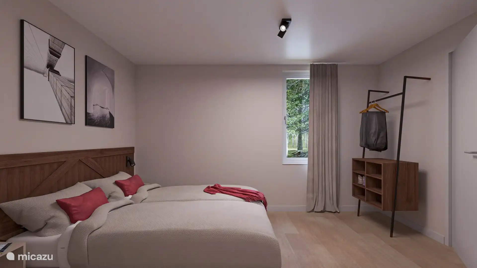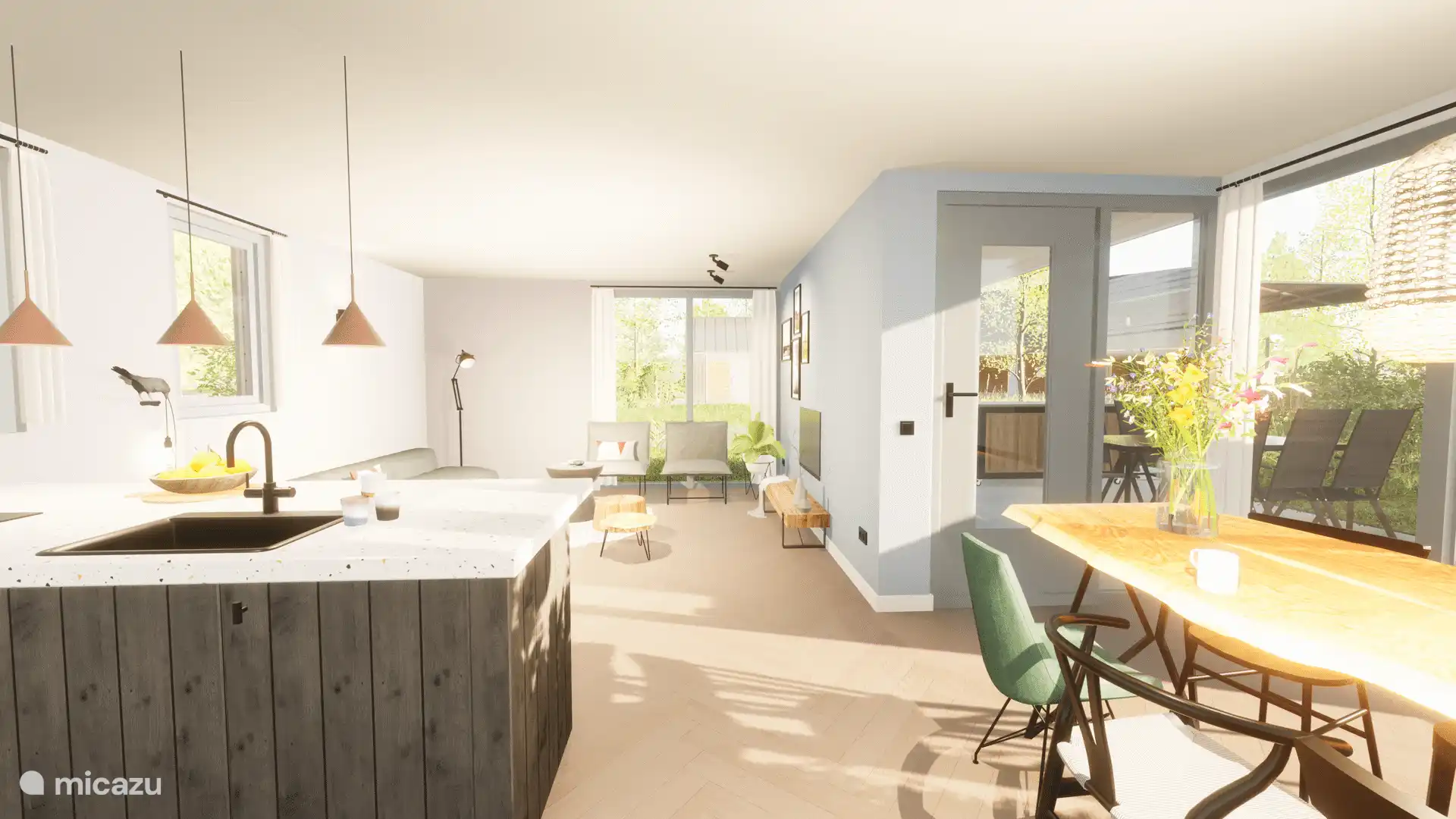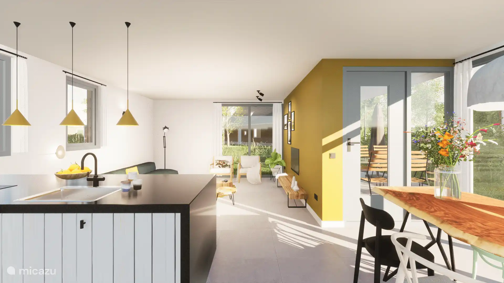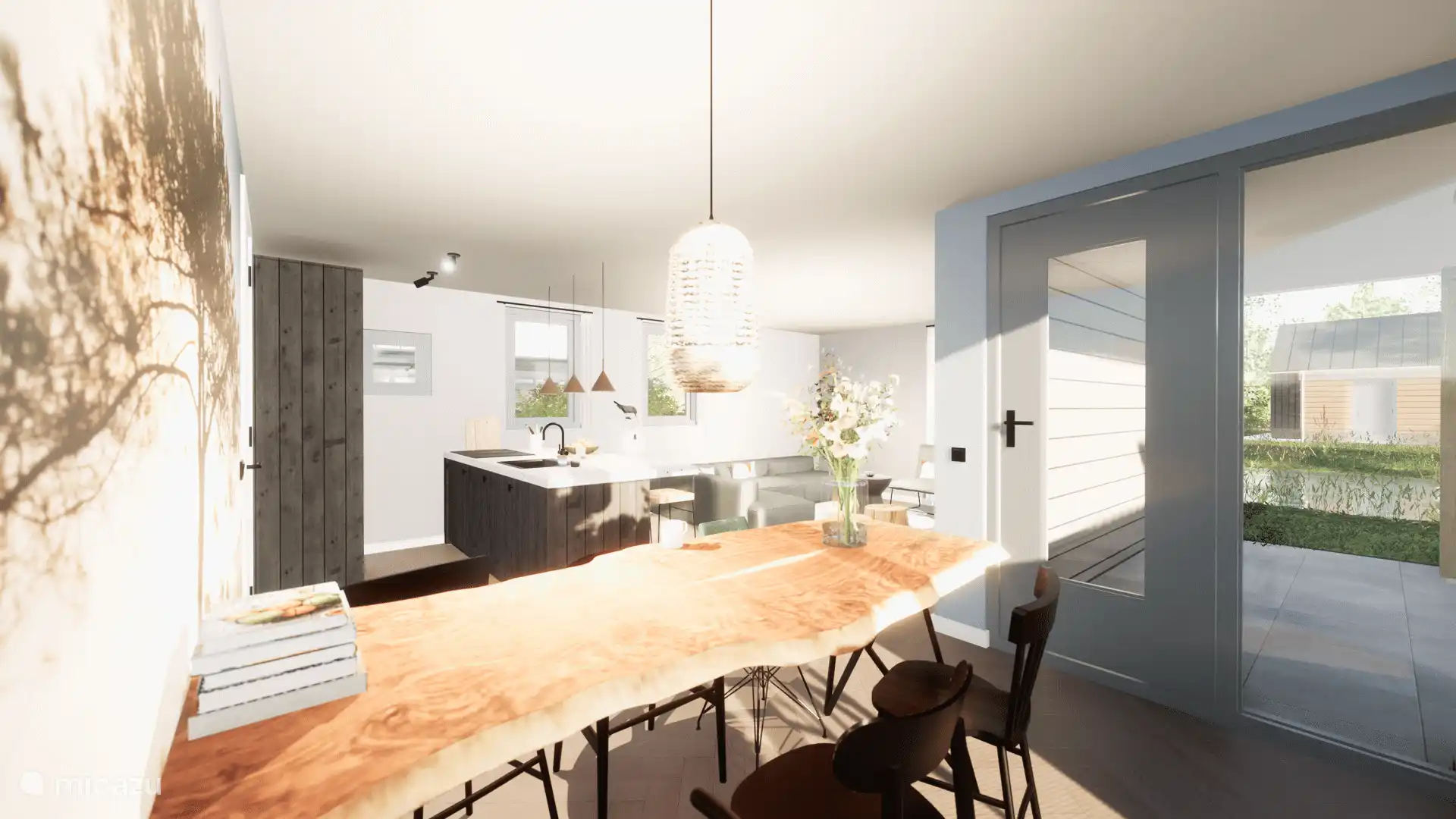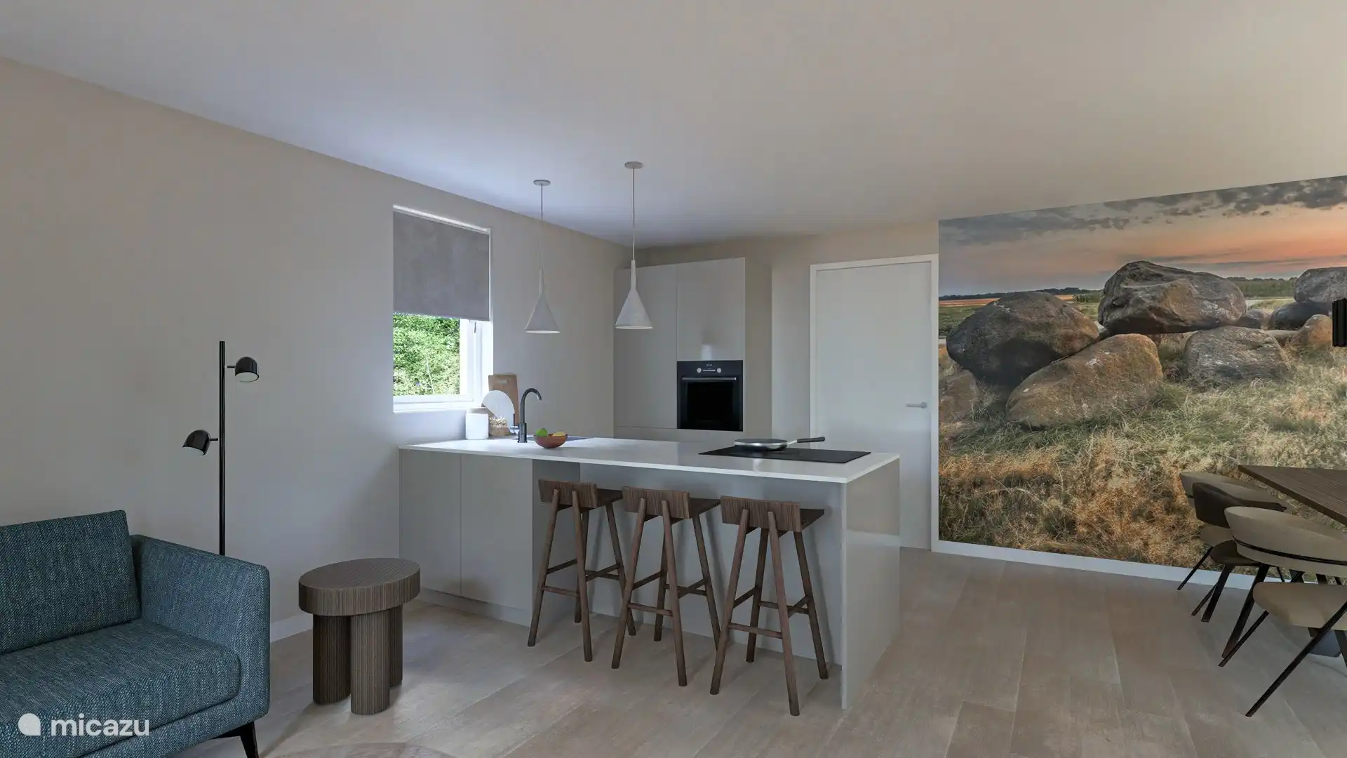 On the ground floor you will find a bedroom with two single beds and an en-suite bathroom with shower, bath, sink and toilet. There is also a separate toilet in the hall. The open kitchen with cooking island is equipped with luxury appliances and has a dining area. The indoor storage room is accessible from the outside of the house.
