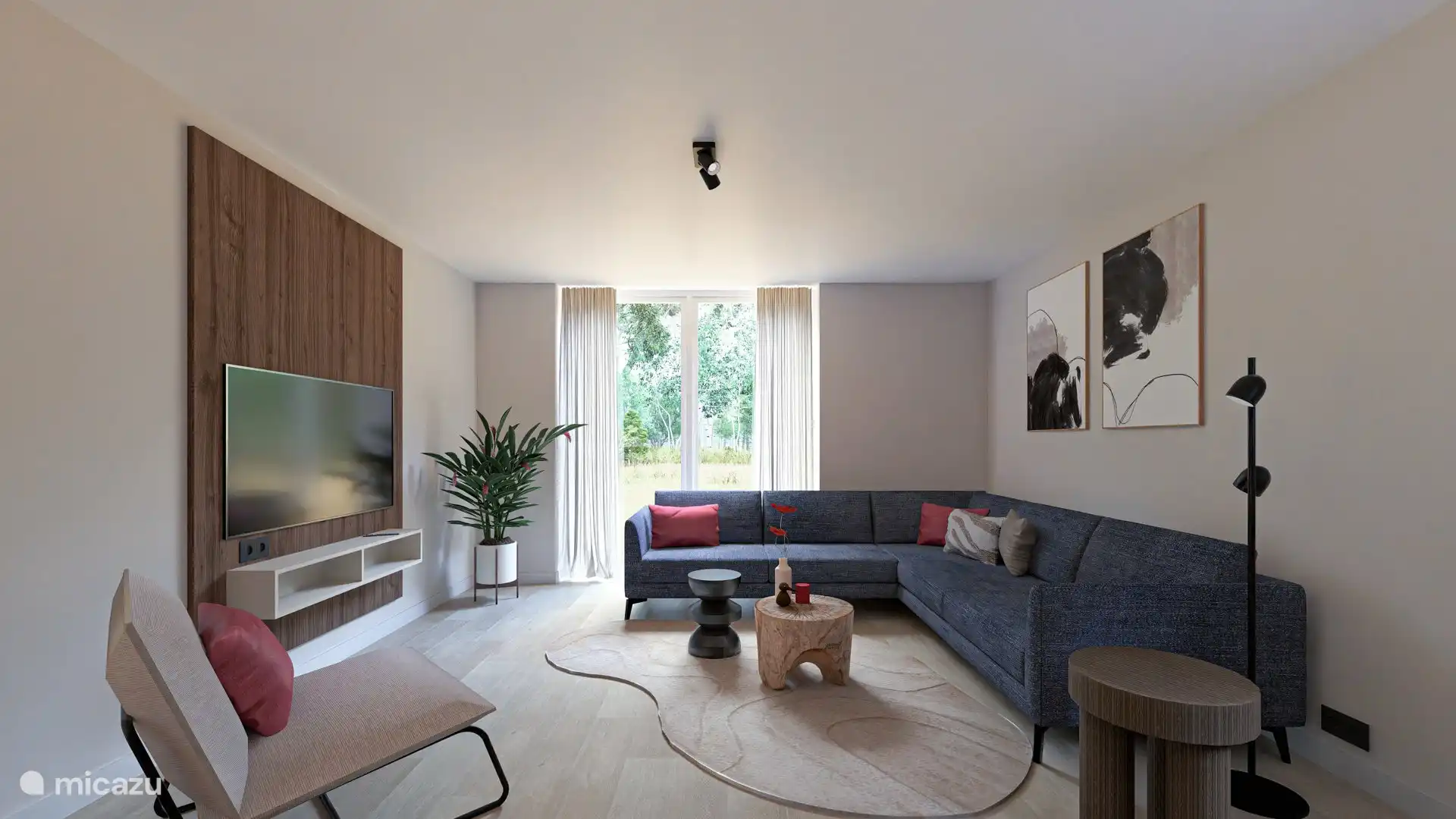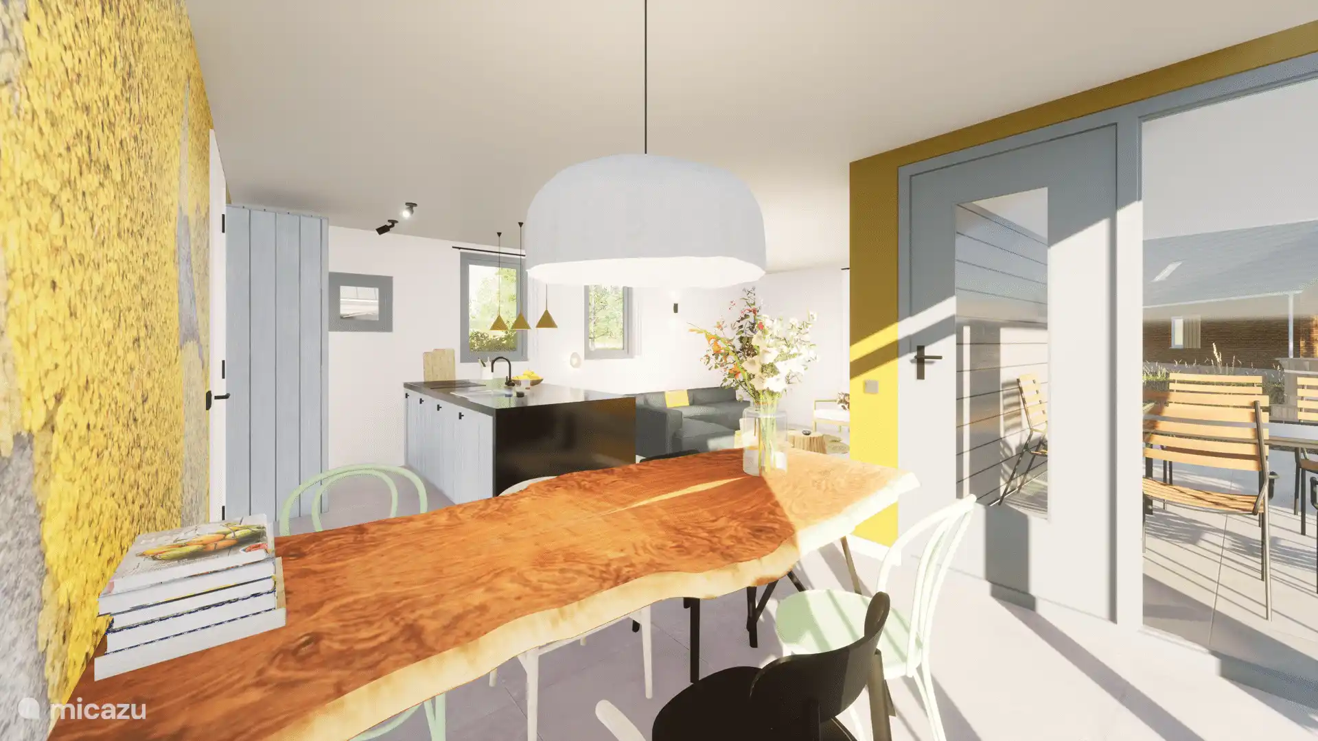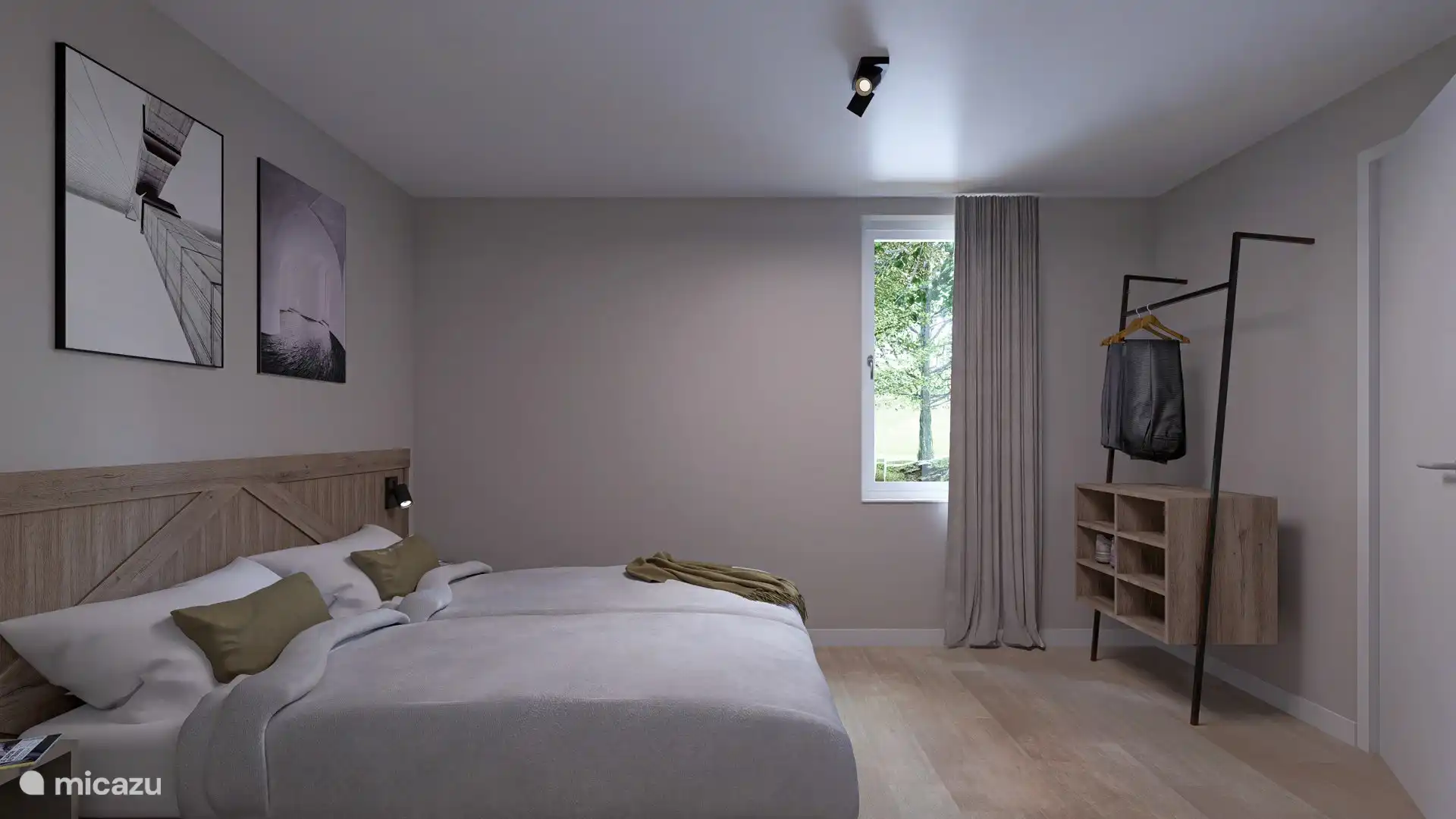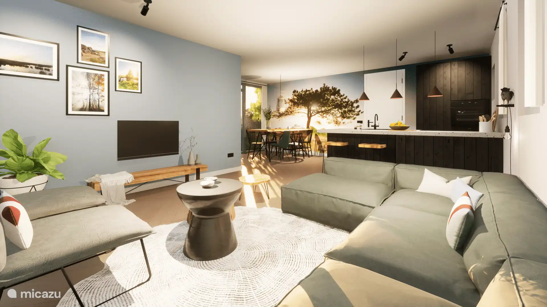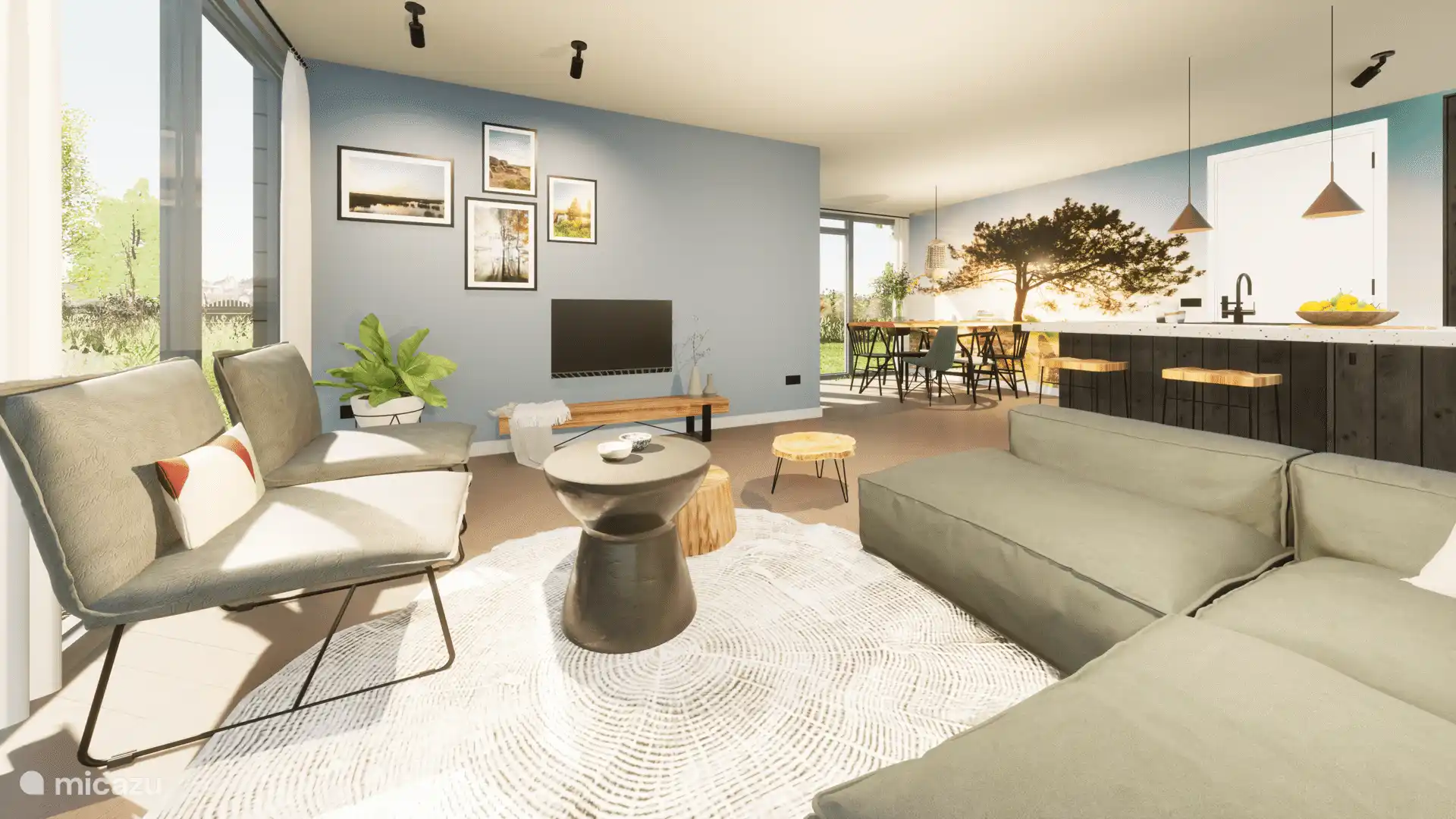 On the ground floor you will find a bedroom with two single beds and an en-suite bathroom with shower, bath, sink and toilet. There is also a separate toilet in the hall. The open kitchen with cooking island is equipped with luxury appliances and has a dining area. The indoor storage room is accessible from the outside of the house.