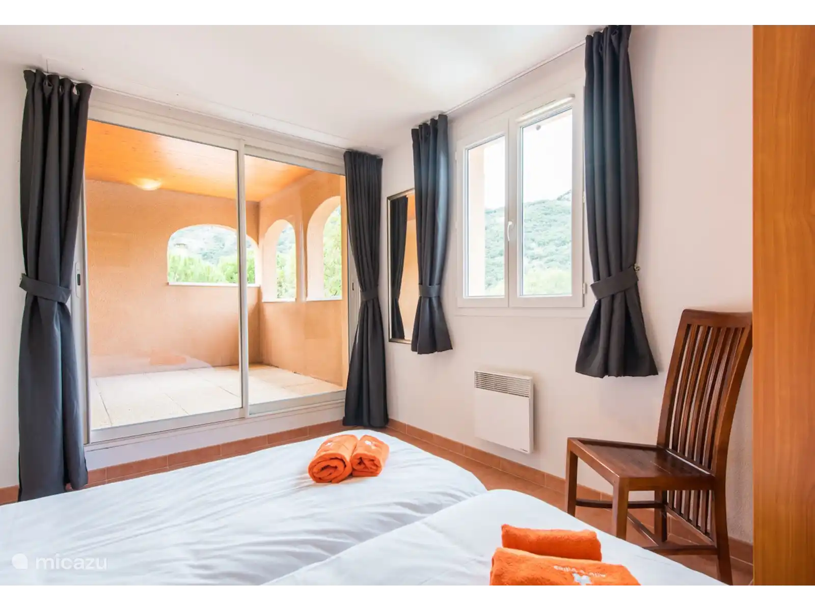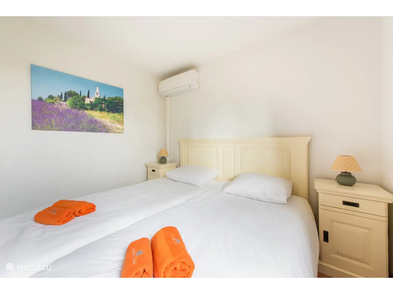Ground floor: Spacious entrance with separate toilet, open luxury kitchen with built-in appliances. Spacious living room with air conditioning, and a beautiful view of the mountains. Two bedrooms for two people, with air conditioning and patio doors to the spacious attractive terrace and garden. Bathroom with bath and sink.