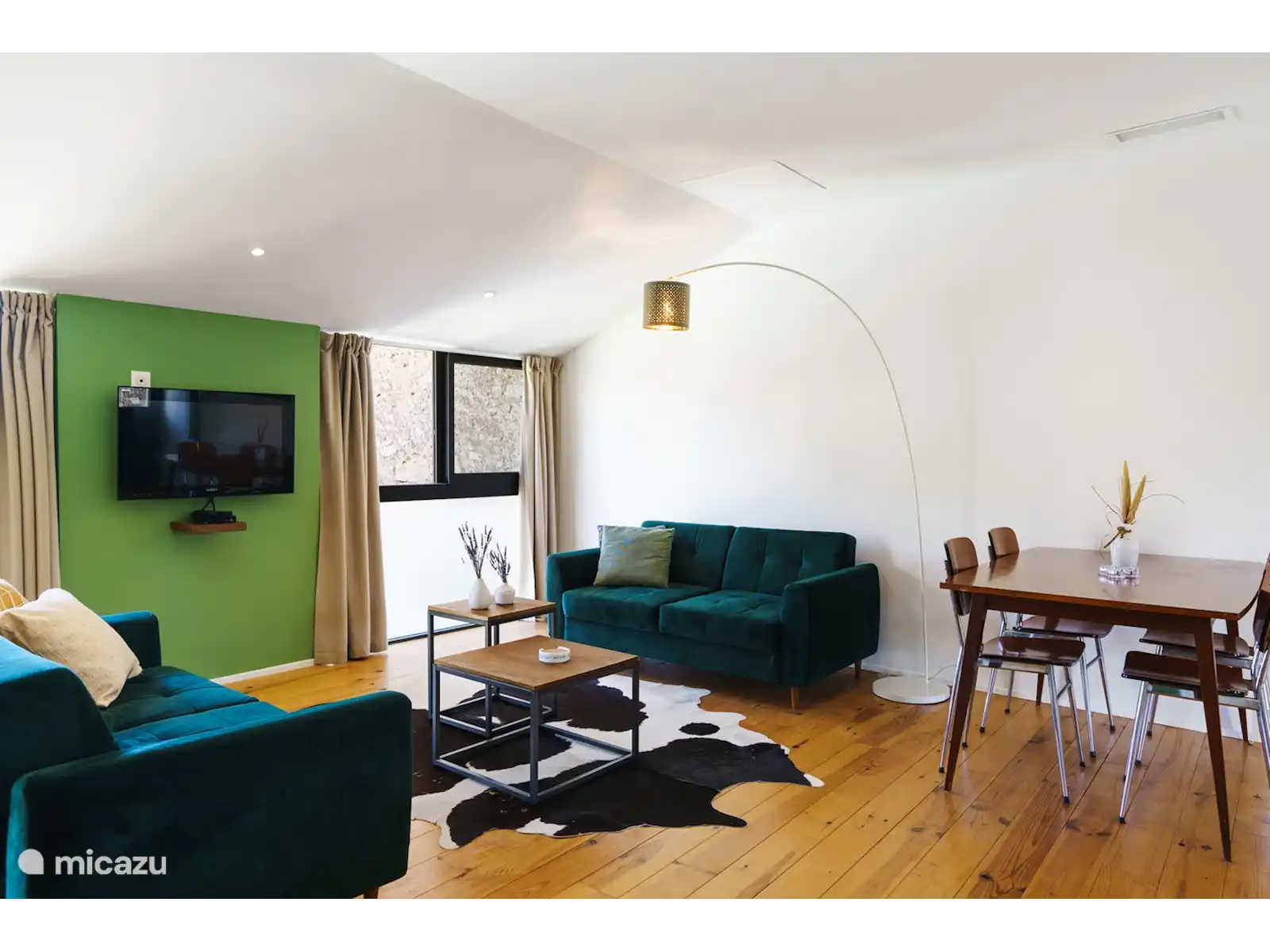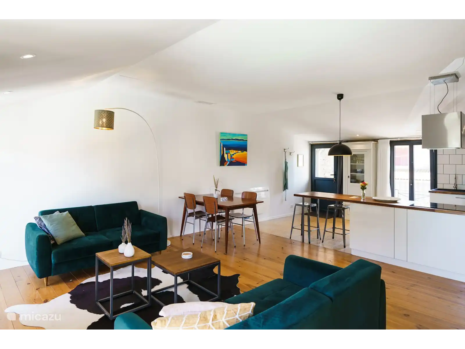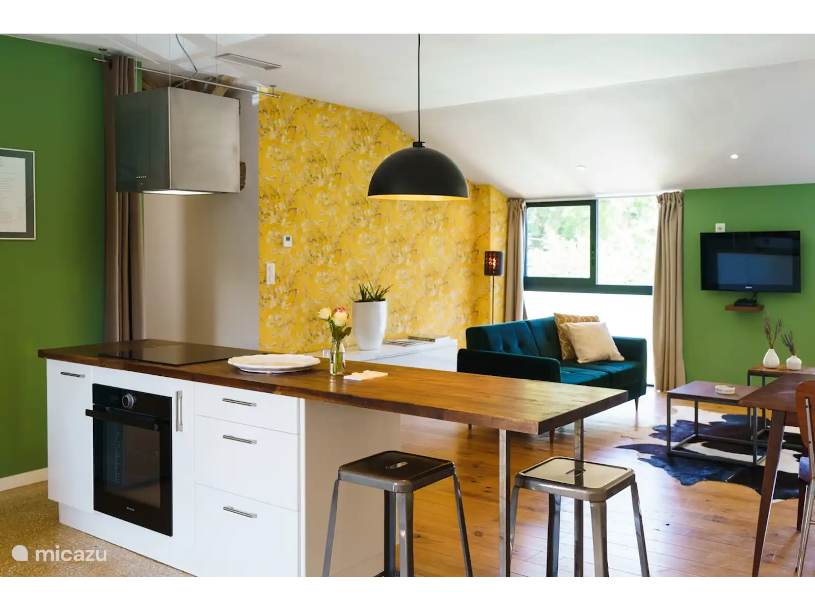 The spacious living room is equipped with two 2.5 seater sofas, and a dining table for 5 people. The kitchen has a cooking island with oven. French channels can be received via the TV, in addition, your own media can be streamed via the Chromecast.