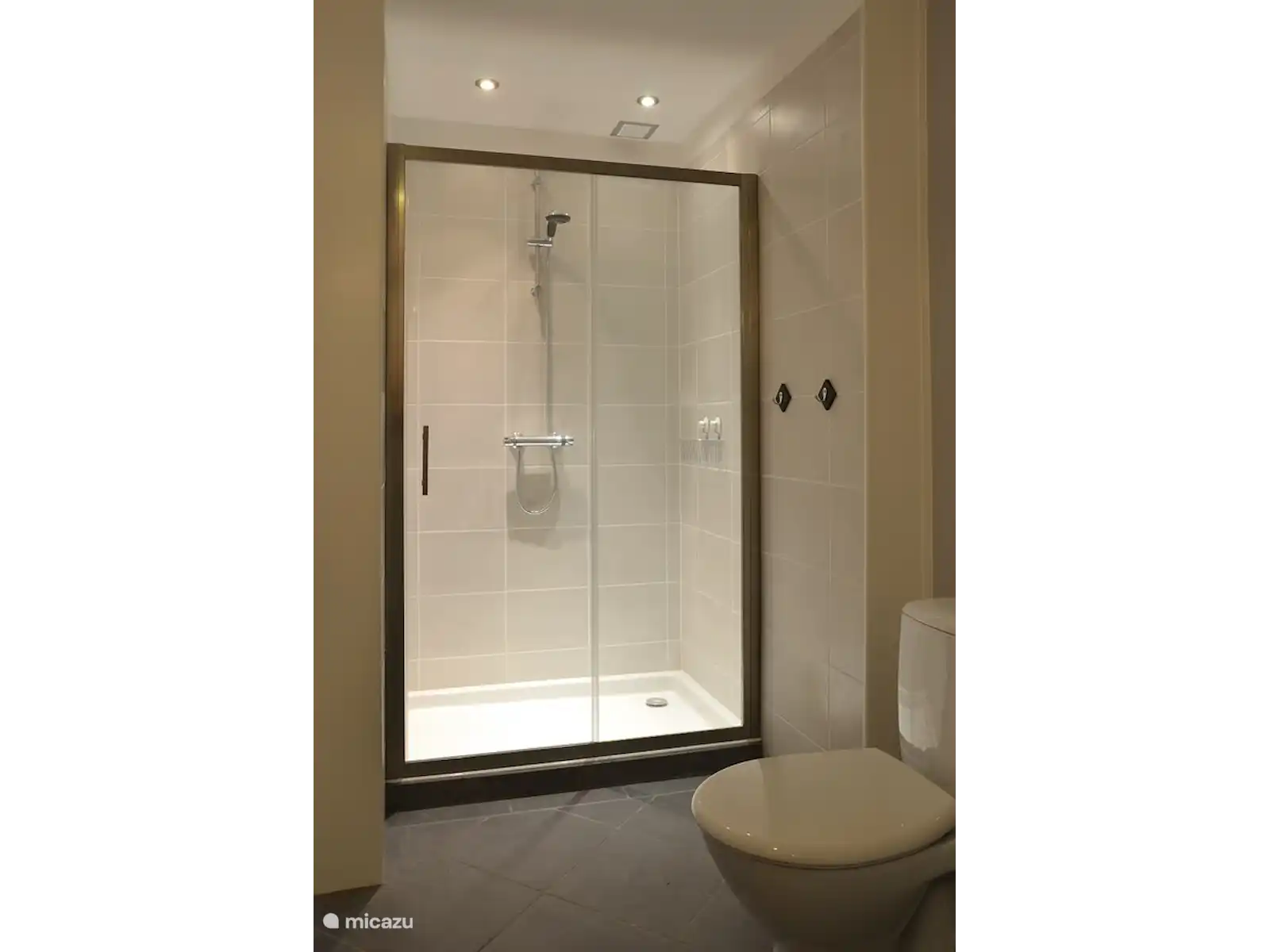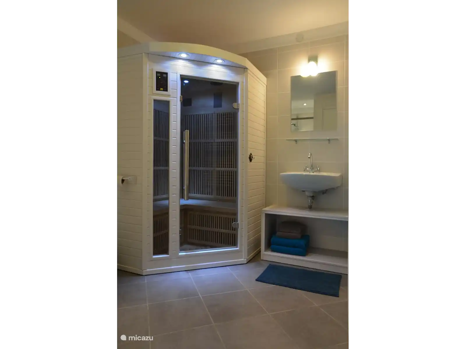 The bathroom has a spacious shower, a sink and an infrared sauna for two people.