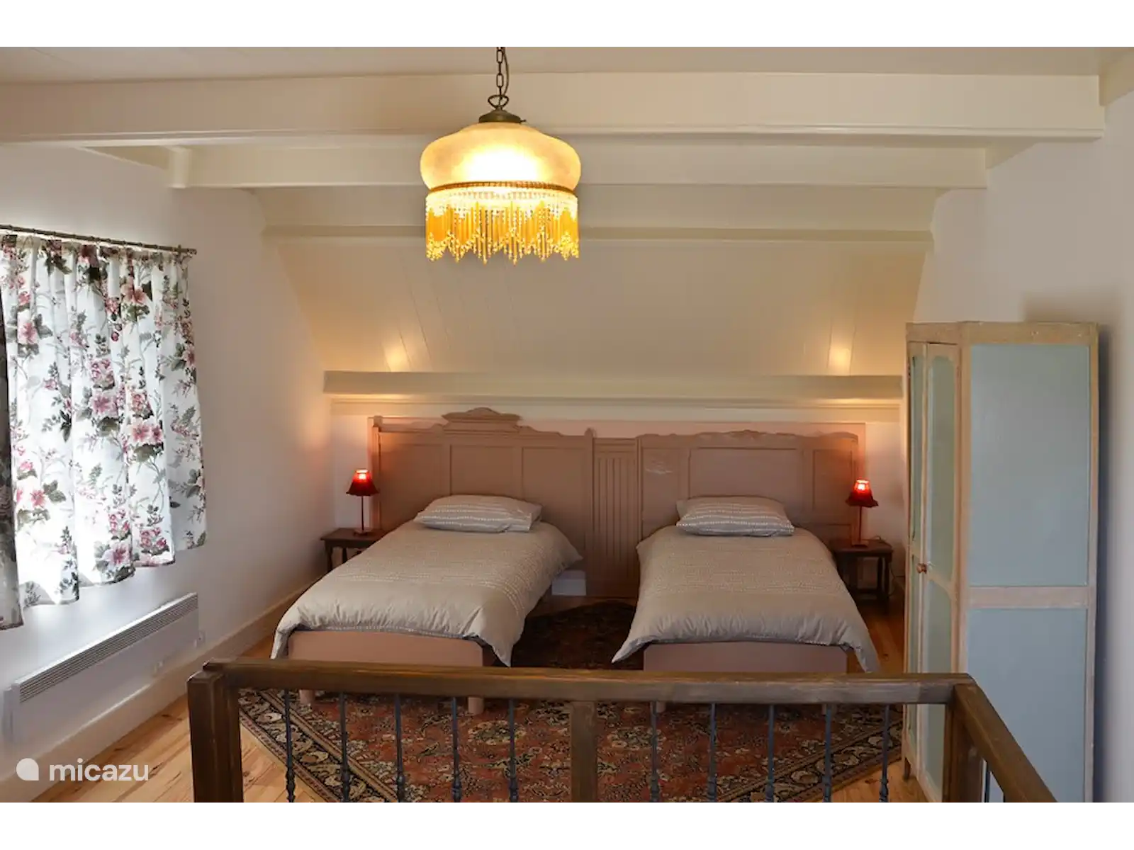 On the first floor is a second bedroom with two single beds and a sitting area. A third single bed can be added.