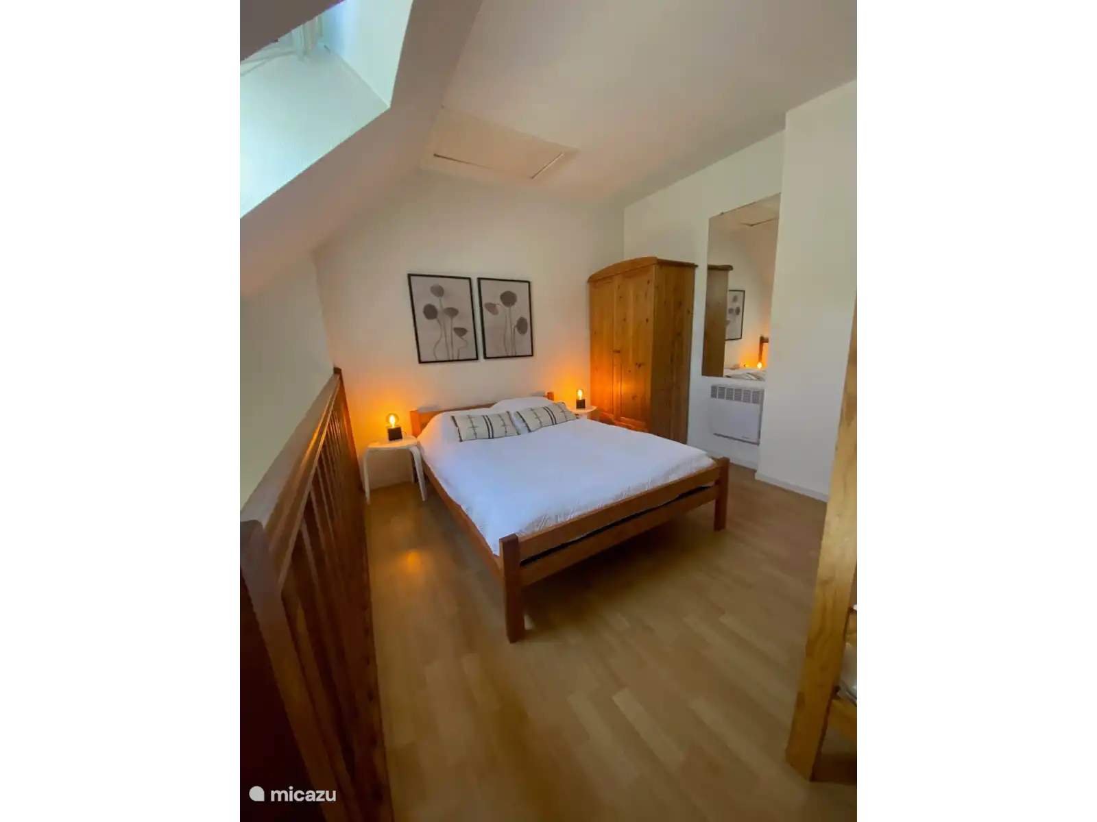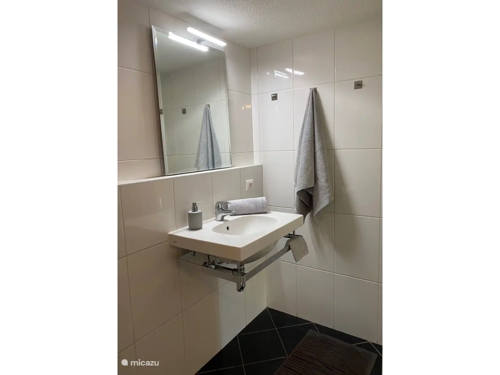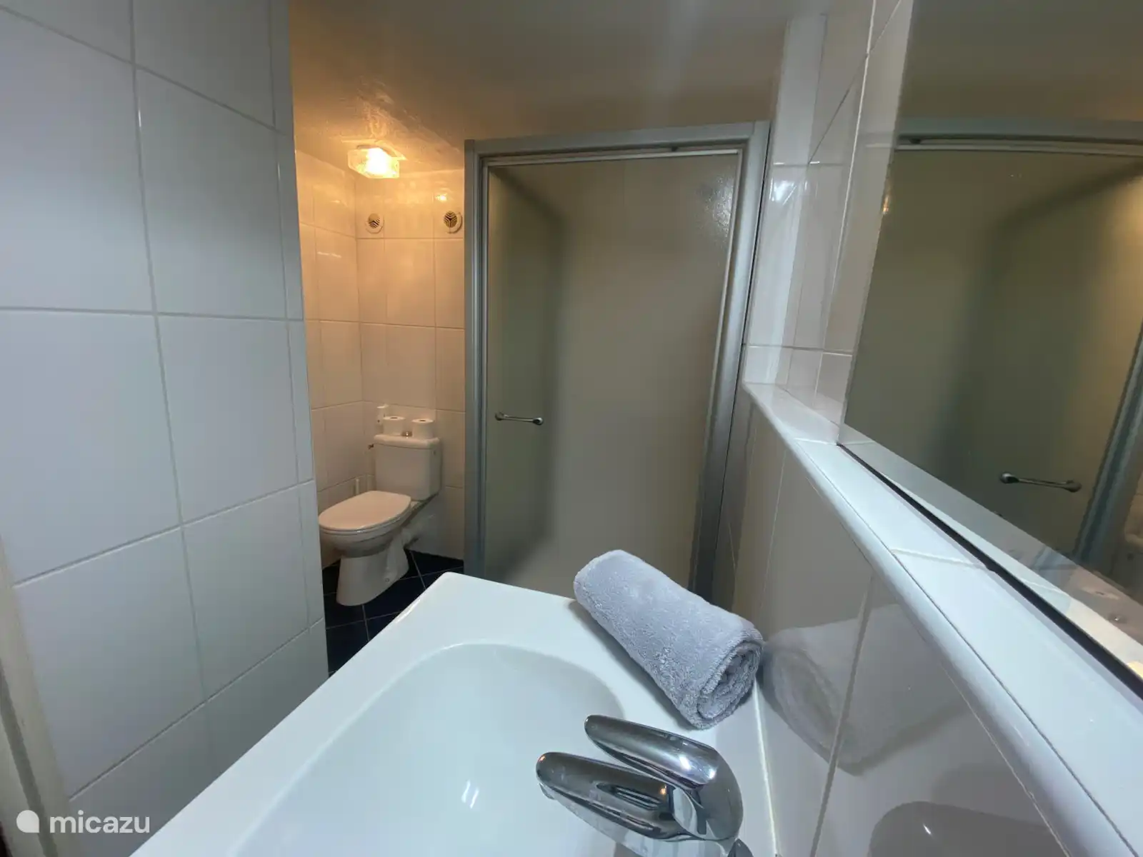 On the ground floor are the living room with a cozy sitting area and library on a wooden floor, next to it the open kitchen with a practical, partly folding dining table, suitable for 6 people. Through the patio doors you enter one of the sunny terraces from both the sitting area and the dining area. The fresh bathroom is adjacent to the kitchen. This is equipped with a spacious shower corner, large sink and toilet.