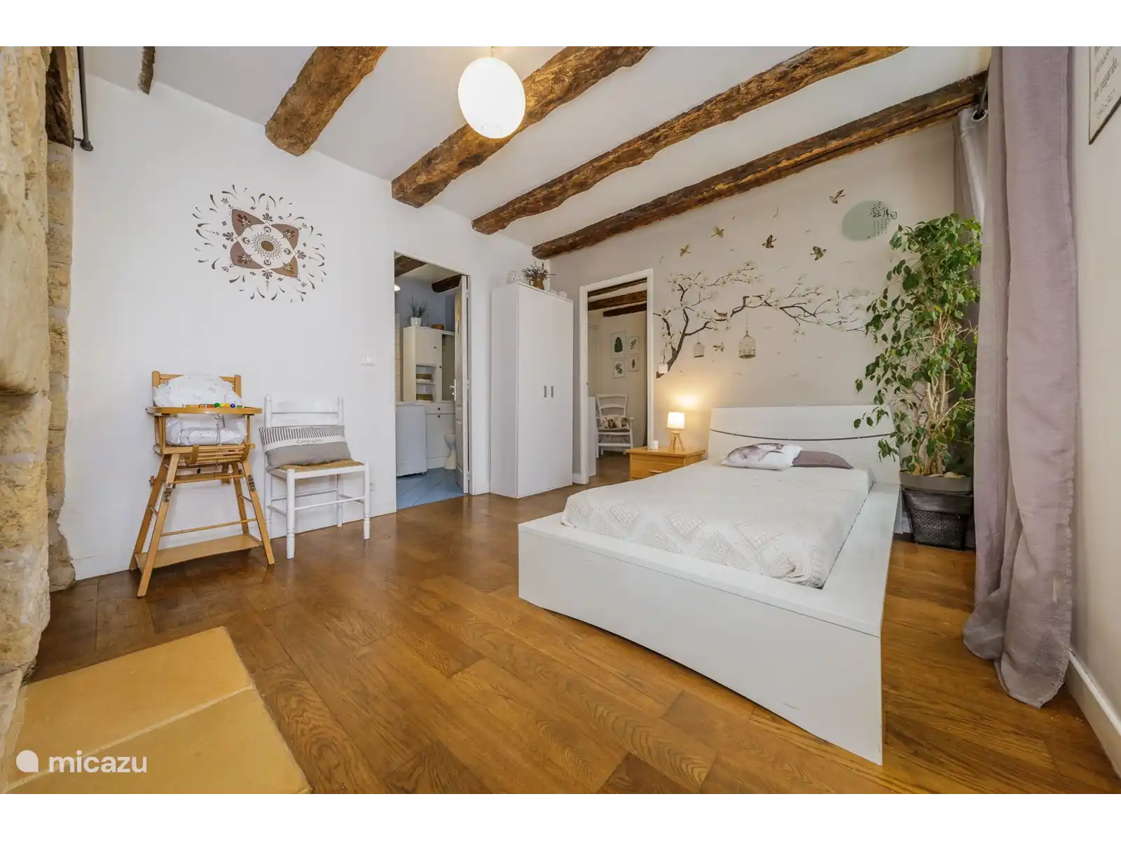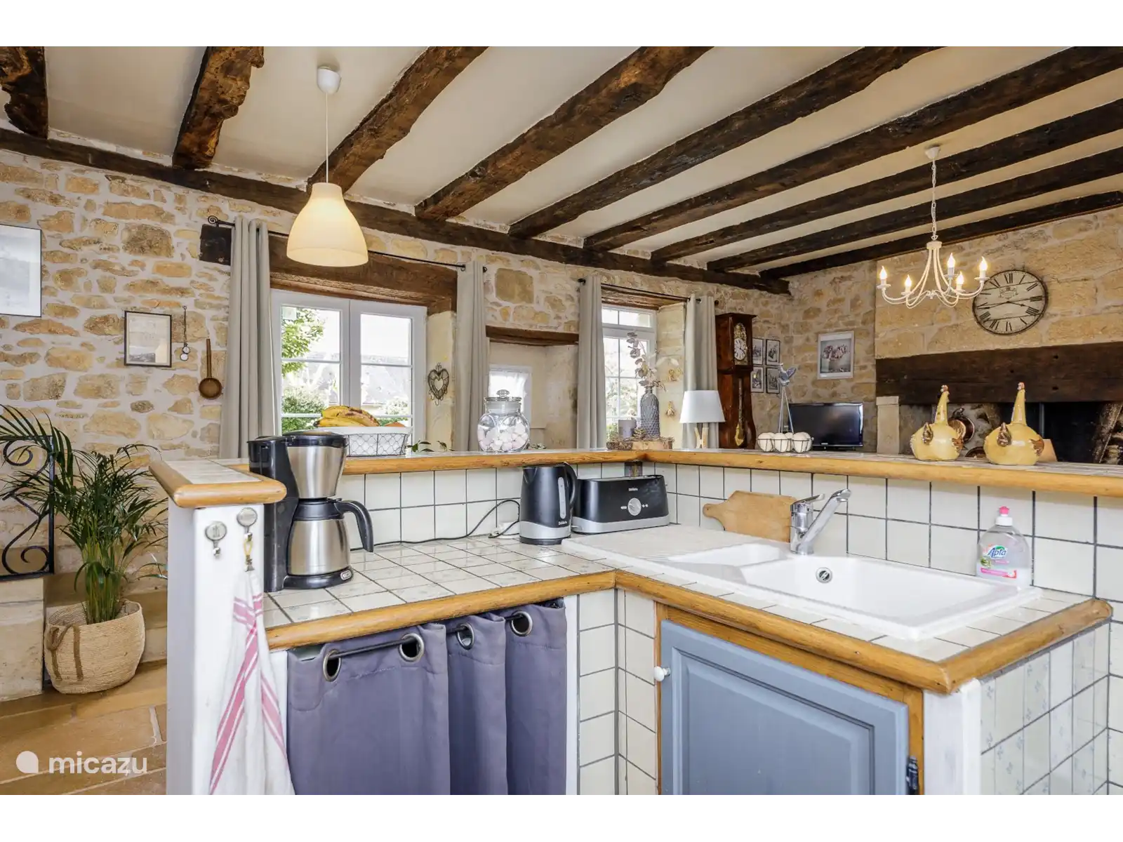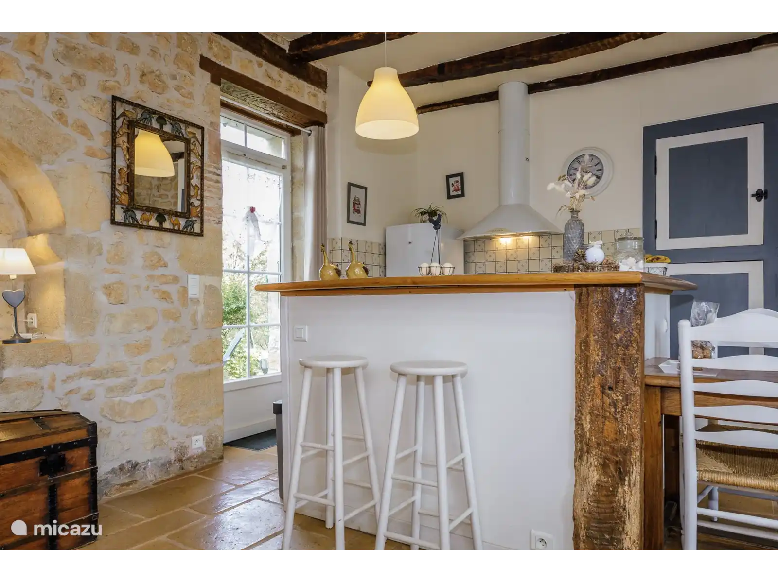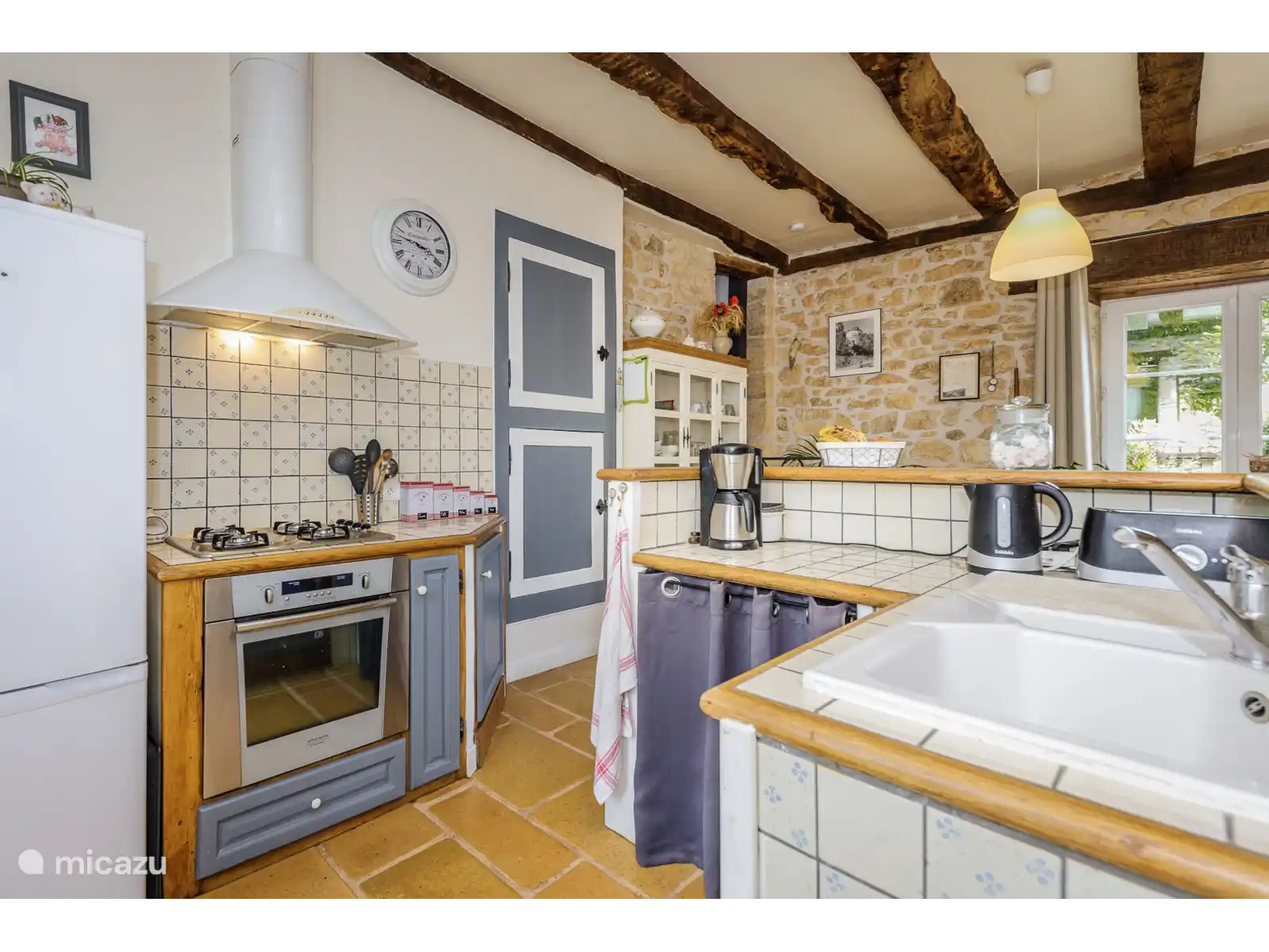 The holiday home has an open kitchen with everything for your convenience, such as oven, refrigerator, microwave and gas stove. There is a washing machine in the neat and comfortable bathroom on the 1 floor. Le Four Saint Rabier contains two simple bedrooms. One of them (the one with the double bed) has French doors to a lovely intimate terrace. You have to go through the other open space (with the two