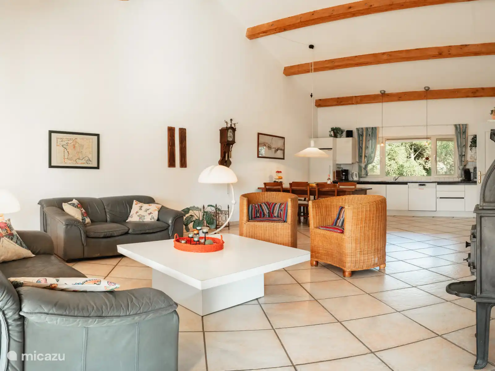 Large living room (50 m²) with exposed beams and sliding doors to the covered terrace of 40 m²
