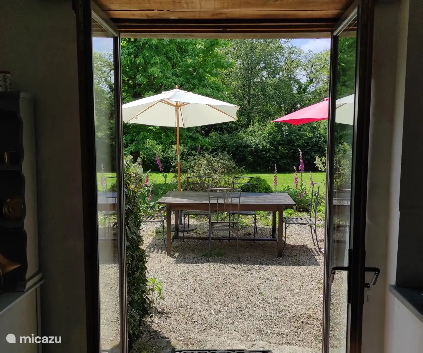Double doors open onto a sunny west-facing gravelled terrace surrounded by flowers and lawn where you can dine al fresco bathed in evening sunshine. We provide a barbeque too for extra sizzle.