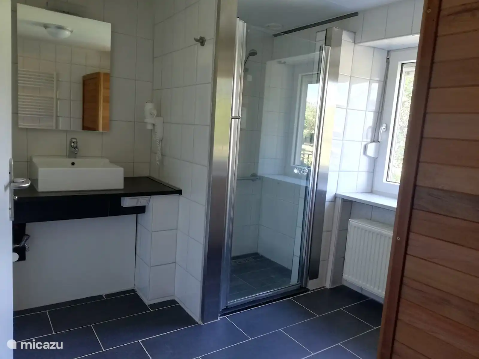 There is also a toilet with urinal on the ground floor and a bathroom with shower, sink and infrared sauna.