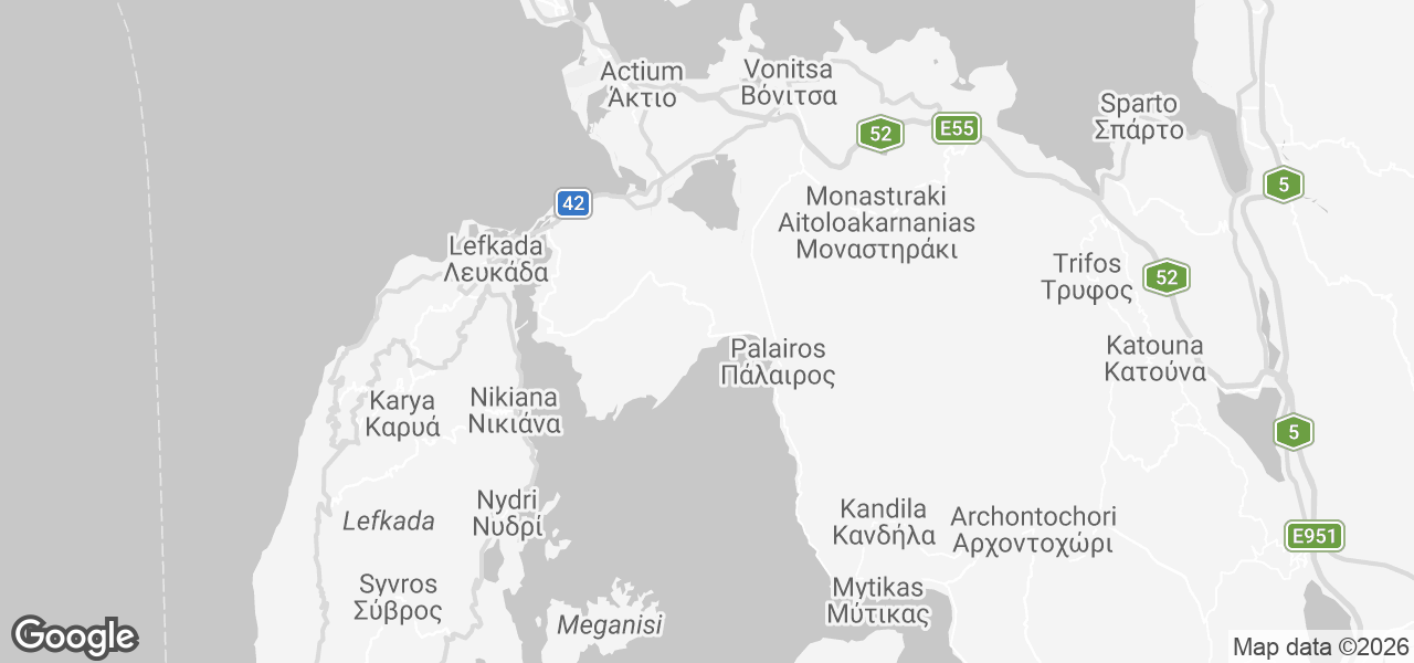 Lefkada island, connected with the mainland by a bridge is easily reached by car as well as Preveza town in about 40 min drive.