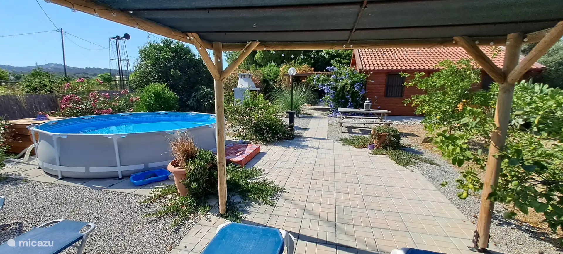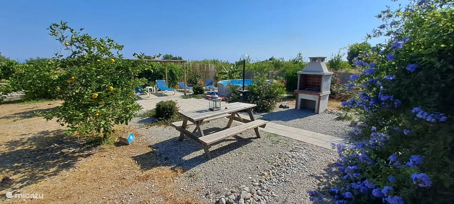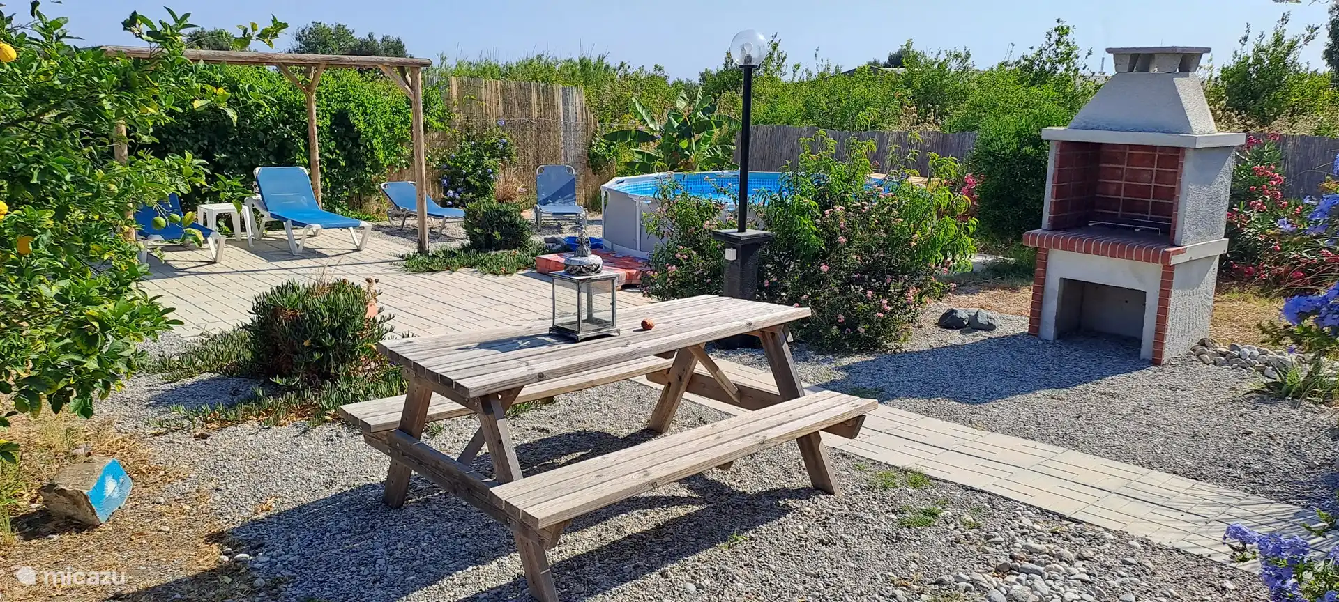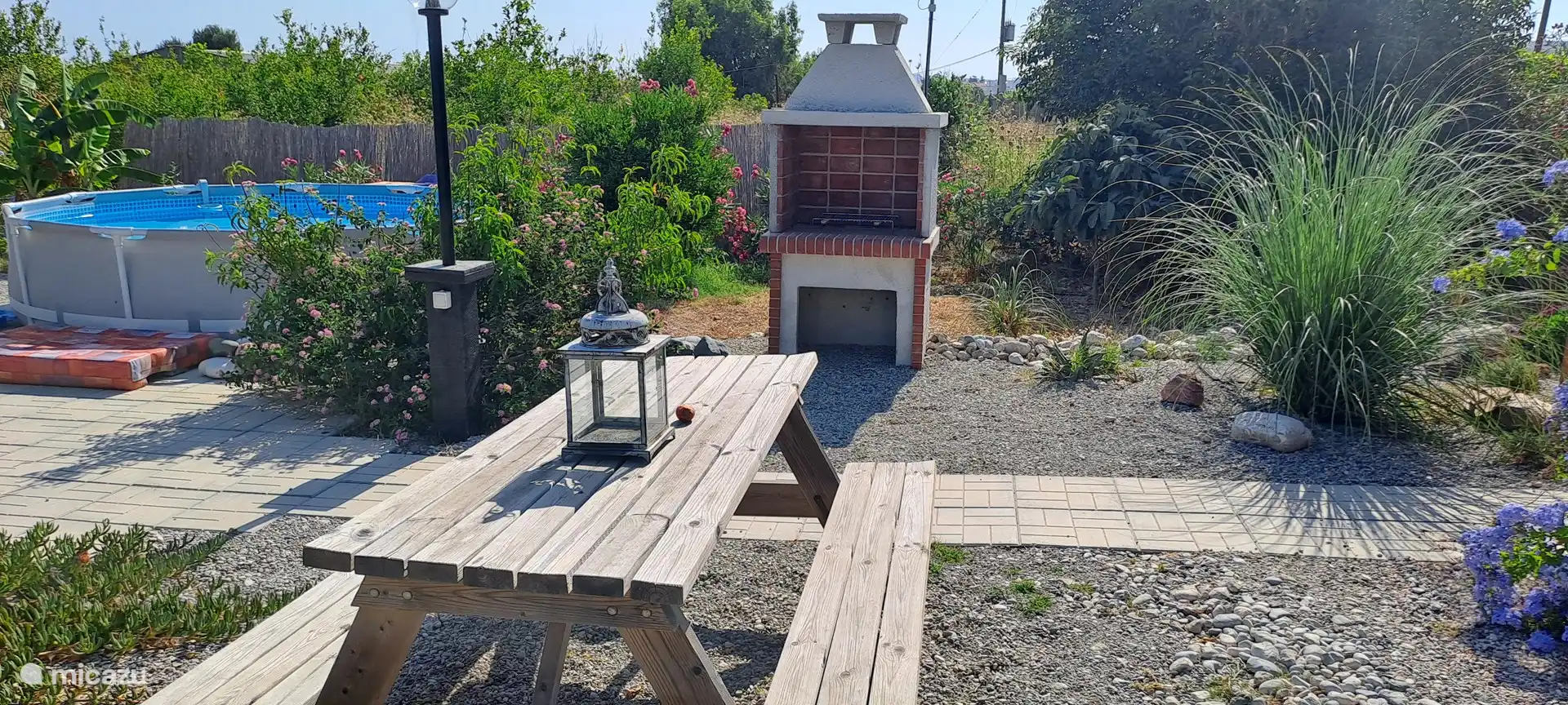 Opening the metal door to the courtyard everyone gets a smile to their face. You see a stair up to the roof terraces and a beautiful pattern pebble floor.. A few steps in you pass the outside bathroom and see the dining area with a big barbecue especially built for kontosouvli (meat that is put on a 2 meter long metal pole and grilled rotating slow for 2 hours.. Absolutely amazing!).