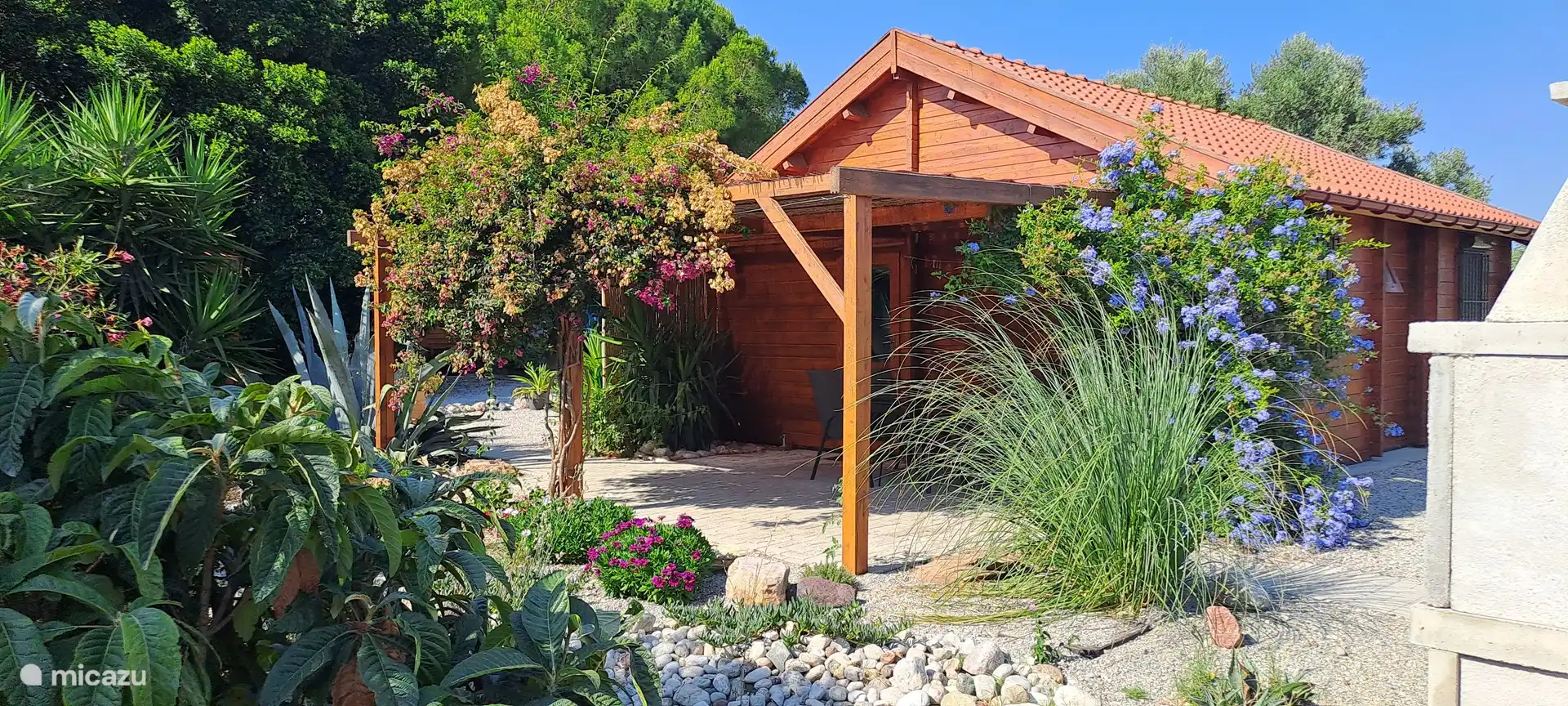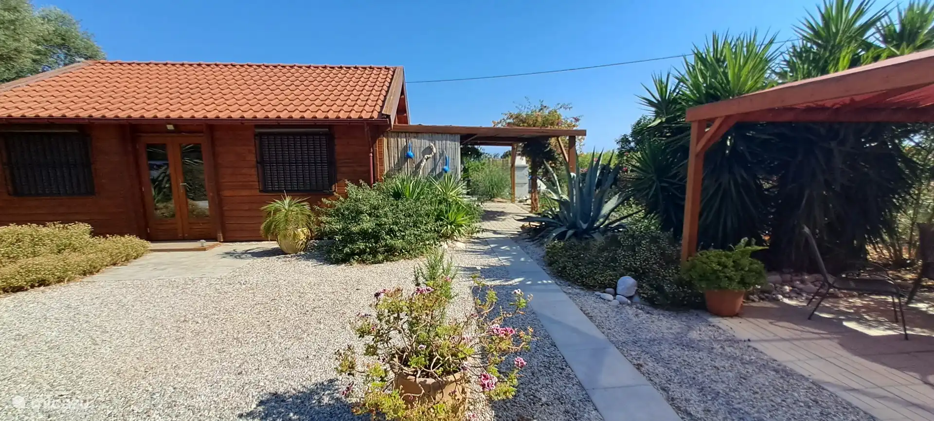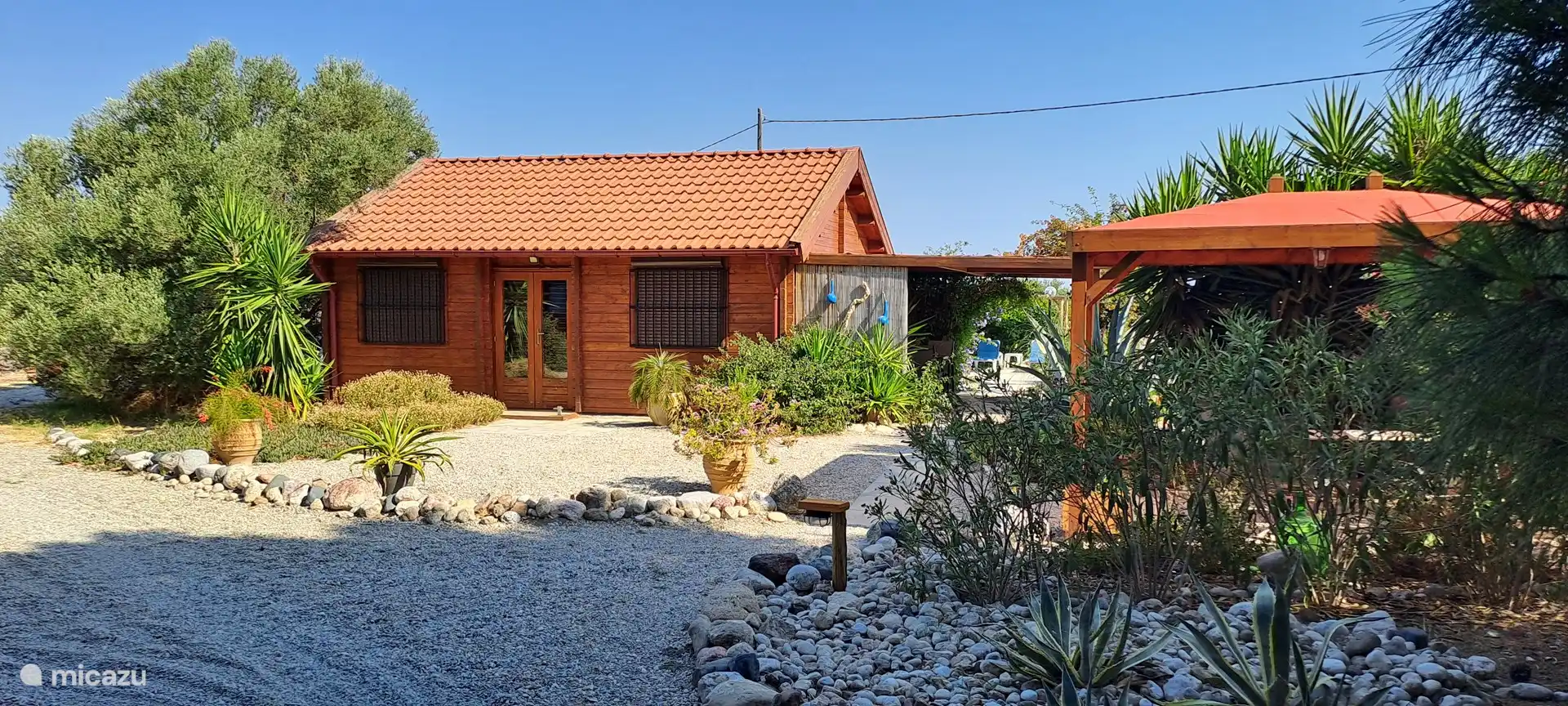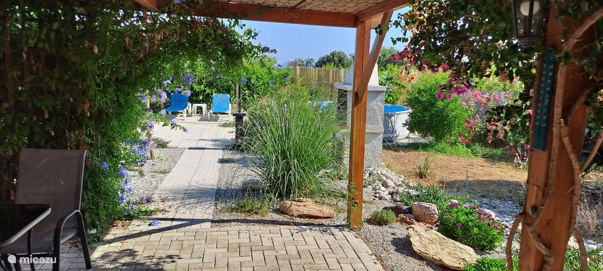 Opening the metal door to the courtyard everyone gets a smile to their face. You see a stair up to the roof terraces and a beautiful pattern pebble floor.. A few steps in you pass the outside bathroom and see the dining area with a big barbecue especially built for kontosouvli (meat that is put on a 2 meter long metal pole and grilled rotating slow for 2 hours.. Absolutely amazing!).
