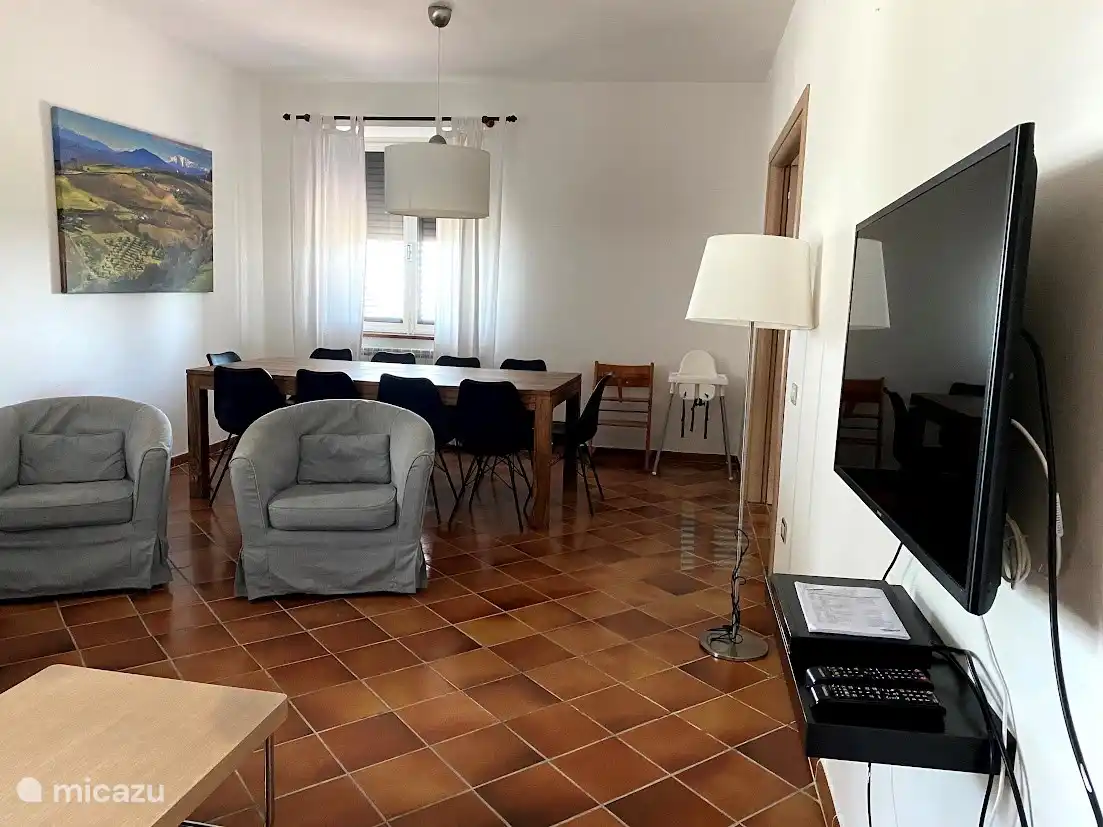 - Living room with spacious dining table, sofas, TV with DVD player;