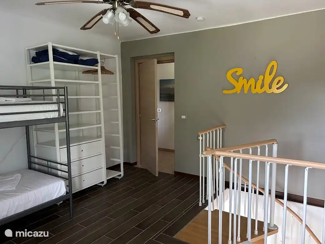 - 1 bedroom with 1 bunk bed and single bed, total for 3 people. Past this room you also take the stairs to the ground floor.