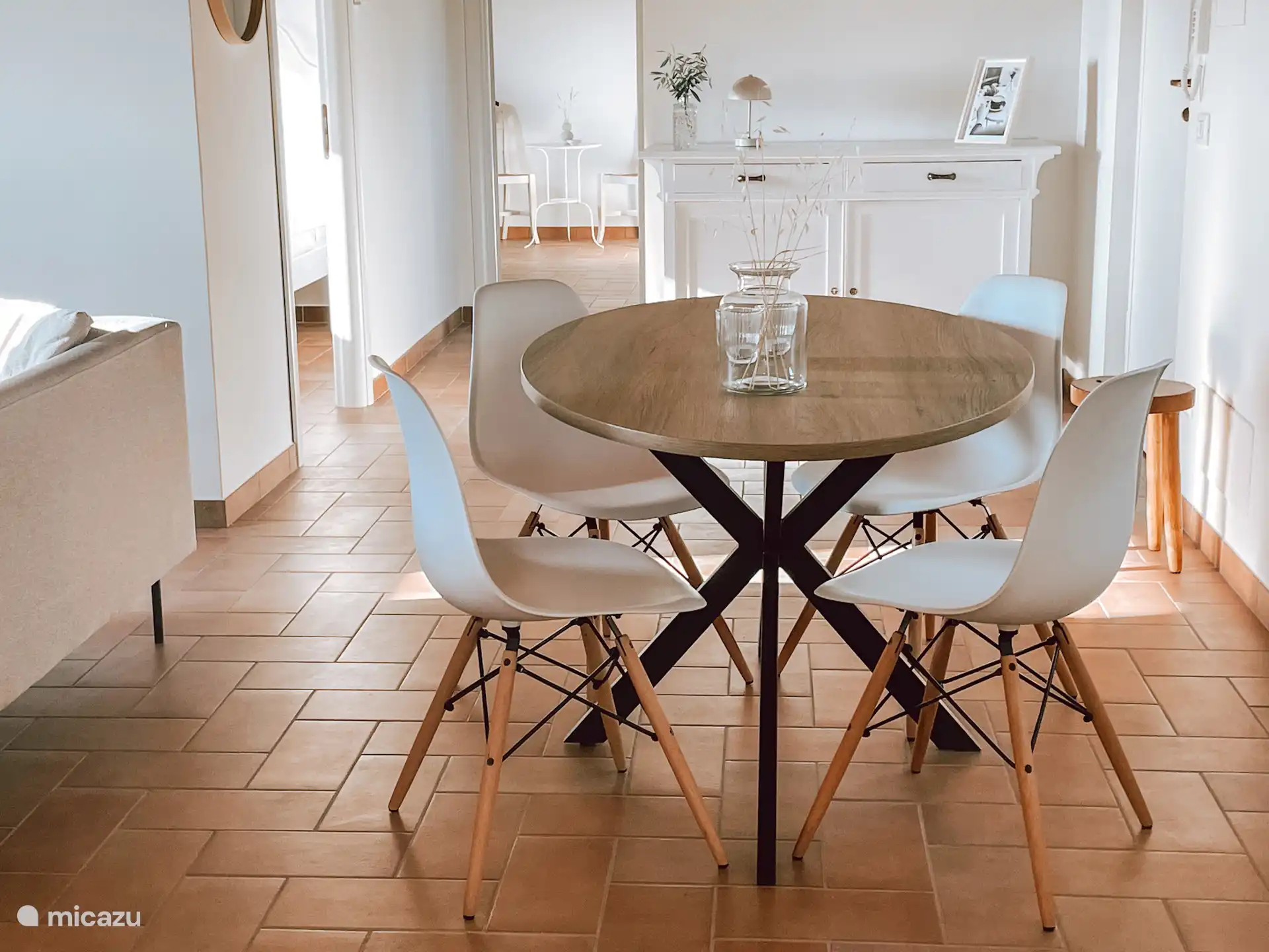 Through the hall you enter a spacious living room with patio doors to the portico (veranda). The room has a spacious sofa with chaise longue, an armchair and a dining table for 6 people. The kitchen is equipped with a fridge and freezer, dishwasher, Jura coffee maker, convection oven and kettle. Under the fantastic portico you can have hours, have a drink, dinner or enjoy the setting (or rising) sun.
