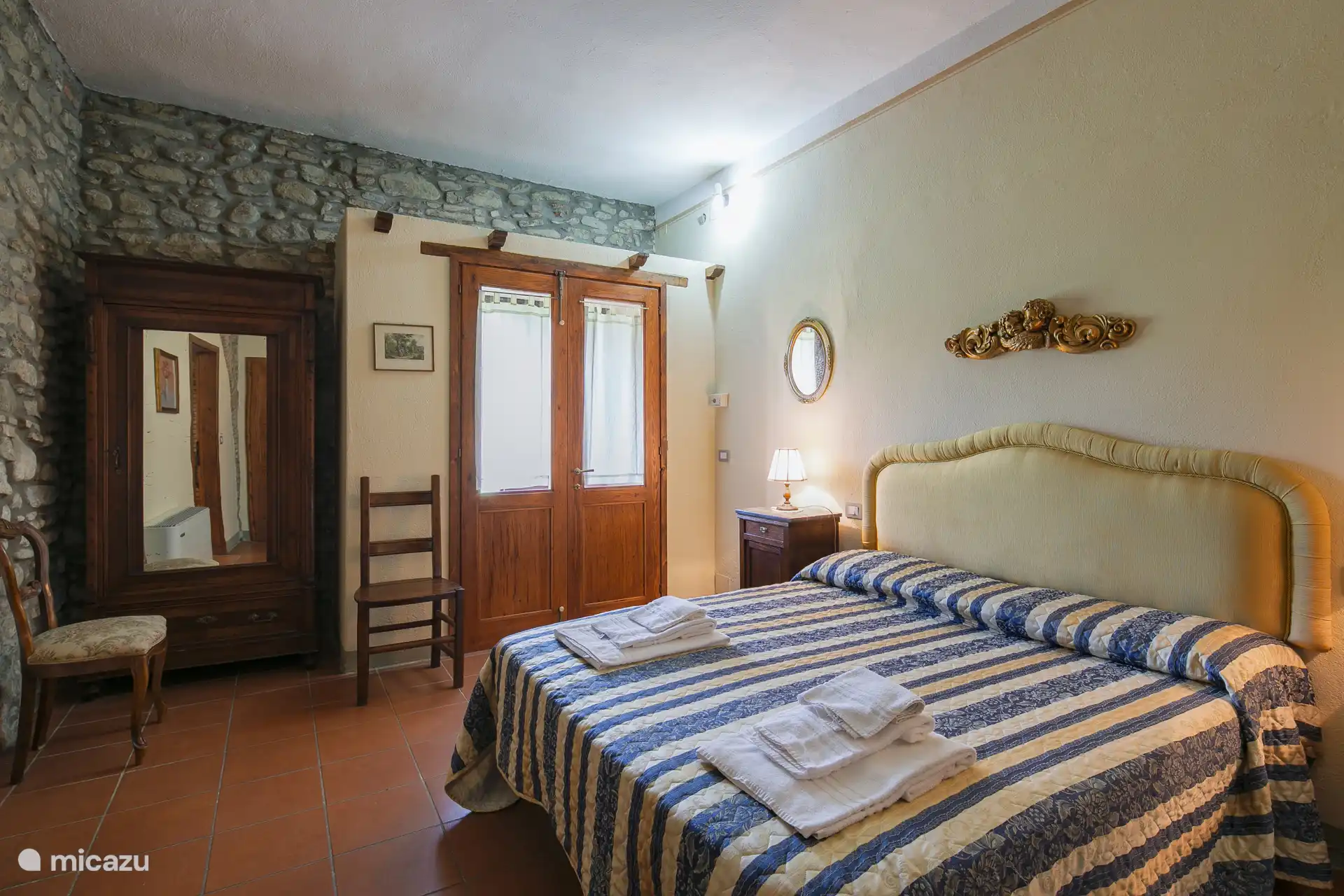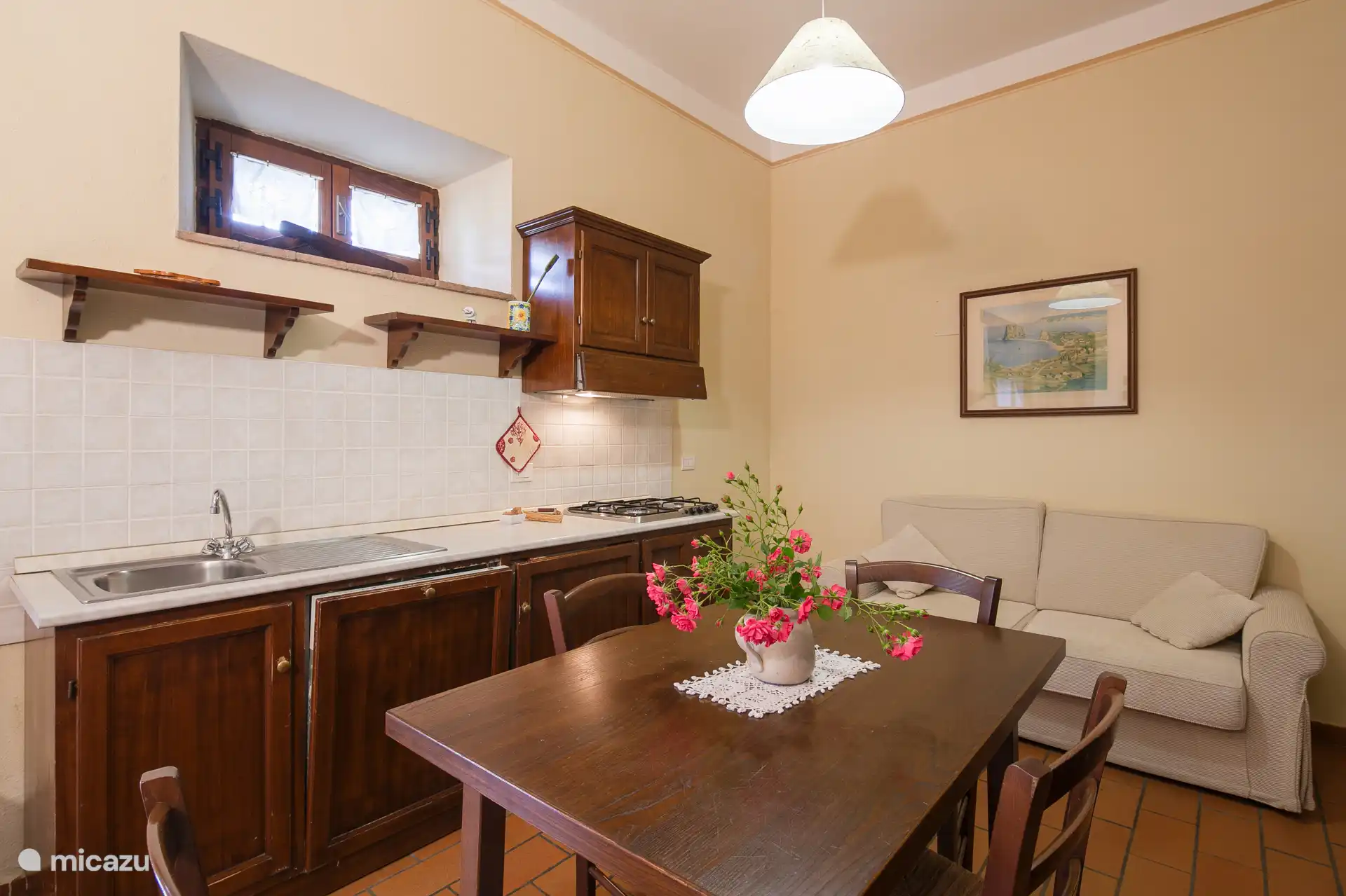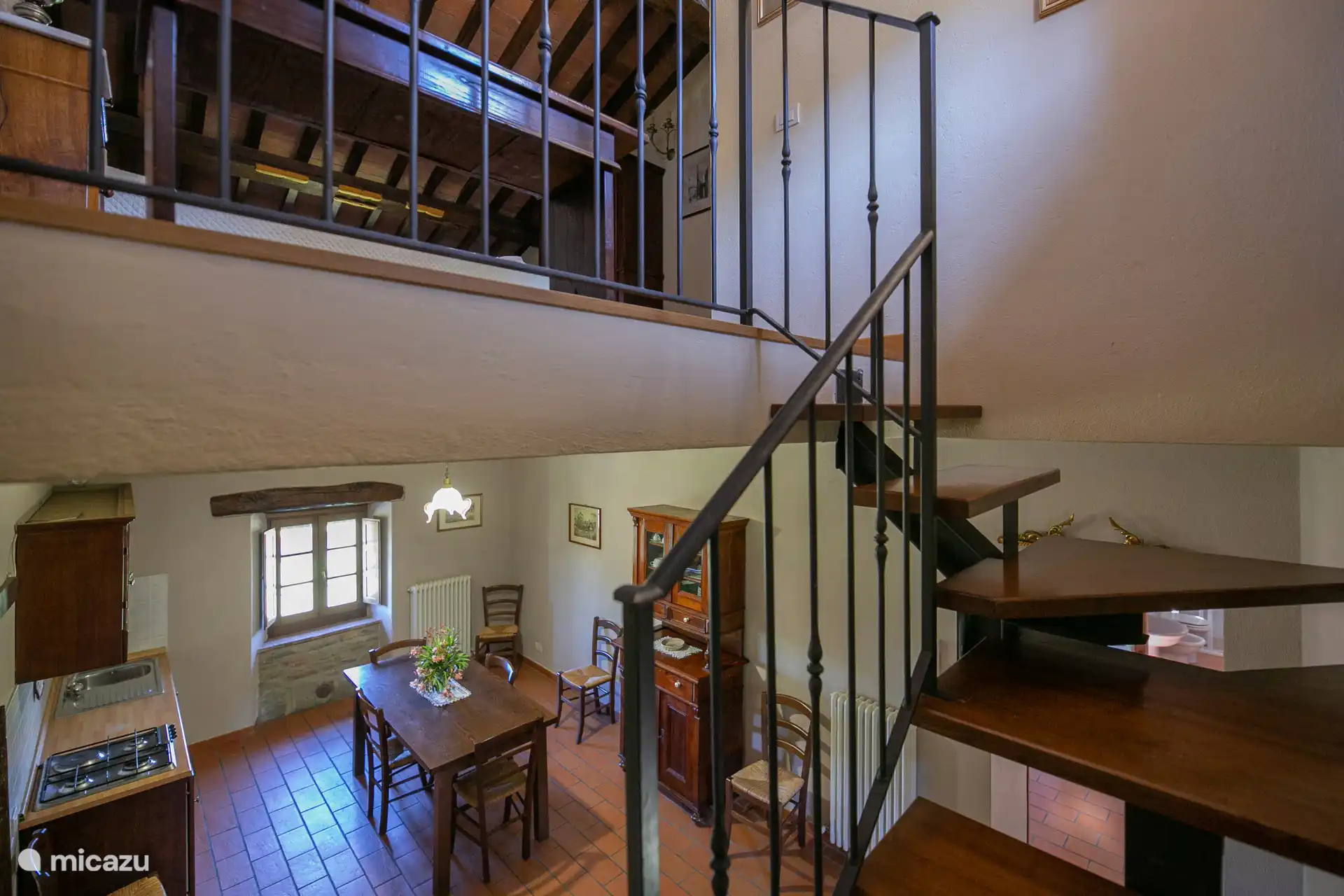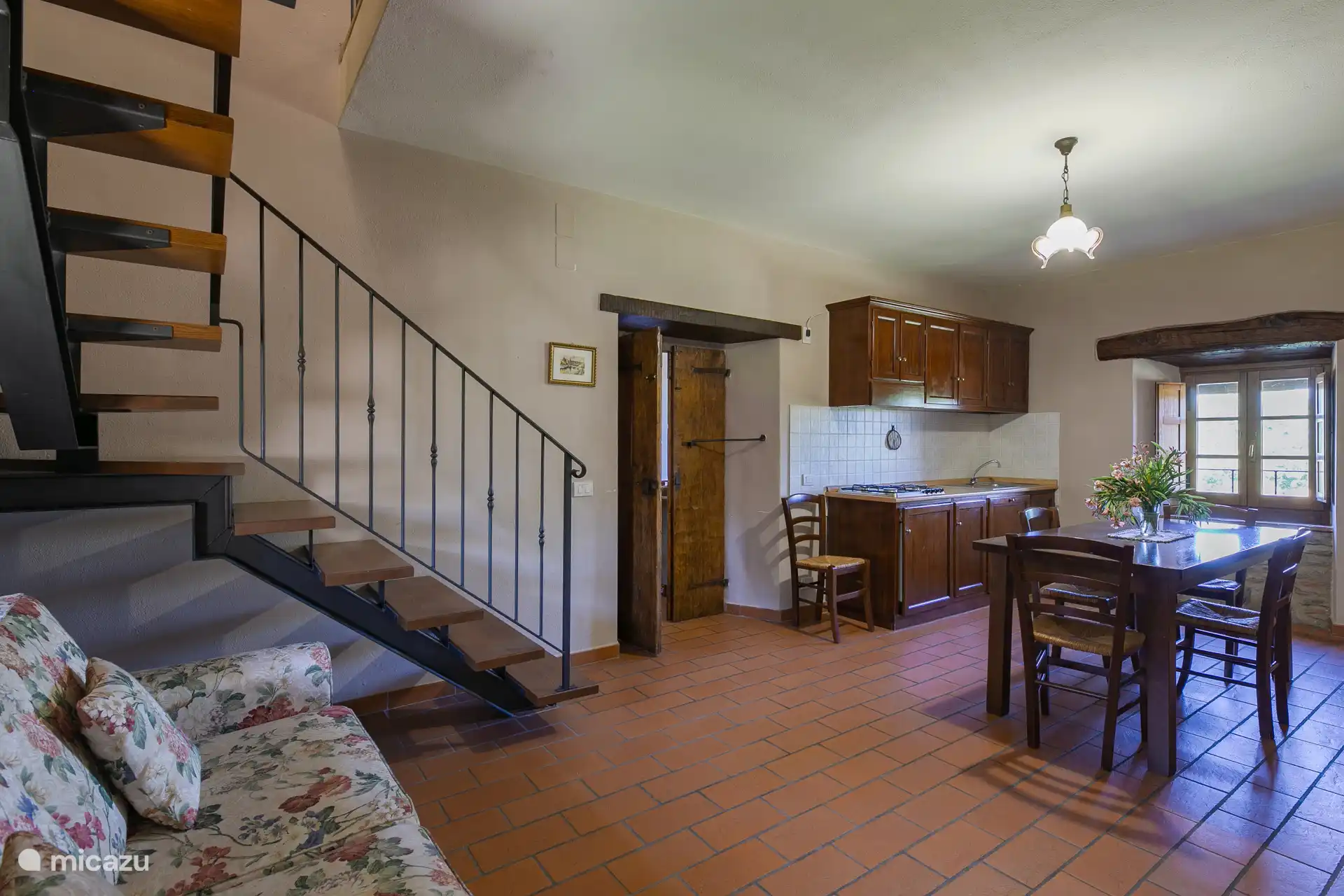 The external stone staircase leads to the first floor of the villa: here from the entrance you are in the living area, which is also equipped with a kitchen and dining table as well as living room with fireplace and satellite TV.