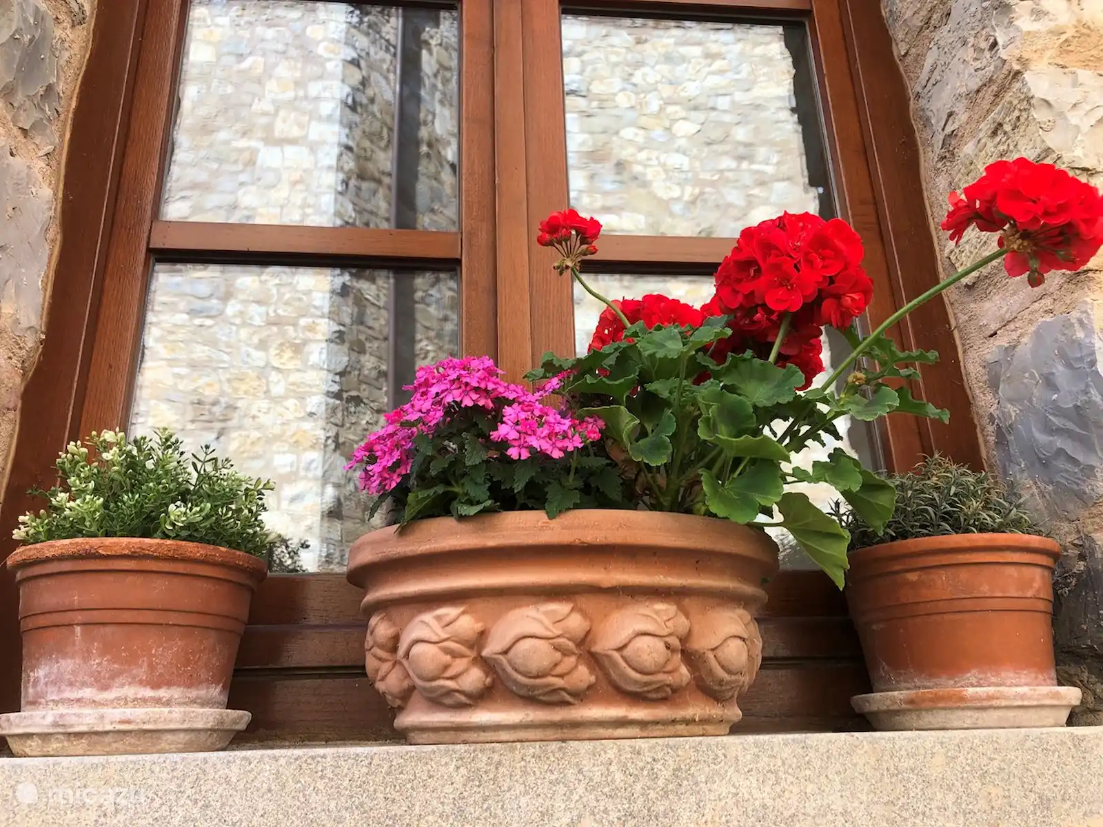 The best thing about our own house is the large terrace, on which you live from April to October. Here is a beautiful wrought iron/natural stone dining area, two sun loungers, parasols and planters.