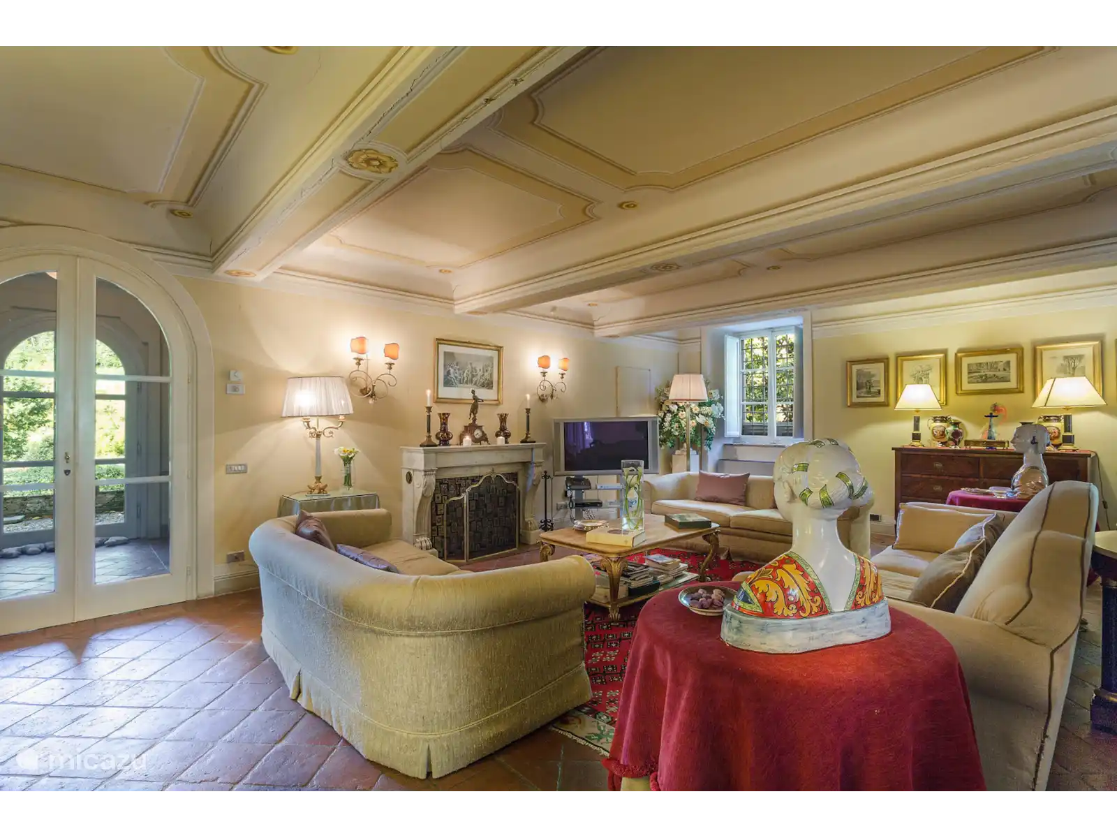 Inside the villa there are several floors of elegant living spaces full of light, art and history. The ground floor welcomes guests with a large sitting room, a formal dining room for up to 14 guests and a fully equipped kitchen with a wood-fired pizza oven, oven, microwave, dishwasher, fridge freezer and a Nespresso coffee machine. Additional dining areas and a cozy lounge with fireplace complete the common areas.