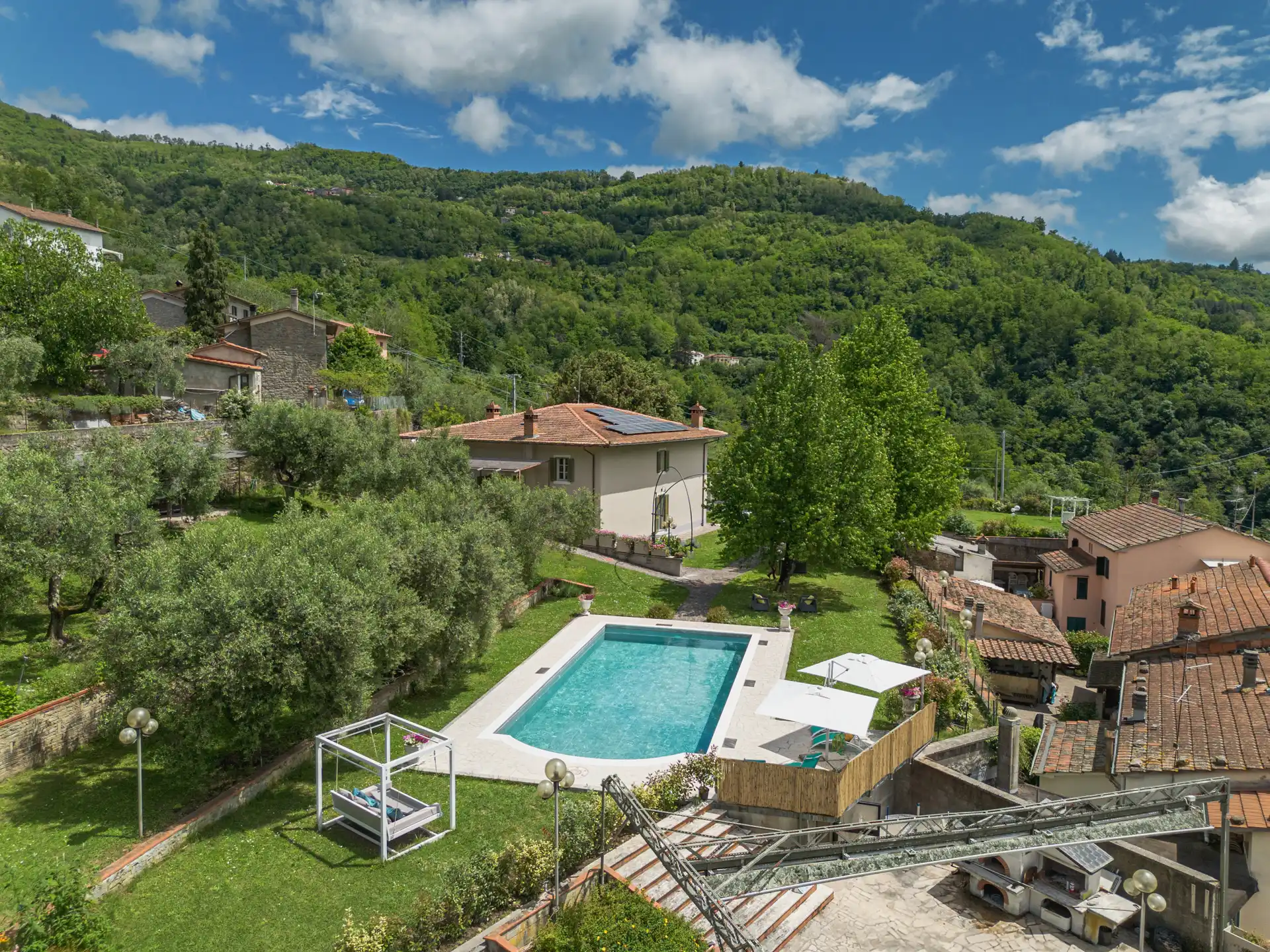 To the left of the villa is the garden with classic Tuscan terraces planted with olive trees, offering a peaceful and panoramic setting. The fully enclosed garden surrounding the house ensures privacy, with a beautiful fountain welcoming guests at the entrance. A barbecue area with a large stone table is accessible via a staircase with 10 steps, ideal for outdoor dining.