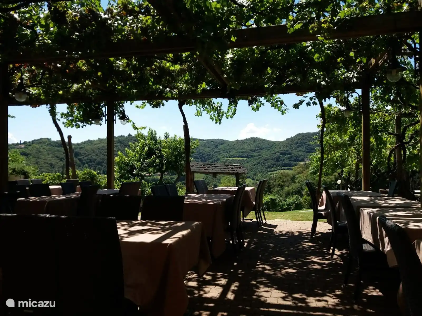 The house (a 'casa di corte') is located at an altitude of about 250 meters in a beautiful green hilly area, the Colli Berici. Due to the high altitude, it is a lot more pleasant in the summer than down in the valley, it is always a few degrees cooler. Due to the thick walls, the house has a kind of natural air conditioning. There is a spacious living room of 30 square meters, with a cool tiled floor, with a large fireplace and wood stove. Then there is a utility room and a practical kitchen. The kitchen is basic, but everything you need is there. There is a large refrigerator, oven, stove, washing machine, Nespresso machine, microwave and kettle.