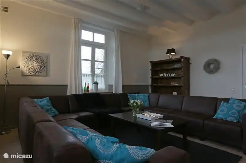 The very spacious living room has an authentic high ceiling with beams and many windows overlooking the garden. The living room is attractively furnished with a modern large corner sofa, a TV and radio-CD player. WI-FI is also available.