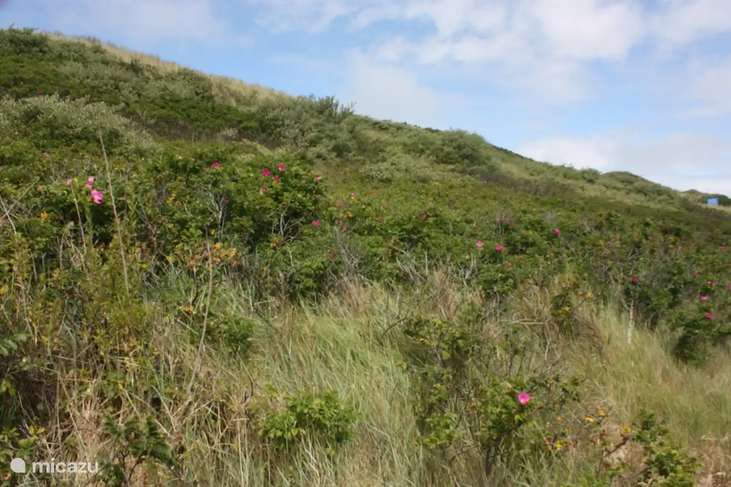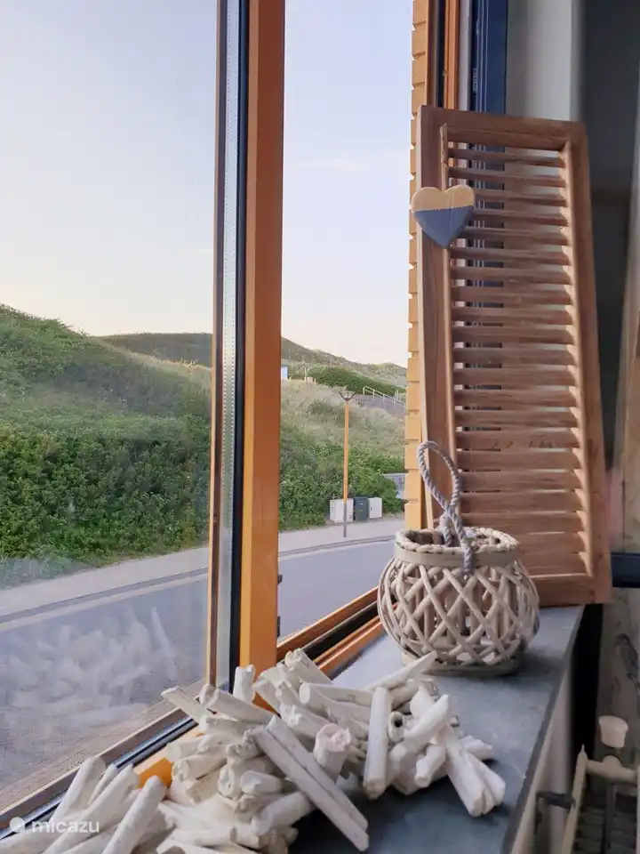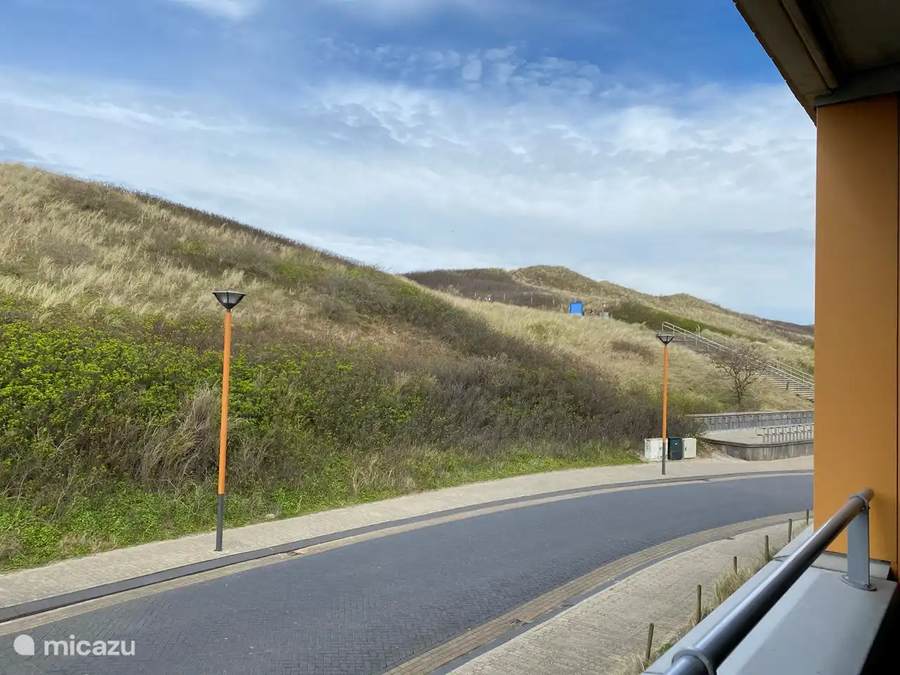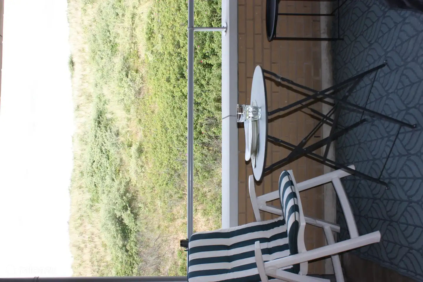 Covered balcony terrace - dry when it rains - with rugs, chairs with cushions, table and lounge sofa. View of dunes. The sun is on the balcony from noon to sunset.